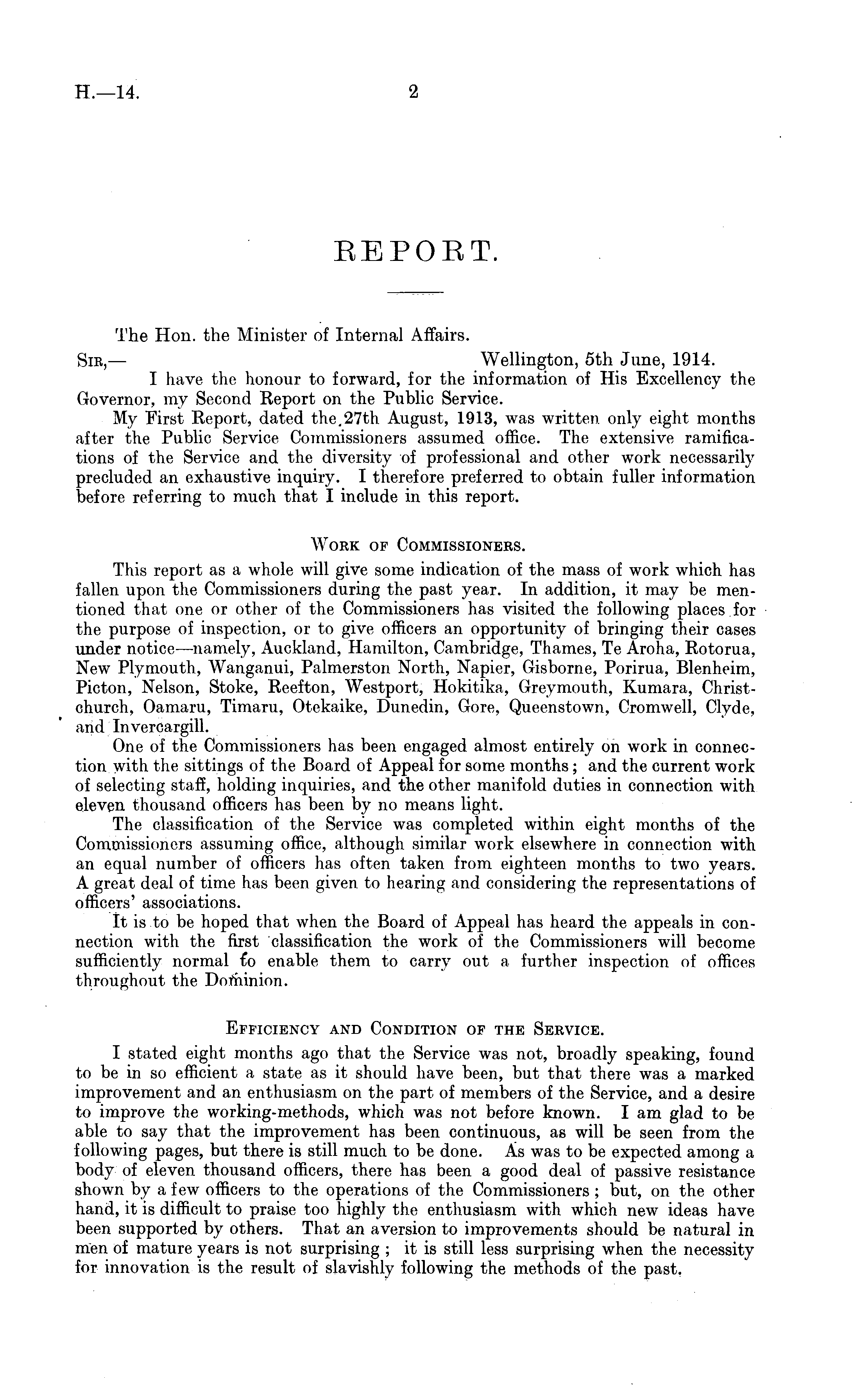 REPORT. The Hon. the Minister of Internal Affairs. Sir,— Wellington, sth June, 1914. I have the honour to forward, for the information of His Excellency the Governor, my Second Report on the Public Service. My First Report, dated the,27th August, 1913, was written only eight months after the Public Service Commissioners assumed office. The extensive ramifications of the Service and the diversity of professional and other work necessarily precluded an exhaustive inquiry. I therefore preferred to obtain fuller information before referring to much that I include in this report. Work of Commissioners. This report as a whole will give some indication of the mass of work which has fallen upon the Commissioners during the past year. In addition, it may be mentioned that one or other of the Commissioners has visited the following places for the purpose of inspection, or to give officers an opportunity of bringing their cases under notice —namely, Auckland, Hamilton, Cambridge, Thames, Te Aroha, Rotorua, New Plymouth, Wanganui, Palmerston North, Napier, Gisborne, Porirua, Blenheim, Picton, Nelson, Stoke, Reefton, Westport, Hokitika, Greymouth, Kumara, Christchurch, Oamaru, Timaru, Otekaike, Dunedin, Gore, Queenstown, Cromwell, Clyde, and Invercargill. One of the Commissioners has been engaged almost entirely on work in connection with the sittings of the Board of Appeal for some months; and the current work of selecting staff, holding inquiries, and the other manifold duties in connection with eleven thousand officers has been by no means light. The classification of the Service was completed within eight months of the Commissioners assuming office, although similar work elsewhere in connection with an equal number of officers has often taken from eighteen months to two years. A great deal of time has been given to hearing and considering the representations of officers' associations. It is to be hoped that when the Board of Appeal has heard the appeals in connection with the first classification the work of the Commissioners will become sufficiently normal £o enable them to carry out a further inspection of offices throughout the Dominion. Efficiency and Condition of the Service. I stated eight months ago that the Service was not, broadly speaking, found to be in so efficient a state as it should have been, but that there was a marked improvement and an enthusiasm on the part of members of the Service, and a desire to improve the working-methods, which was not before known. lam glad to be able to say that the improvement has been continuous, as will be seen from the following pages, but there is still much to be done. As was to be expected among a body of eleven thousand officers, there has been a good deal of passive resistance shown by a few officers to the operations of the Commissioners ; but, on the other hand, it is difficult to praise too highly the enthusiasm with which new ideas have been supported by others. That an aversion to improvements should be natural in men of mature years is not surprising ; it is still less surprising when the necessity for innovation is the result of slavishly following the methods of the past.
