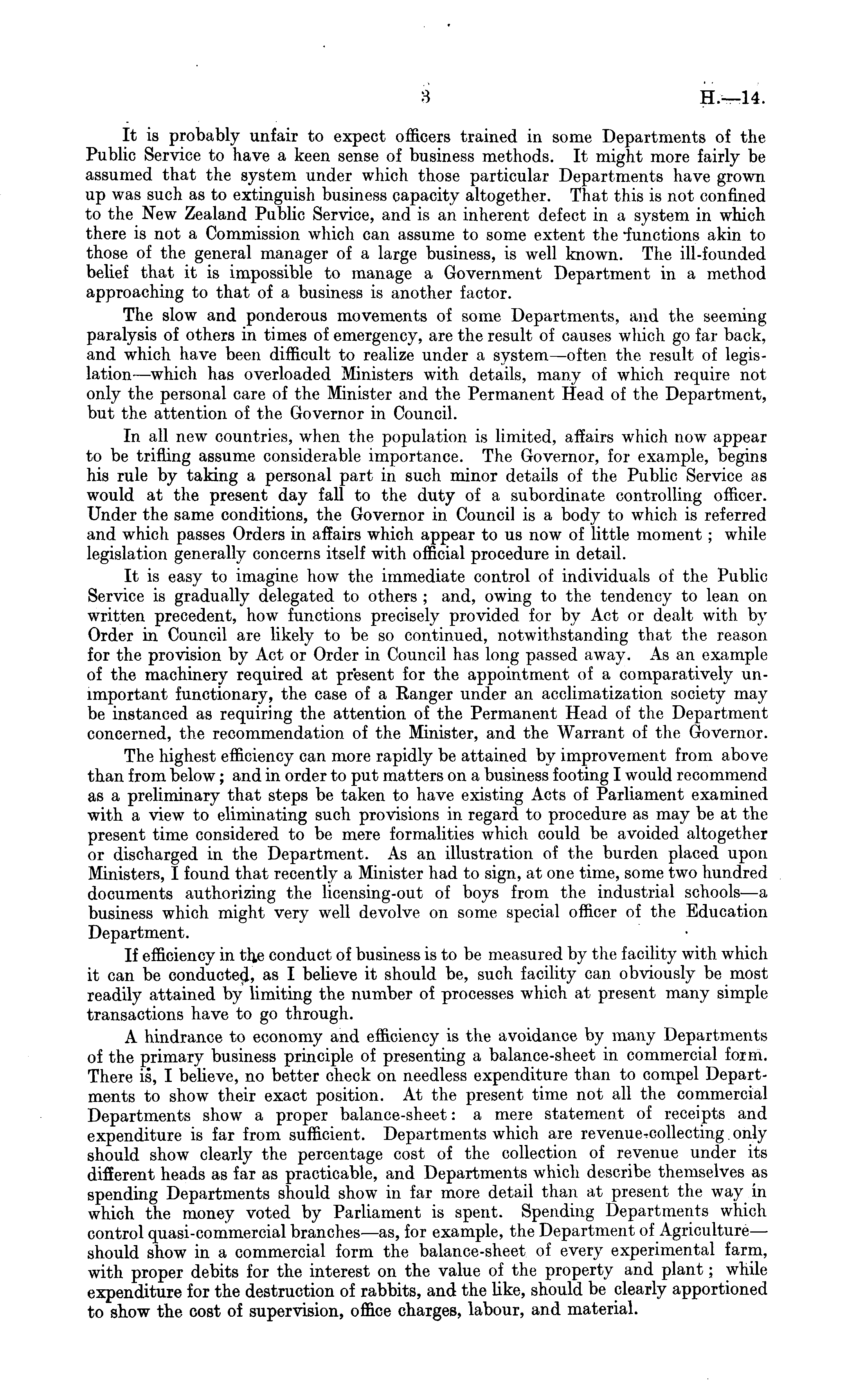It is probably unfair to expect officers trained in some Departments of the Public Service to have a keen sense of business methods. It might more fairly be assumed that the system under which those particular Departments have grown up was such as to extinguish business capacity altogether. That this is not confined to the New Zealand Public Service, and is an inherent defect in a system in which there is not a Commission which can assume to some extent the -functions akin to those of the general manager of a large business, is well known. The ill-founded belief that it is impossible to manage a Government Department in a method approaching to that of a business is another factor. The slow and ponderous movements of some Departments, and the seeming paralysis of others in times of emergency, are the result of causes which go far back, and which have been difficult to realize under a system —often the result of legislation—which has overloaded Ministers with details, many of which require not only the personal care of the Minister and the Permanent Head of the Department, but the attention of the Governor in Council. In all new countries, when the population is limited, affairs which now appear to be trifling assume considerable importance. The Governor, for example, begins his rule by taking a personal part in such minor details of the Public Service as would at the present day fall to the duty of a subordinate controlling officer. Under the same conditions, the Governor in Council is a body to which is referred and which passes Orders in affairs which appear to us now of little moment ; while legislation generally concerns itself with official procedure in detail. It is easy to imagine how the immediate control of individuals of the Public Service is gradually delegated to others ; and, owing to the tendency to lean on written precedent, how functions precisely provided for by Act or dealt with by Order in Council are likely to be so continued, notwithstanding that the reason for the provision by Act or Order in Council has long passed away. As an example of the machinery required at present for the appointment of a comparatively unimportant functionary, the case of a Ranger under an acclimatization society may be instanced as requiring the attention of the Permanent Head of the Department concerned, the recommendation of the Minister, and the Warrant of the Governor. The highest efficiency can more rapidly be attained by improvement from above than from below; and in order to put matters on a business footing I would recommend as a preliminary that steps be taken to have existing Acts of Parliament examined with a view to eliminating such provisions in regard to procedure as may be at the present time considered to be mere formalities which could be avoided altogether or discharged in the Department. As an illustration of the burden placed upon Ministers, I found that recently a Minister had to sign, at one time, some two hundred documents authorizing the licensing-out of boys from the industrial schools—a business which might very well devolve on some special officer of the Education Department. If efficiency in th,e conduct of business is to be measured by the facility with which it can be conducted, as I believe it should be, such facility can obviously be most readily attained by limiting the number of processes which at present many simple transactions have to go through. A hindrance to economy and efficiency is the avoidance by many Departments of the primary business principle of presenting a balance-sheet in commercial form. There is, I believe, no better check on needless expenditure than to compel Departments to show their exact position. At the present time not all the commercial Departments show a proper balance-sheet: a mere statement of receipts and expenditure is far from sufficient. Departments which are revenueTCollecting only should show clearly the percentage cost of the collection of revenue under its different heads as far as practicable, and Departments which describe themselves as spending Departments should show in far more detail than at present the way in which the money voted by Parliament is spent. Spending Departments which control quasi-commercial branches—as, for example, the Department of Agriculture— should show in a commercial form the balance-sheet of every experimental farm, with proper debits for the interest on the value of the property and plant; while expenditure for the destruction of rabbits, and the like, should be clearly apportioned to show the cost of supervision, office charges, labour, and material.