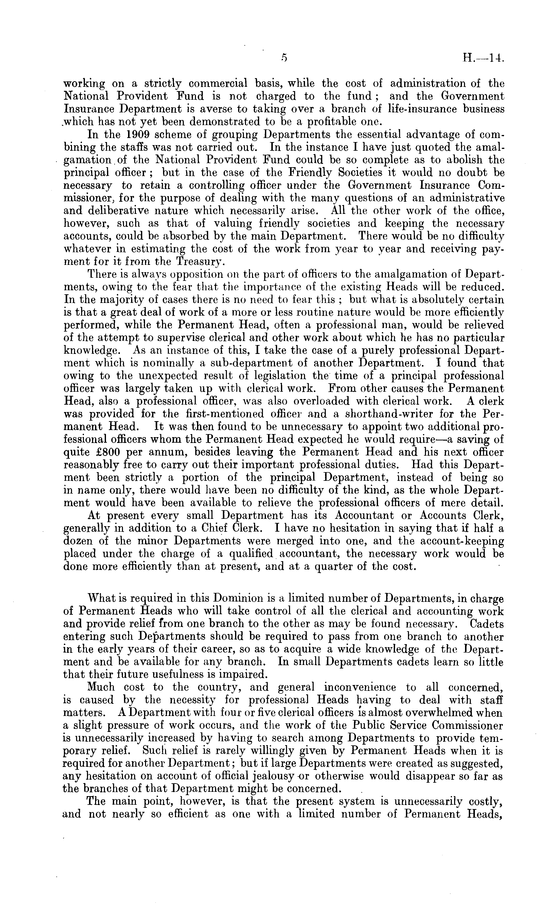 working on a strictly commercial basis, while the cost of administration of the National Provident Fund is not charged to the fund ; and the Government Insurance Department is averse to taking over a branch of life-insurance business .which has not yet been demonstrated to be a profitable one. In the 1909 scheme of grouping Departments the essential advantage of combining the staffs was not carried out. In the instance I have just quoted the amalgamation, of the National Provident Fund could be so complete as to abolish the principal officer ; but in the case of the Friendly Societies it would no doubt be necessary to retain a controlling officer under the Government Insurance Commissioner, for the purpose of dealing with the many questions of an administrative and deliberative nature which necessarily arise. All the other work of the office, however, such as that of valuing friendly societies and keeping the necessary accounts, could be absorbed by the main Department. There would be no difficulty whatever in estimating the cost of the work from year to year and receiving payment for it from the Treasury. There is always opposition on the part of officers to the amalgamation of Departments, owing to the fear that the importance of the existing Heads will be reduced. In the majority of cases there is no need to fear this ; but what is absolutely certain is that a great deal of work of a more or less routine nature would be more efficiently performed, while the Permanent Head, often a professional man, would be relieved of the attempt to supervise clerical and other work about which he has no particular knowledge. As an instance of this, I take the case of a purely professional Department which is nominally a sub-department of another Department. I found that owing to the unexpected result of legislation the time of a principal professional officer was largely taken up with clerical work. From other causes the Permanent Head, also a professional officer, was also overloaded with clerical work. A clerk was provided for the first-mentioned officer and a shorthand-writer for the Permanent Head. It was then found to be unnecessary to appoint two additional professional officers whom the Permanent Head expected he would require—a saving of quite £800 per annum, besides leaving the Permanent Head and his next officer reasonably free to carry out their important professional duties. Had this Department been strictly a portion of the principal Department, instead of being so in name only, there would have been no difficulty of the kind, as the whole Department would have been available to relieve the professional officers of mere detail. At present every small Department has its Accountant or Accounts Clerk, generally in addition to a Chief Clerk. I have no hesitation in saying that if half a dozen of the minor Departments were merged into one, and the account-keeping placed under the charge of a qualified accountant, the necessary work would be done more efficiently than at present, and at a quarter of the cost. What is required in this Dominion is a limited number of Departments, in charge of Permanent Heads who will take control of all the clerical and accounting work and provide relief from one branch to the other as may be found necessary. Cadets entering such Departments should be required to pass from one branch to another in the early years of their career, so as to acquire a wide knowledge of the Department and be available for any branch. In small Departments cadets learn so little that their future usefulness is impaired. Much cost to the country, and general inconvenience to all concerned, is caused by the necessity for professional Heads having to deal with staff matters. A Department with four or five clerical officers is almost overwhelmed when a slight pressure of work occurs, and the work of the Public Service Commissioner is unnecessarily increased by having to search among Departments to provide temporary relief. Such relief is rarely willingly given by Permanent Heads when it is required for another Department; but if large Departments were created as suggested, any hesitation on account of official jealousy or otherwise would disappear so far as the branches of that Department might be concerned. The main point, however, is that the present system is unnecessarily costly, and not nearly so efficient as one with a limited number of Permanent Heads,