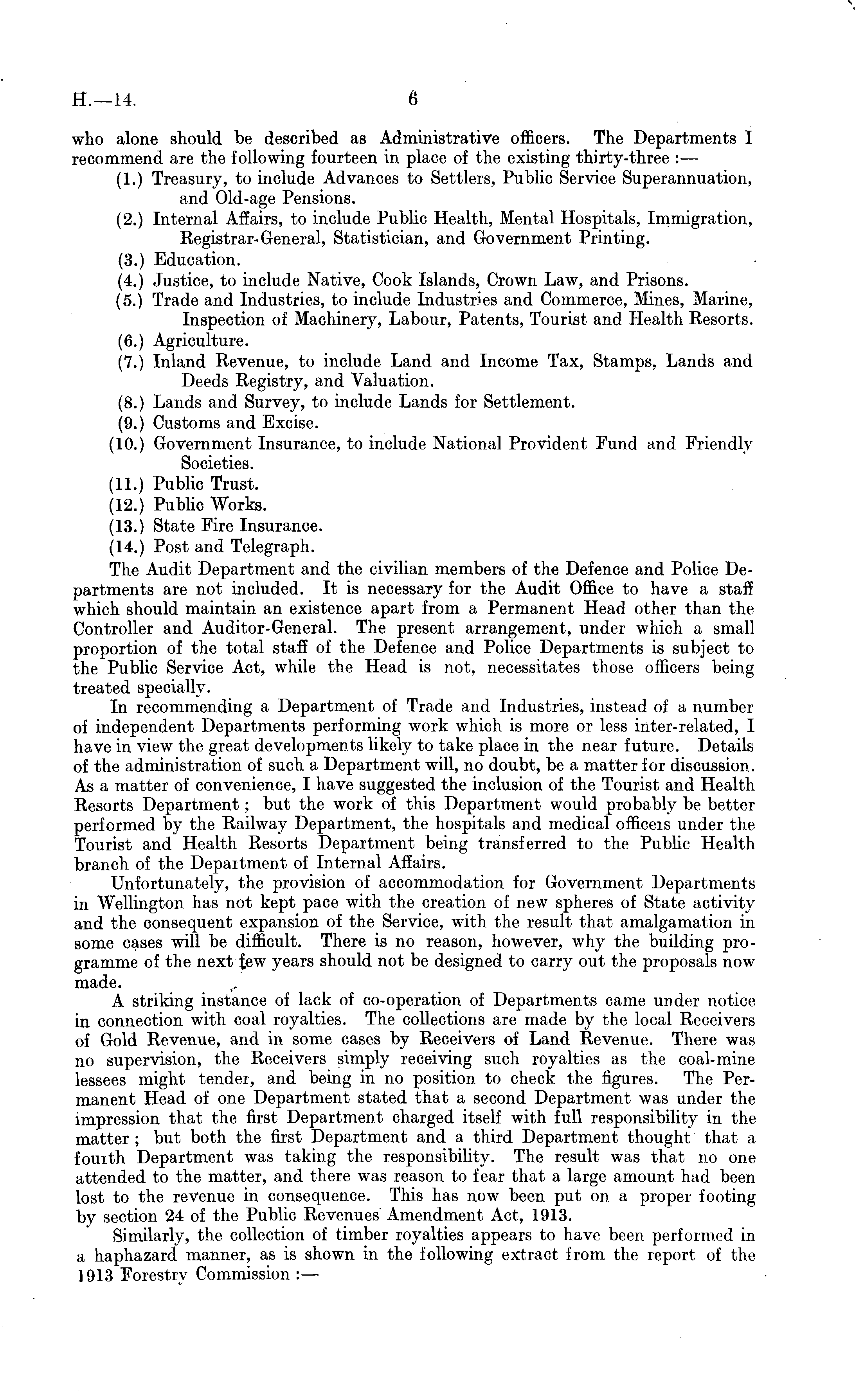 who alone should be described as Administrative officers. The Departments I recommend are the following fourteen in place of the existing thirty-three :— (1.) Treasury, to include Advances to Settlers, Public Service Superannuation, and Old-age Pensions. (2.) Internal Affairs, to include Public Health, Mental Hospitals, Immigration, Registrar-General, Statistician, and Government Printing. (3.) Education. (4.) Justice, to include Native, Cook Islands, Crown Law, and Prisons. (5.) Trade and Industries, to include Industries and Commerce, Mines, Marine, Inspection of Machinery, Labour, Patents, Tourist and Health Resorts. (6.) Agriculture. (7.) Inland Revenue, to include Land and Income Tax, Stamps, Lands and Deeds Registry, and Valuation. (8.) Lands and Survey, to include Lands for Settlement. (9.) Customs and Excise. (10.) Government Insurance, to include National Provident Fund and Friendly Societies. (11.) Public Trust. (12.) Public Works. (13.) State Fire Insurance. (14.) Post and Telegraph. The Audit Department and the civilian members of the Defence and Police Departments are not included. It is necessary for the Audit Office to have a staff which should maintain an existence apart from a Permanent Head other than the Controller and Auditor-General. The present arrangement, under which a small proportion of the total staff of the Defence and Police Departments is subject to the Public Service Act, while the Head is not, necessitates those officers being treated specially. In recommending a Department of Trade and Industries, instead of a number of independent Departments performing work which is more or less inter-related, I have in view the great developments likely to take place in the near future. Details of the administration of such a Department will, no doubt, be a matter for discussion. As a matter of convenience, I have suggested the inclusion of the Tourist and Health Resorts Department; but the work of this Department would probably be better performed by the Railway Department, the hospitals and medical officers under the Tourist and Health Resorts Department being transferred to the Public Health branch of the Depaitment of Internal Affairs. Unfortunately, the provision of accommodation for Government Departments in Wellington has not kept pace with the creation of new spheres of State activity and the consequent expansion of the Service, with the result that amalgamation in some cases will be difficult. There is no reason, however, why the building programme of the next iew years should not be designed to carry out the proposals now made. A striking instance of lack of co-operation of Departments came under notice in connection with coal royalties. The collections are made by the local Receivers of Gold Revenue, and in some cases by Receivers of Land Revenue. There was no supervision, the Receivers simply receiving such royalties as the coal-mine lessees might tender, and being in no position to check the figures. The Permanent Head of one Department stated that a second Department was under the impression that the first Department charged itself with full responsibility in the matter ; but both the first Department and a third Department thought that a fourth Department was taking the responsibility. The result was that no one attended to the matter, and there was reason to fear that a large amount had been lost to the revenue in consequence. This has now been put on a proper footing by section 24 of the Public Revenues' Amendment Act, 1913. Similarly, the collection of timber royalties appears to have been performed in a haphazard manner, as is shown in the following extract from the report of the 1913 Forestry Commission : —