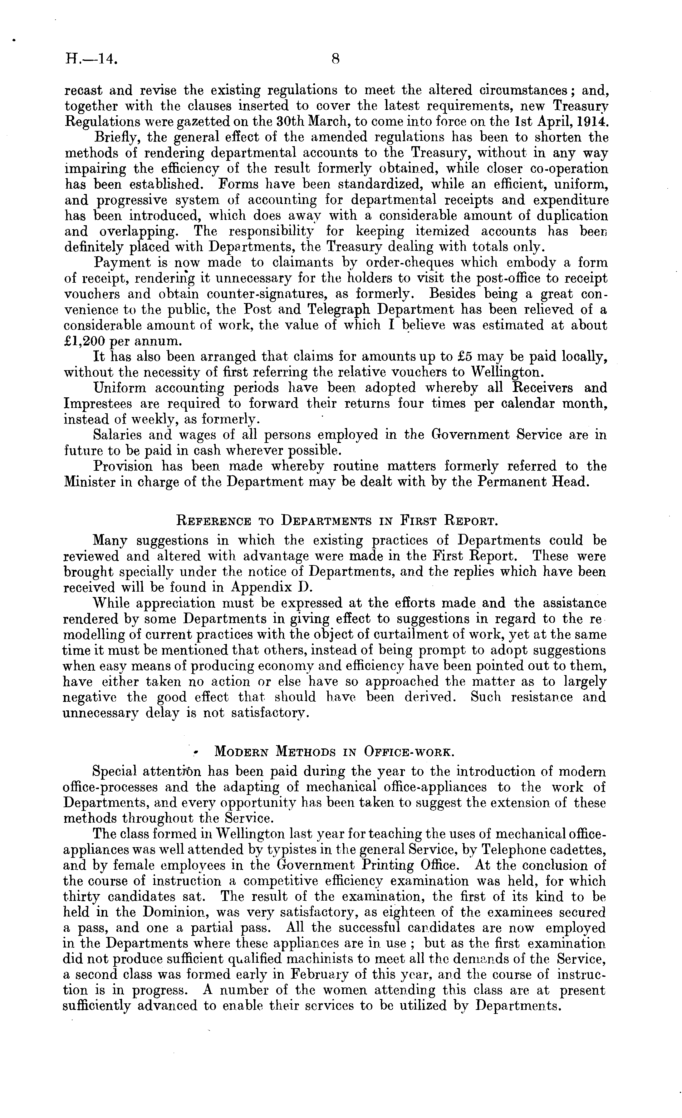 recast and revise the existing regulations to meet the altered circumstances; and, together with the clauses inserted to cover the latest requirements, new Treasury Regulations were gazetted on the 30th March, to come into force on the Ist April, 1914. Briefly, the general effect of the amended regulations has been to shorten the methods of rendering departmental accounts to the Treasury, without in any way impairing the efficiency of the result formerly obtained, while closer co-operation has been established. Forms have been standardized, while an efficient, uniform, and progressive system of accounting for departmental receipts and expenditure has been introduced, which does away with a considerable amount of duplication and overlapping. The responsibility for keeping itemized accounts has beer, definitely placed with Departments, the Treasury dealing with totals only. Payment is now made to claimants by order-cheques which embody a form of receipt, rendering it unnecessary for the holders to visit the post-office to receipt vouchers and obtain counter-signatures, as formerly. Besides being a great convenience to the public, the Post and Telegraph Department has been relieved of a considerable amount of work, the value of which I believe was estimated at about £1,200 per annum. It has also been arranged that claims for amounts up to £5 may be paid locally, without the necessity of first referring the relative vouchers to Wellington. Uniform accounting periods have been adopted whereby all Receivers and Imprestees are required to forward their returns four times per calendar month, instead of weekly, as formerly. Salaries and wages of all persons employed in the Government Service are in future to be paid in cash wherever possible. Provision has been made whereby routine matters formerly referred to the Minister in charge of the Department may be dealt with by the Permanent Head. Reference to Departments in First Report. Many suggestions in which the existing practices of Departments could be reviewed and altered with advantage were made in the First Report. These were brought specially under the notice of Departments, and the replies which have been received will be found in Appendix 1). While appreciation must be expressed at the efforts made and the assistance rendered by some Departments in giving effect to suggestions in regard to the re modelling of current practices with the object of curtailment of work, yet at the same time it must be mentioned that others, instead of being prompt to adopt suggestions when easy means of producing economy and efficiency have been pointed out to them, have either taken no action or else have so approached the matter as to largely negative the good effect that should have been derived. Such resistance and unnecessary delay is not satisfactory. - Modern Methods in Office-work. Special attention has been paid during the year to the introduction of modern office-processes and the adapting of mechanical office-appliances to the work of Departments, and every opportunity has been taken to suggest the extension of these methods throughout the Service. The class formed in Wellington last year for teaching the uses of mechanical officeappliances was well attended by typistes in the general Service, by Telephone cadettes, and by female employees in the Government Printing Office. At the conclusion of the course of instruction a competitive efficiency examination was held, for which thirty candidates sat. The result of the examination, the first of its kind to be held in the Dominion, was very satisfactory, as eighteen of the examinees secured a pass, and one a partial pass. All the successful candidates are now employed in the Departments where these appliances are in use ; but as the first examination did not produce sufficient qualified machinists to meet all the demands of the Service, a second class was formed early in February of this year, and the course of instruction is in progress. A number of the women attending this class are at present sufficiently advanced to enable their services to be utilized by Departments.