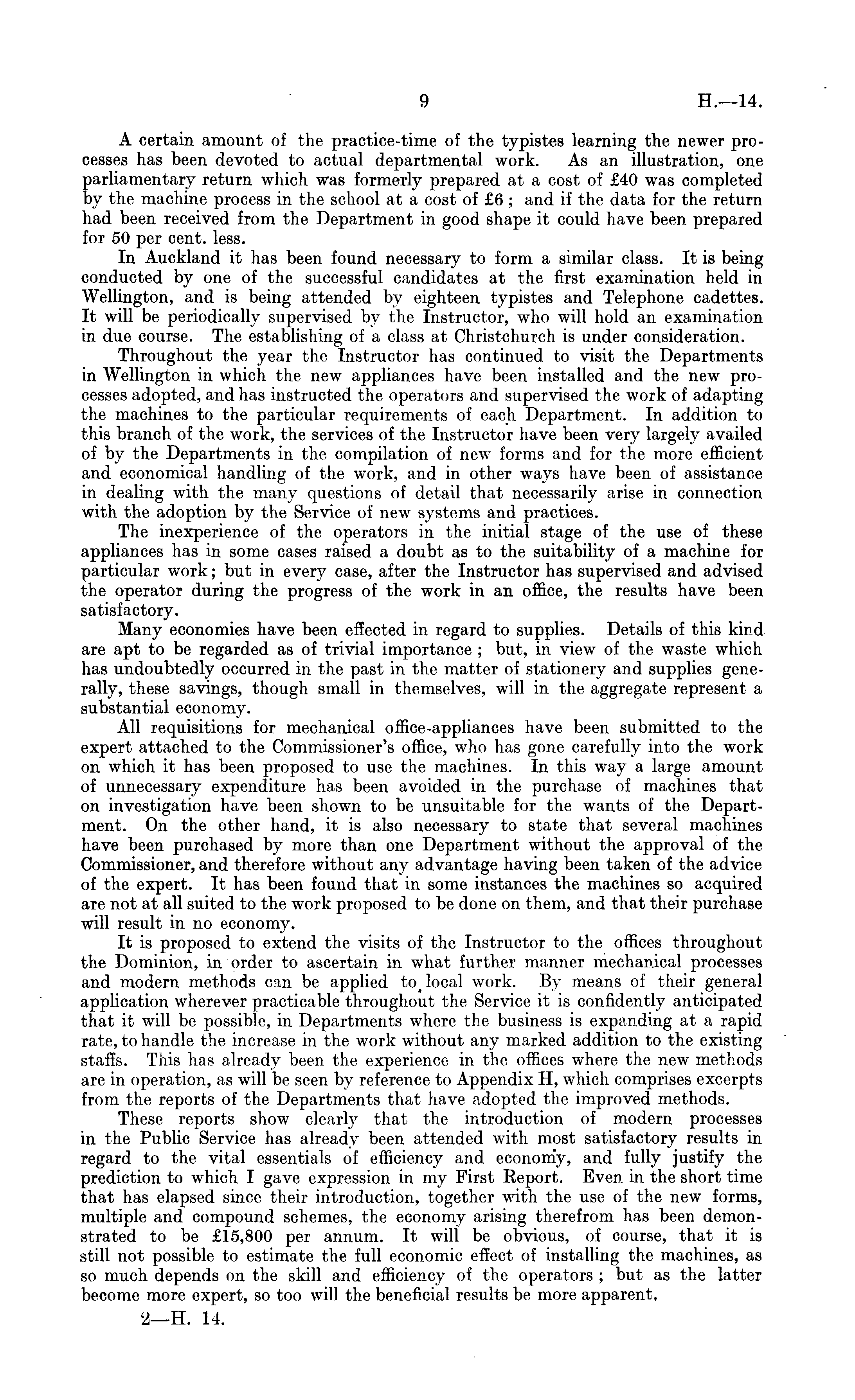 A certain amount of the practice-time of the typistes learning the newer processes has been devoted to actual departmental work. As an illustration, one parliamentary return which was formerly prepared at a cost of £40 was completed by the machine process in the school at a cost of £6 ; and if the data for the return had been received from the Department in good shape it could have been prepared for 50 per cent. less. In Auckland it has been found necessary to form a similar class. It is being conducted by one of the successful candidates at the first examination held in Wellington, and is being attended by eighteen typistes and Telephone cadettes. It will be periodically supervised by the Instructor, who will hold an examination in due course. The establishing of a class at Christchurch is under consideration. Throughout the year the Instructor has continued to visit the Departments in Wellington in which the new appliances have been installed and the new processes adopted, and has instructed the operators and supervised the work of adapting the machines to the particular requirements of each Department. In addition to this branch of the work, the services of the Instructor have been very largely availed of by the Departments in the compilation of new forms and for the more efficient and economical handling of the work, and in other ways have been of assistance in dealing with the many questions of detail that necessarily arise in connection with the adoption by the Service of new systems and practices. The inexperience of the operators in the initial stage of the use of these appliances has in some cases raised a doubt as to the suitability of a machine for particular work; but in every case, after the Instructor has supervised and advised the operator during the progress of the work in an office, the results have been satisfactory. Many economies have been effected in regard to supplies. Details of this kind are apt to be regarded as of trivial importance ; but, in view of the waste which has undoubtedly occurred in the past in the matter of stationery and supplies generally, these savings, though small in themselves, will in the aggregate represent a substantial economy. All requisitions for mechanical office-appliances have been submitted to the expert attached to the Commissioner's office, who has gone carefully into the work on which it has been proposed to use the machines. In this way a large amount of unnecessary expenditure has been avoided in the purchase of machines that on investigation have been shown to be unsuitable for the wants of the Department. On the other hand, it is also necessary to state that several machines have been purchased by more than one Department without the approval of the Commissioner, and therefore without any advantage having been taken of the advice of the expert. It has been found that in some instances the machines so acquired are not at all suited to the work proposed to be done on them, and that their purchase will result in no economy. It is proposed to extend the visits of the Instructor to the offices throughout the Dominion, in order to ascertain in what further manner mechanical processes and modern methods can be applied local work. By means of their general application wherever practicable throughout the Service it is confidently anticipated that it will be possible, in Departments where the business is expanding at a rapid rate, to handle the increase in the work without any marked addition to the existing staffs. This has already been the experience in the offices where the new methods are in operation, as will be seen by reference to Appendix H, which comprises excerpts from the reports of the Departments that have adopted the improved methods. These reports show clearly that the introduction of modern processes in the Public Service has already been attended with most satisfactory results in regard to the vital essentials of efficiency and economy, and fully justify the prediction to which I gave expression in my First Report. Even in the short time that has elapsed since their introduction, together with the use of the new forms, multiple and compound schemes, the economy arising therefrom has been demonstrated to be £15,800 per annum. It will be obvious, of course, that it is still not possible to estimate the full economic effect of installing the machines, as so much depends on the skill and efficiency of the operators ; but as the latter become more expert, so too will the beneficial results be more apparent.