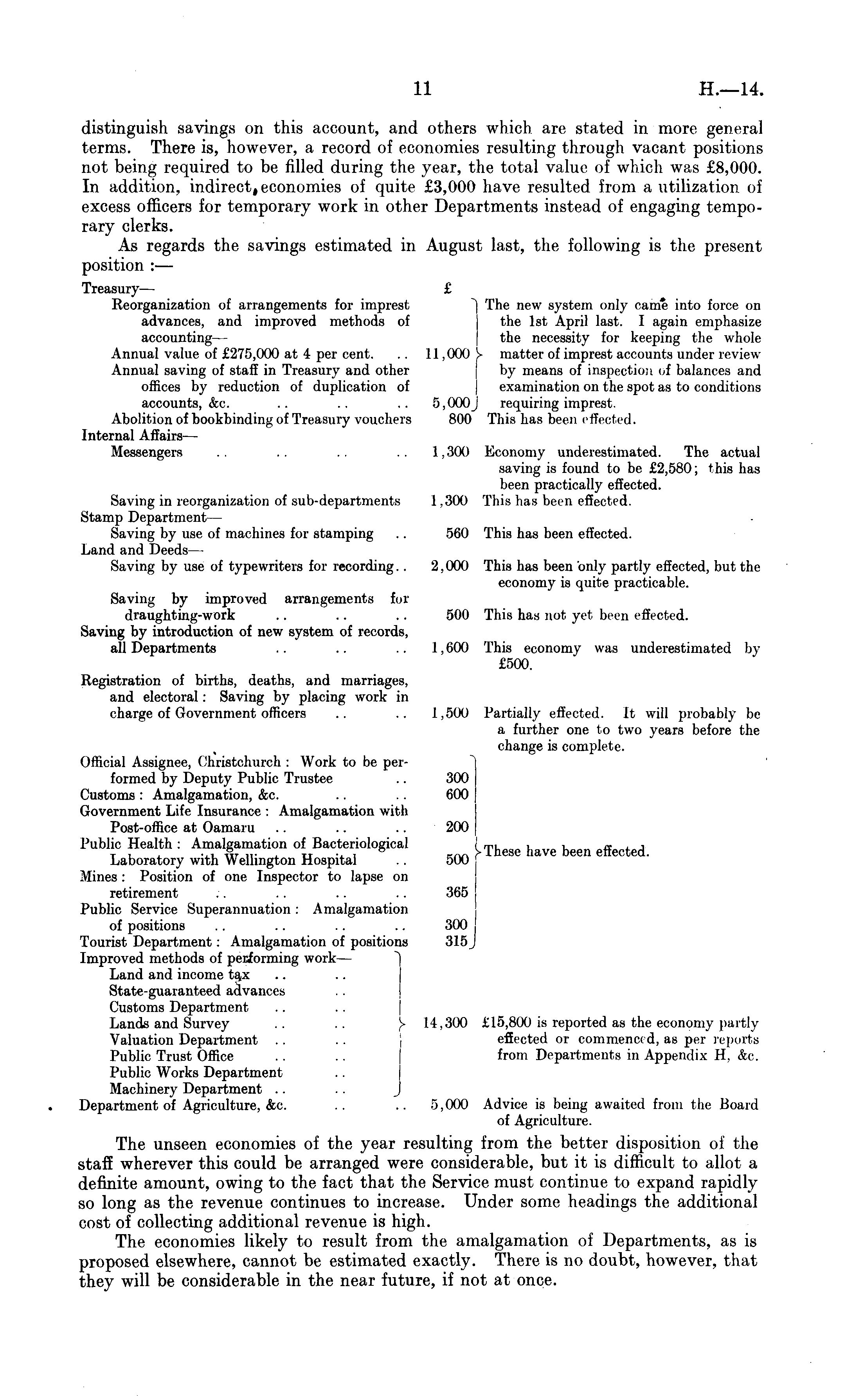 distinguish savings on this account, and others which are stated in more general terms. There is, however, a record of economies resulting through vacant positions not being required to be filled during the year, the total value of which was £8,000. In addition, indirect, economies of quite £3,000 have resulted from a utilization of excess officers for temporary work in other Departments instead of engaging temporary clerks. As regards the savings estimated in August last, the following is the present position : — Treasury— £ Eeorganization of arrangements for imprest ") The new system only came into force on advances, and improved methods of the Ist April last. I again emphasize accounting — the necessity for keeping the whole Annual value of £275,000 at 4 per cent. .. 11,000 !> matter of imprest accounts under review Annual saving of staff in Treasury and other by means of inspection of balances and offices by reduction of duplication of examination on the spot as to conditions accounts, &c. .. .. .. 5,000J requiring imprest. Abolition of bookbinding of Treasury vouchers 800 This has been effected. Internal Affairs— Messengers .. .. .. .. 1,300 Economy underestimated. The actual saving is found to be £2,580; this has been practically effected. Saving in reorganization of sub-departments 1,300 This has been effected. Stamp Department — Saving by use of machines for stamping .. 560 This has been effected. Land and Deeds— Saving by use of typewriters for recording.. 2.000 This has been only partly effected, but the economy is quite practicable. Saving by improved arrangements fur draughting-work .. .. .. 500 This has not yet been effected. Saving by introduction of new system of records, all Departments .. .. .. 1,600 This economy was underestimated by £500. Registration of births, deaths, and marriages, and electoral: Saving by placing work in charge of Government officers .. .. 1,500 Partially effected. It will probably be a further one to two years before the change is complete. Official Assignee, Christchurch : Work to be performed by Deputy Public Trustee .. 300 Customs: Amalgamation, &c. .. .. 600 Government Life Insurance : Amalgamation with Post-office at Oamaru .. .. .. 200 Public Health : Amalgamation of Bacteriological I These have been effected Laboratory with Wellington Hospital .. 500 Mines : Position of one Inspector to lapse on retirement :. .. .. .. 365 Public Service Superannuation : Amalgamation of positions .. .. .. .. 300 Tourist Department: Amalgamation of positions 315 J Improved methods of performing work— Land and income ta.x State-guaranteed advances Customs Department Lands and Survey .. .. }■ 14,300 £15,800 is reported as the economy partly Valuation Department .. .. effected or commenced, as per reports Public Trust Office . . .. from Departments in Appendix H, &c. Public Works Department Machinery Department Department of Agriculture, &c. .. .. 5,000 Advice is being awaited from the Board of Agriculture. The unseen economies of the year resulting from the better disposition of the staff wherever this could be arranged were considerable, but it is difficult to allot a definite amount, owing to the fact that the Service must continue to expand rapidly so long as the revenue continues to increase. Under some headings the additional cost of collecting additional revenue is high. The economies likely to result from the amalgamation of Departments, as is proposed elsewhere, cannot be estimated exactly. There is no doubt, however, that they will be considerable in the near future, if not at once.
