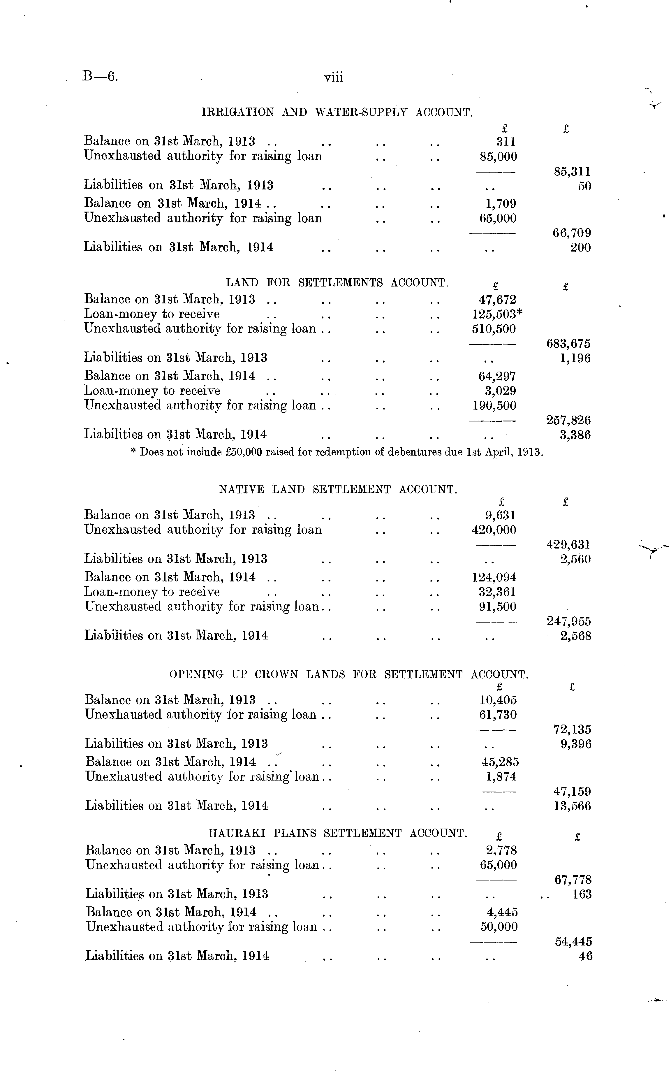 IRRIGATION AND WATER-SUPPLY ACCOUNT. £ £ Balance on 31st March, 1913 .. .. .. .. 311 Unexhausted authority for raising loan .. .. 85,000 85,311 Liabilities on 31st March, 1913 .. .. .. .. 50 Balance on 31st March, 1914 .. .. .. .. 1,709 Unexhausted authority for raising loan .. .. 65,000 66,709 Liabilities on 31st March, 1914 .. .. .. .. 200 LAND FOR SETTLEMENTS ACCOUNT. £ £ Balance on 31st March, 1913 .. .. .. .. 47,672 Loan-money to receive .. .. .. .. 125,503* Unexhausted authority for raising loan .. .. .. 510,500 683,675 Liabilities on 31st March, 1913 .. .. .. .. 1,196 Balance on 31st March, 1914 .. .. .. .. 64,297 Loan-money to receive .. .. .. .. 3,029 Unexhausted authority for raising loan . . .. . . 190,500 257,826 Liabilities on 31st March, 1914 .. .. .. .. 3,386 * Does not include £50,000 raised for redemption of debentures due Ist April, 1913. NATIVE LAND SETTLEMENT ACCOUNT. £ £ Balance on 31st March, 1913 .. .. .. .. 9,631 Unexhausted authority for raising loan .. .. 420,000 429,631 -^ Liabilities on 31st March, 1913 .. .. .. .. 2,560 Balance on 31st March, 1914 .. .. .. .. 124,094 Loan-money to receive . . . . .. .. 32,361 Unexhausted authority for raising loan. . . . . . 91,500 247,955 Liabilities on 31st March, 1914 .. .. .. .. 2,568 OPENING UP CROWN LANDS FOR SETTLEMENT ACCOUNT. £ £ Balance on 31st March, 1913 .. .. .. .. 10,405 Unexhausted authority for raising loan .. .. .. 61,730 72,135 Liabilities on 31st March, 1913 .. .. .. .. 9,396 Balance on 31st March, 1914 .. .. .. .. 45,285 Unexhausted authority for raising'loan.. .. .. 1,874 47,159 Liabilities on 31st March, 1914 .. .. .. .. 13,566 HAURAKI PLAINS SETTLEMENT ACCOUNT. £ £ Balance on 31st March, 1913 .. .. .. .. 2,778 Unexhausted authority for raising loan. . .. . . 65,000 67,778 Liabilities on 31st March, 1913 .. .. .. .. 163 Balance on 31st March, 1914 .. .. .. .. 4,445 Unexhausted authority for raising loan .. .. .. 50,000 54,445 Liabilities on 31st March, 1914 .. .. .. .. 46