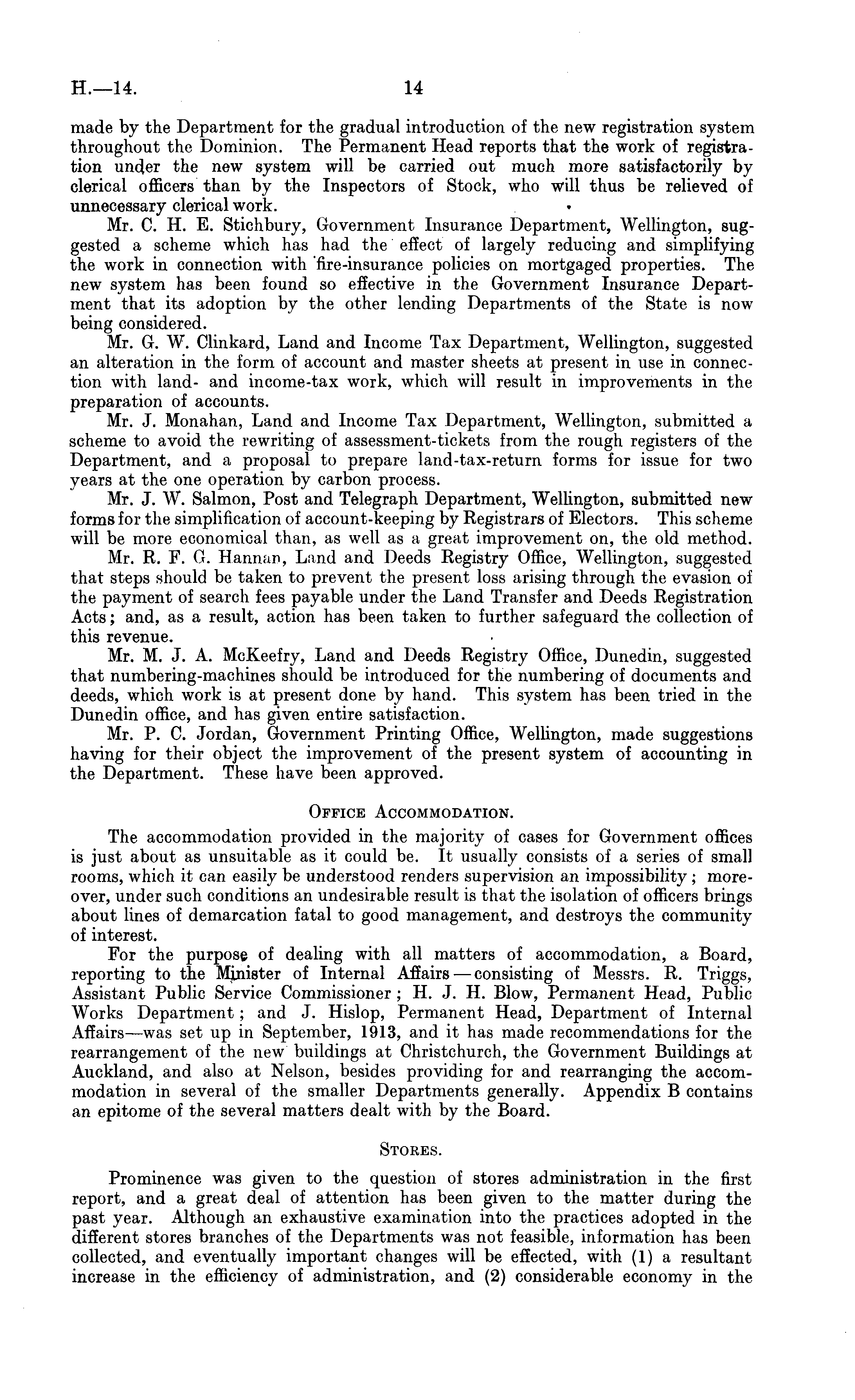 made by the Department for the gradual introduction of the new registration system throughout the Dominion. The Permanent Head reports that the work of registration under the new system will be carried out much more satisfactorily by clerical officers than by the Inspectors of Stock, who will thus be relieved of unnecessary clerical work. Mr. C. H. E. Stichbury, Government Insurance Department, Wellington, suggested a scheme which has had the effect of largely reducing and simplifying the work in connection with 'fire-insurance policies on mortgaged properties. The new system has been found so effective in the Government Insurance Department that its adoption by the other lending Departments of the State is now being considered. Mr. G. W. Clinkard, Land and Income Tax Department, Wellington, suggested an alteration in the form of account and master sheets at present in use in connection with land- and income-tax work, which will result in improvements in the preparation of accounts. Mr. J. Monahan, Land and Income Tax Department, Wellington, submitted a scheme to avoid the rewriting of assessment-tickets from the rough registers of the Department, and a proposal to prepare land-tax-return forms for issue for two years at the one operation by carbon process. Mr. J. W. Salmon, Post and Telegraph Department, Wellington, submitted new forms for the simplification of account-keeping by Registrars of Electors. This scheme will be more economical than, as well as a great improvement on, the old method. Mr. R. F. G. Hannan, Land and Deeds Registry Office, Wellington, suggested that steps should be taken to prevent the present loss arising through the evasion of the payment of search fees payable under the Land Transfer and Deeds Registration Acts; and, as a result, action has been taken to further safeguard the collection of this revenue. Mr. M. J. A. McKeefry, Land and Deeds Registry Office, Dunedin, suggested that numbering-machines should be introduced for the numbering of documents and deeds, which work is at present done by hand. This system has been tried in the Dunedin office, and has given entire satisfaction. Mr. P. C. Jordan, Government Printing Office, Wellington, made suggestions having for their object the improvement of the present system of accounting in the Department. These have been approved. Office Accommodation. The accommodation provided in the majority of cases for Government offices is just about as unsuitable as it could be. It usually consists of a series of small rooms, which it can easily be understood renders supervision an impossibility ; moreover, under such conditions an undesirable result is that the isolation of officers brings about lines of demarcation fatal to good management, and destroys the community of interest. For the purpose of dealing with all matters of accommodation, a Board, reporting to the Minister of Internal Affairs —consisting of Messrs. R. Triggs, Assistant Public Service Commissioner ; H. J. H. Blow, Permanent Head, Public Works Department; and J. Hislop, Permanent Head, Department of Internal Affairs —was set up in September, 1913, and it has made recommendations for the rearrangement of the new buildings at Christchurch, the Government Buildings at Auckland, and also at Nelson, besides providing for and rearranging the accommodation in several of the smaller Departments generally. Appendix B contains an epitome of the several matters dealt with by the Board. Stores. Prominence was given to the question of stores administration in the first report, and a great deal of attention has been given to the matter during the past year. Although an exhaustive examination into the practices adopted in the different stores branches of the Departments was not feasible, information has been collected, and eventually important changes will be effected, with (1) a resultant increase in the efficiency of administration, and (2) considerable economy in the