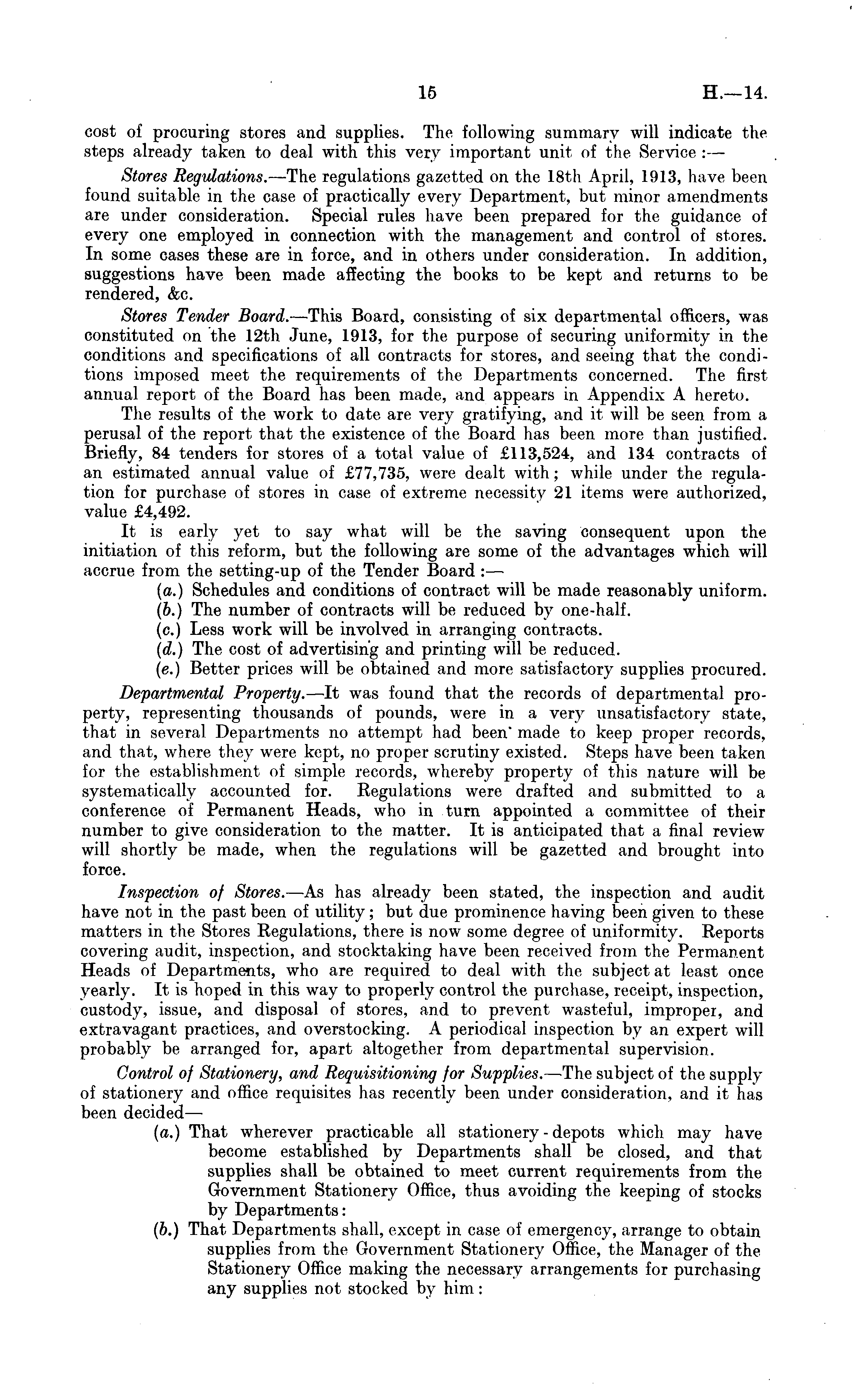 cost of procuring stores and supplies. The following summary will indicate the steps already taken to deal with this very important unit of the Service : — Stores Regulations. —The regulations gazetted on the 18th April, 1913, have been found suitable in the case of practically every Department, but minor amendments are under consideration. Special rules have been prepared for the guidance of every one employed in connection with the management and control of stores. In some cases these are in force, and in others under consideration. In addition, suggestions have been made affecting the books to be kept and returns to be rendered, &c. Stores Tender Board.— This Board, consisting of six departmental officers, was constituted on the 12th June, 1913, for the purpose of securing uniformity in the conditions and specifications of all contracts for stores, and seeing that the conditions imposed meet the requirements of the Departments concerned. The first annual report of the Board has been made, and appears in Appendix A hereto. The results of the work to date are very gratifying, and it will be seen from a perusal of the report that the existence of the Board has been more than justified. Briefly, 84 tenders for stores of a total value of £113,524, and 134 contracts of an estimated annual value of £77,735, were dealt with; while under the regulation for purchase of stores in case of extreme necessity 21 items were authorized, value £4,492. It is early yet to say what will be the saving consequent upon the initiation of this reform, but the following are some of the advantages which will accrue from the setting-up of the Tender Board : —■ (a.) Schedules and conditions of contract will be made reasonably uniform. (&.) The number of contracts will be reduced by one-half. (c.) Less work will be involved in arranging contracts. (d.) The cost of advertising and printing will be reduced. (c.) Better prices will be obtained and more satisfactory supplies procured. Departmental Property.—lt was found that the records of departmental property, representing thousands of pounds, were in a very unsatisfactory state, that in several Departments no attempt had been* made to keep proper records, and that, where they were kept, no proper scrutiny existed. Steps have been taken for the establishment of simple records, whereby property of this nature will be systematically accounted for. Regulations were drafted and submitted to a conference of Permanent Heads, who in turn appointed a committee of their number to give consideration to the matter. It is anticipated that a final review will shortly be made, when the regulations will be gazetted and brought into force. Inspection of Stores. —As has already been stated, the inspection and audit have not in the past been of utility; but due prominence having been given to these matters in the Stores Regulations, there is now some degree of uniformity. Reports covering audit, inspection, and stocktaking have been received from the Permanent Heads of Departments, who are required to deal with the subject at least once yearly. It is hoped in this way to properly control the purchase, receipt, inspection, custody, issue, and disposal of stores, and to prevent wasteful, improper, and extravagant practices, and overstocking. A periodical inspection by an expert will probably be arranged for, apart altogether from departmental supervision. Control of Stationery, and Requisitioning for Supplies. —The subject of the supply of stationery and office requisites has recently been under consideration, and it has been decided — (a.) That wherever practicable all stationery - depots which may have become established by Departments shall be closed, and that supplies shall be obtained to meet current requirements from the Government Stationery Office, thus avoiding the keeping of stocks by Departments: (b.) That Departments shall, except in case of emergency, arrange to obtain supplies from the Government Stationery Office, the Manager of the Stationery Office making the necessary arrangements for purchasing any supplies not stocked by him: