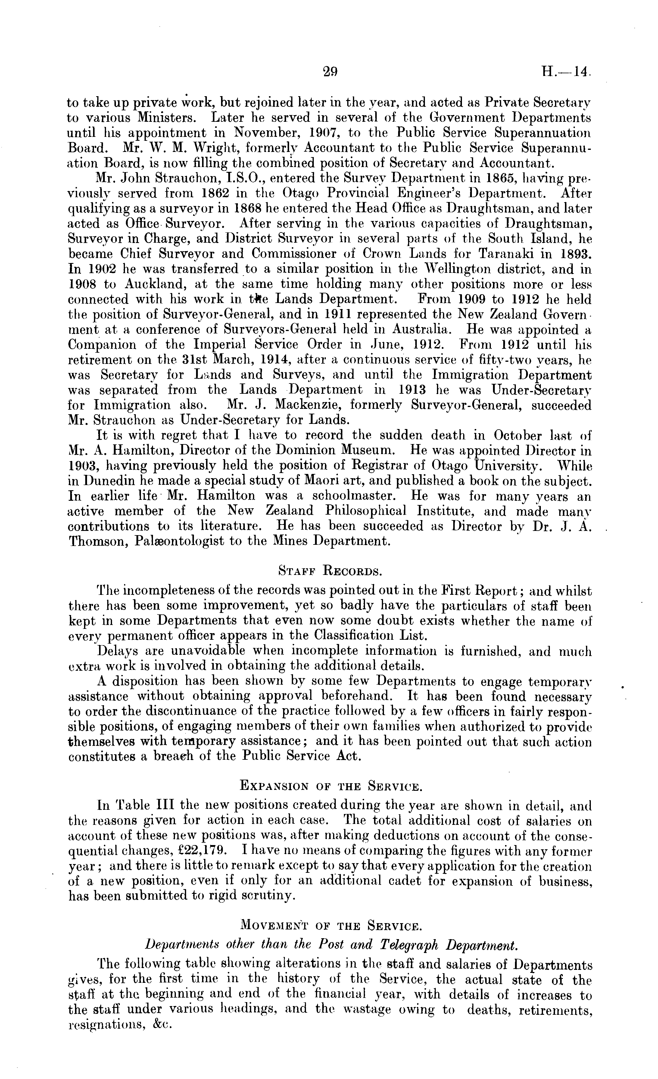 to take up private work, but rejoined later in the year, and acted as Private Secretary to various Ministers. Later he served in several of the Government Departments until his appointment in November, 1907, to the Public Service Superannuation Board. Mr. W. M. Wright, formerly Accountant to the Public Service Superannuation Board, is now filling the combined position of Secretary and Accountant. Mr. John Strauchon, 1.5.0., entered the Survey Department in 1865, having previously served from 1862 in the Otago Provincial Engineer's Department. After qualifying as a surveyor in 1868 he entered the Head Office as Draughtsman, and later acted as Office Surveyor. After serving in the various capacities of Draughtsman, Surveyor in Charge, and District Surveyor in several parts of the South Island, he became Chief Surveyor and Commissioner of Crown Lauds for Taranaki in 1893. In 1902 he was transferred to a similar position in the Wellington district, and in 1908 to Auckland, at the same time holding many other positions more or less connected with his work in the Lands Department. From 1909 to 1912 he held the position of Surveyor-General, and in 1911 represented the New Zealand Government at a conference of Surveyors-General held in Australia. He was appointed a Companion of the Imperial Service Order in June, 1912. From 1912 until his retirement on the 31st March, 1914, after a continuous service of fifty-two years, he was Secretary for L:;nds and Surveys, and until the Immigration Department was separated from the Lands Department in 1913 he was Under-Secretary for Immigration also. Mr. J. Mackenzie, formerly Surveyor-General, succeeded Mr. Strauchon as Under-Secretary for Lands. It is with regret that I have to record the sudden death in October last of Mr. A. Hamilton, Director of the Dominion Museum. He was appointed Director in 1903, having previously held the position of Registrar of Otago University. While in Dunedin he made a special study of Maori art, and published a book on the subject. In earlier life Mr. Hamilton was a schoolmaster. He was for many years an active member of the New Zealand Philosophical Institute, and made many contributions to its literature. He has been succeeded as Director by Dr. J. A. Thomson, Palaeontologist to the Mines Department. Staff Records. The incompleteness of the records was pointed out in the First Report; and whilst there has been some improvement, yet so badly have the particulars of staff been kept in some Departments that even now some doubt exists whether the name of every permanent officer appears in the Classification List. Delays are unavoidable when incomplete information is furnished, and much extra work is involved in obtaining the additional details. A disposition has been shown by some few Departments to engage temporary assistance without obtaining approval beforehand. It has been found necessary to order the discontinuance of the practice followed by a few officers in fairly responsible positions, of engaging members of their own families when authorized to provide themselves with temporary assistance; and it has been pointed out that such action constitutes a breach of the Public Service Act. Expansion of the Service. In Table 111 the new positions created during the year are shown in detail, and the reasons given for action in each case. The total additional cost of salaries on account of these new positions was, after making deductions on account of the consequential changes, €22,179. I have no means of comparing the figures with any former year; and there is little to remark except to say that every application for the creation of a new position, even if only for an additional cadet for expansion of business, has been submitted to rigid scrutiny. Movement of the Service. Departments other than the Post and Telegraph Department. The following table showing alterations in the staff and salaries of Departments gives, for the first time in the history of the Service, the actual state of the stall at the. beginning and end of the financial year, with details of increases to the staff under various headings, and the wastage owing to deaths, retirements. resignations, &c.