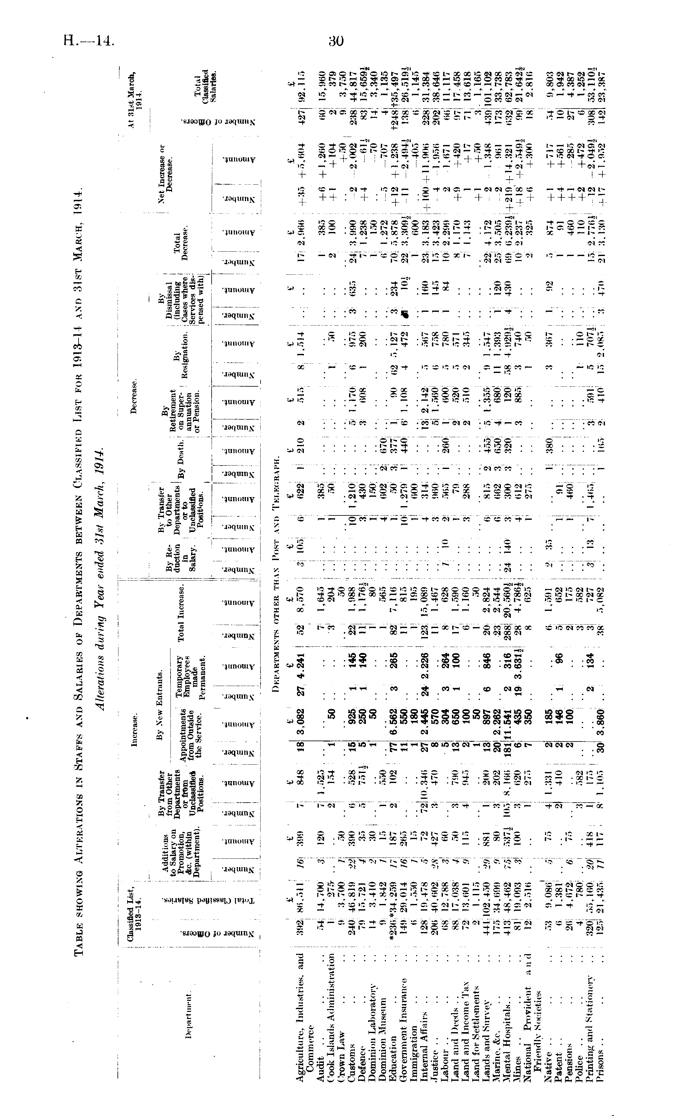 Table showing Alterations in Staffs and Salaries of Departments between Classified List for 1913-14 and 31st March, 1914. Alterations during Year ended 31st March, 1914.