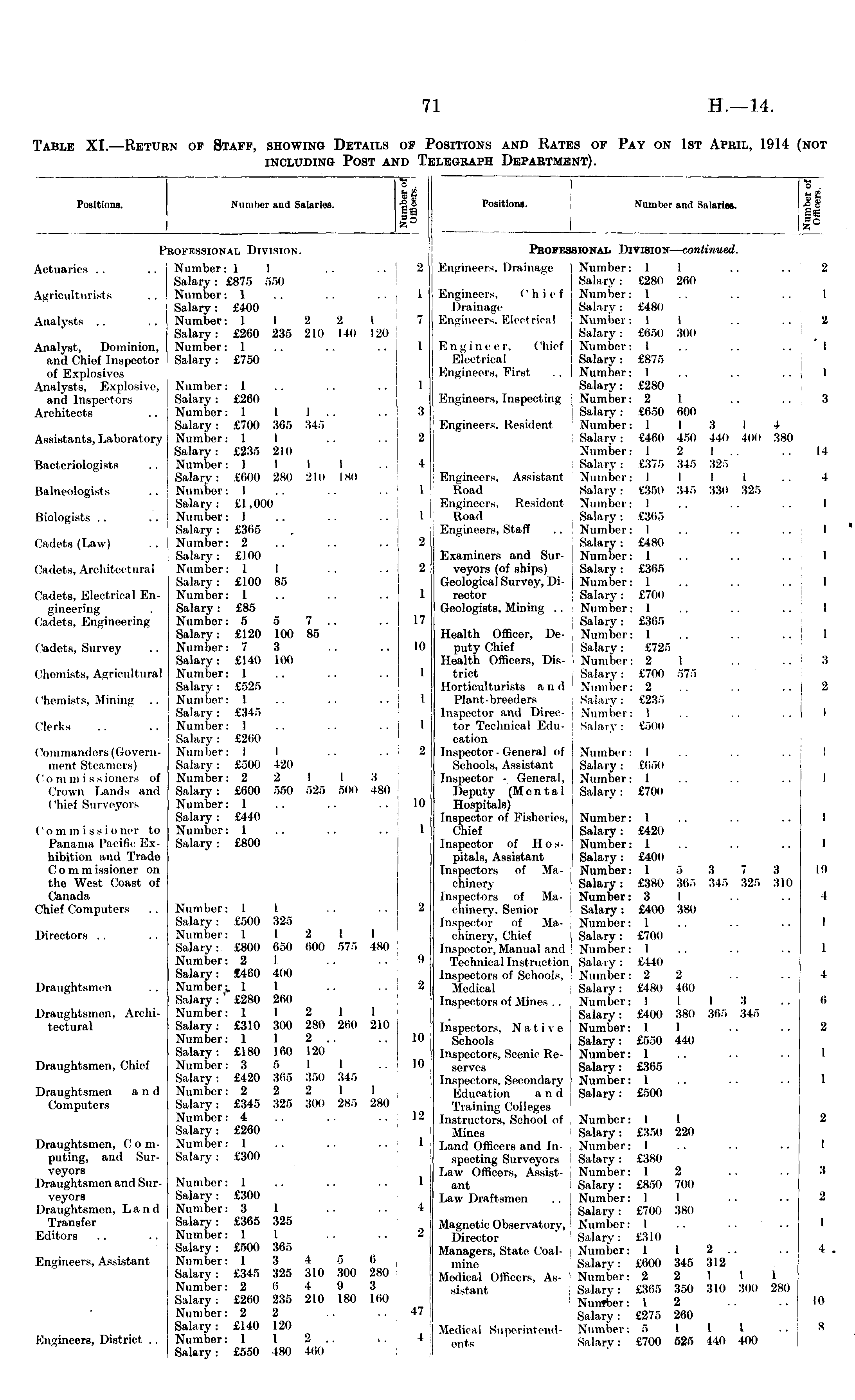 Table XI.—Return of Staff, showing Details of Positions and Rates of Pay on 1st April, 1914 (not including Post and Telegraph Department).