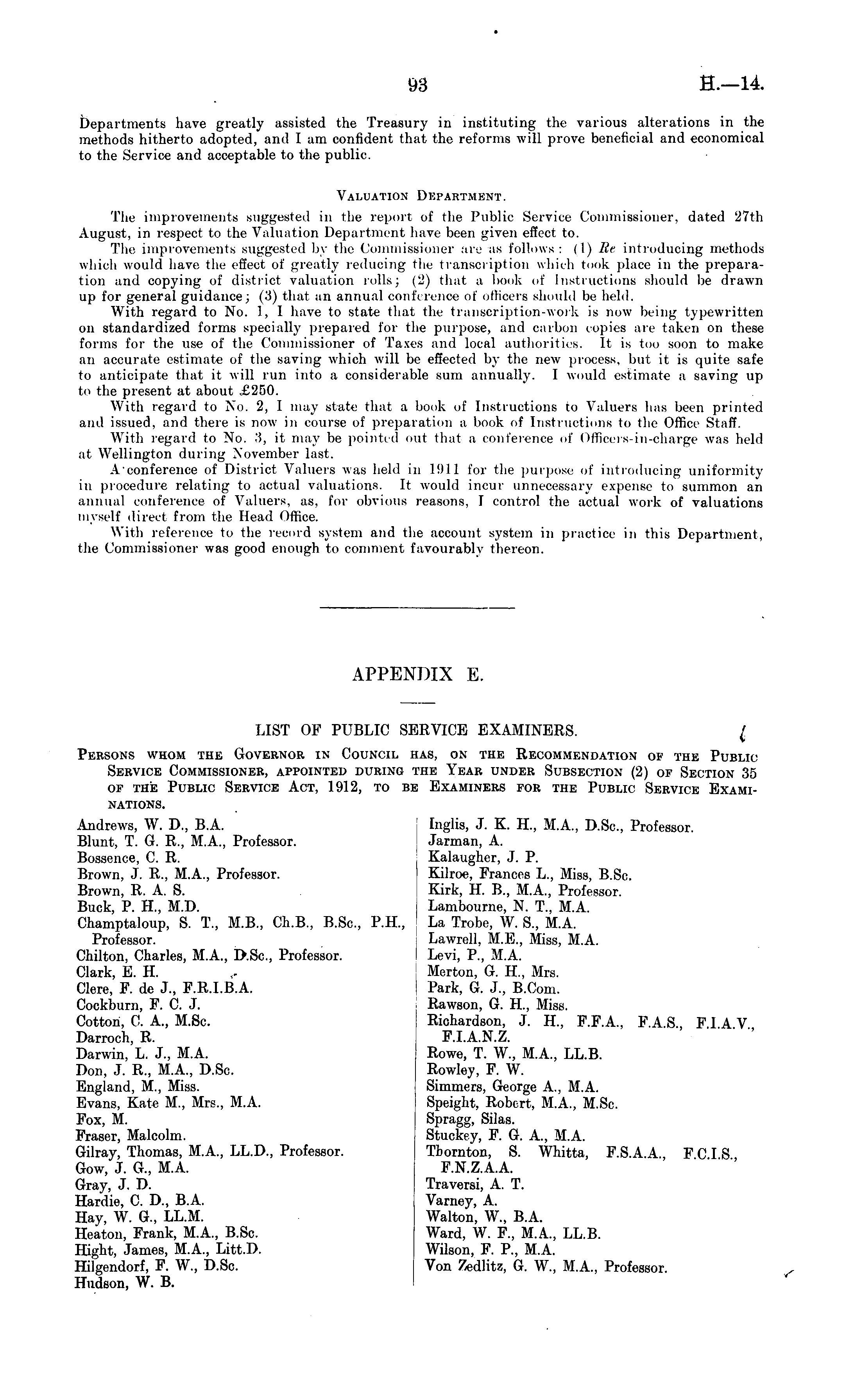 APPENDIX E. LIST OF PUBLIC SERVICE EXAMINERS. ( Persons whom the Governor in Council has, on the Recommendation of the Public Service Commissioner, appointed during the Year under Subsection (2) of Section 35 of the Public Service Act, 1912, to be Examiners for the Public Service Examinations. Andrews, W. D, B.A. Inglis, J. K. H., M.A, D.Sc, Professor. Blunt, T. G. R., M.A., Professor. Jarman, A. Bossence, C. R. Kalaughcr, J. P. Brown, J. R., M.A., Professor. Kilroe, Frances L., Miss, B.Sc. Brown, R. A. S. Kirk, H. 8., M.A., Professor. Buck, P. H., M.D. Lambourne, N. T., M.A. Champtaloup, S. T., M.8., Ch.B., B.Sc, P.H., La Trobe, W. S., M.A. Professor. Lawrell, M.E., Miss, M.A. Chilton, Charles, M.A., D.Sc, Professor. Levi, P., M.A. Clark, E. H. Merton, G. H., Mrs. Clere, F. de J., F.R.1.8.A. Park, G. J., B.Com. Cockburn, F. C. J. Raxvson, G. H., Miss. Cotton, C. A., M.Sc. Richardson, J. H., F.F.A., F.A S F1 A V Darroch, R. F.I.A.N.Z. Darwin, L. J., M.A. Rowe, T. W., M.A., LL.B. Don, J. R., M.A., D.Sc. Rowley, F. W. England, M., Miss. Simmers, George A., M.A. Evans, Kate M., Mrs., M.A. Speight, Robert, M.A., M.Sc. Fox, M. Spragg, Silas. Fraser, Malcolm. Stuckey, F. G. A., M.A. Gilray, Thomas, M.A., LL.D., Professor. Thornton, S. Whitta, F.S.A.A., F CIS Gow, J. G., M.A. F.N.Z.A.A. Gray, J. D. Traversi, A. T. Hardie, C. D., B.A. Varney, A. Hay, W. G., LL.M. Walton, W., B.A. Heaton, Frank, M.A., B.Sc. Ward, W. F., M.A., LL.B. Hight, James, M.A., Litt.D. Wilson, F. P., M.A. Hilgendorf, F. W., D.Sc. Yon Zedlitz, G. W., M.A., Professor. Hudson, W. B.