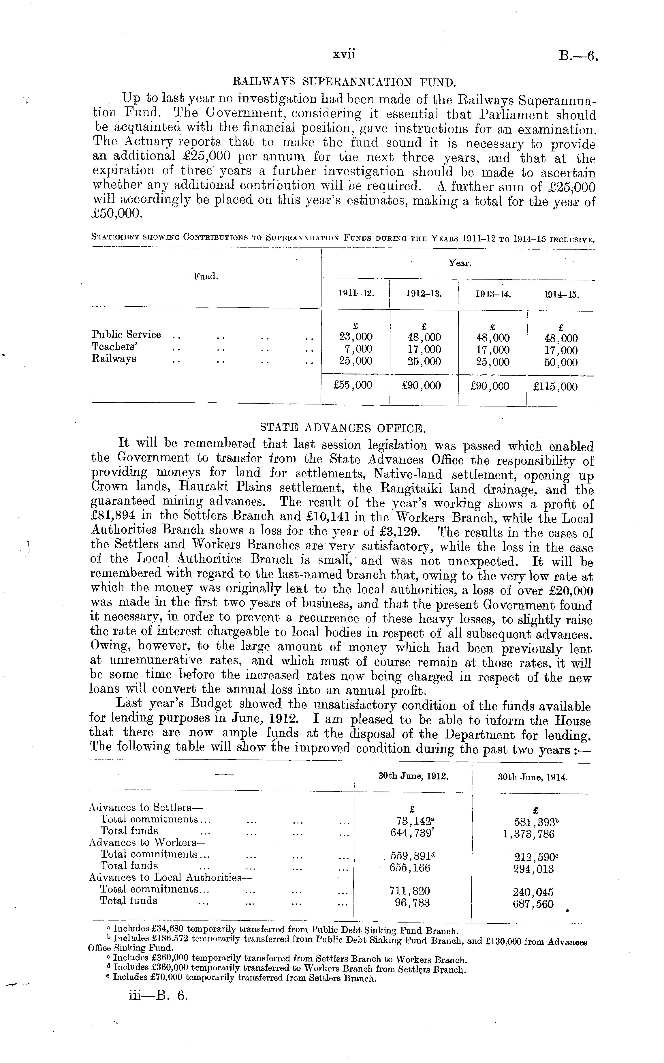 » Includes £34,680 temporarily transferred from Public Debt Sinking Fund Branoh. b Inoludes £186,572 temporarily transferred from Public Debt Sinking Fund Branch, and £130,000 from Advanoes Office Sinking Fund. 0 Includes £360,000 temporarily transferred from Settlers Branch to Workers Branch. d Includes £360,000 temporarily transferred to Workers Branch from Settlers Branch. c Includes £70,000 temporarily transferred from Settlers Branch,