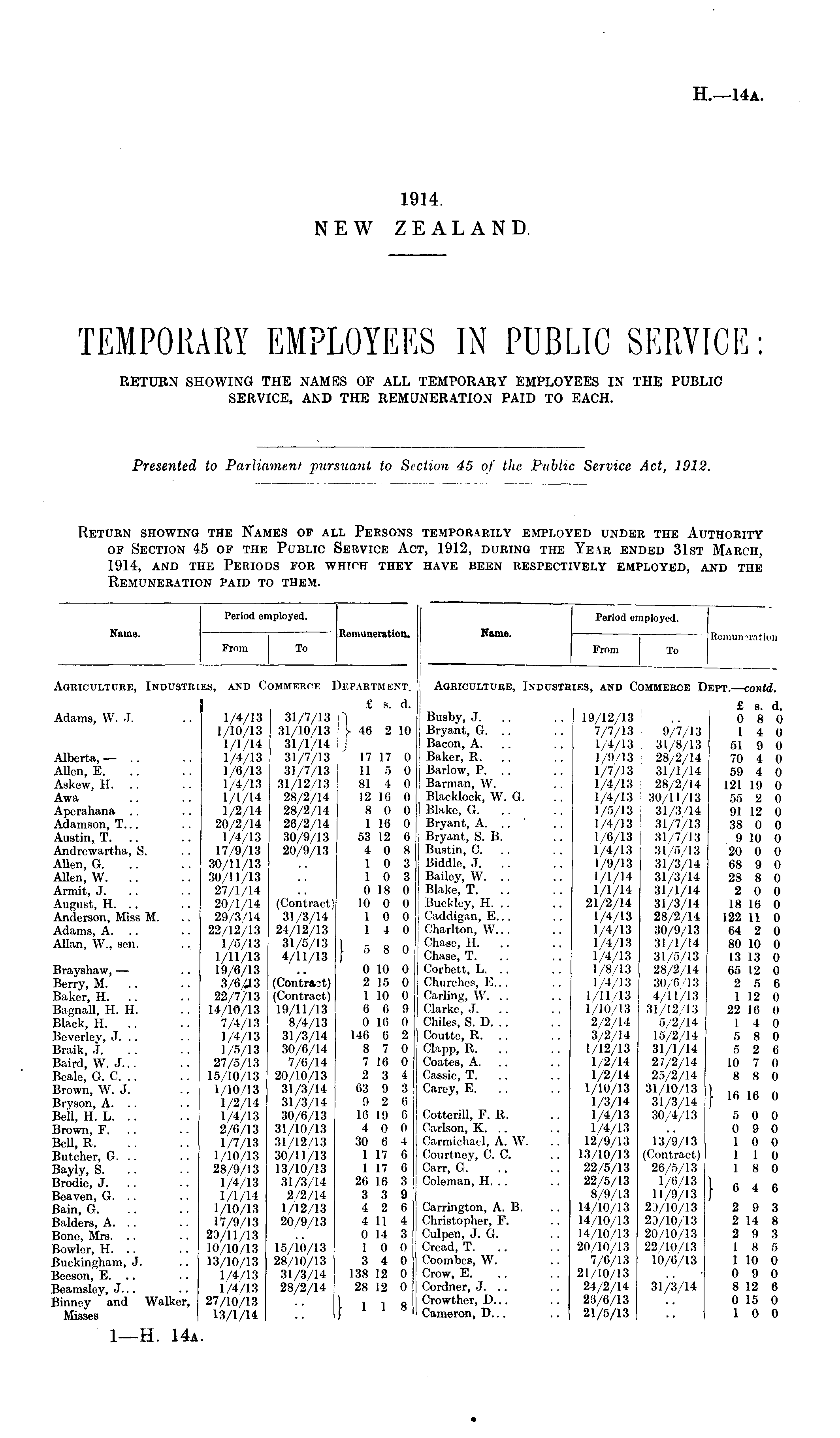 Return showing the Names of all Persons temporarily employed under the Authority of Section 45 of the Public Service Act, 1912, during the Year ended 31st March, 1914, and the Periods for which they have been respectively employed, and the Remuneration paid to them.