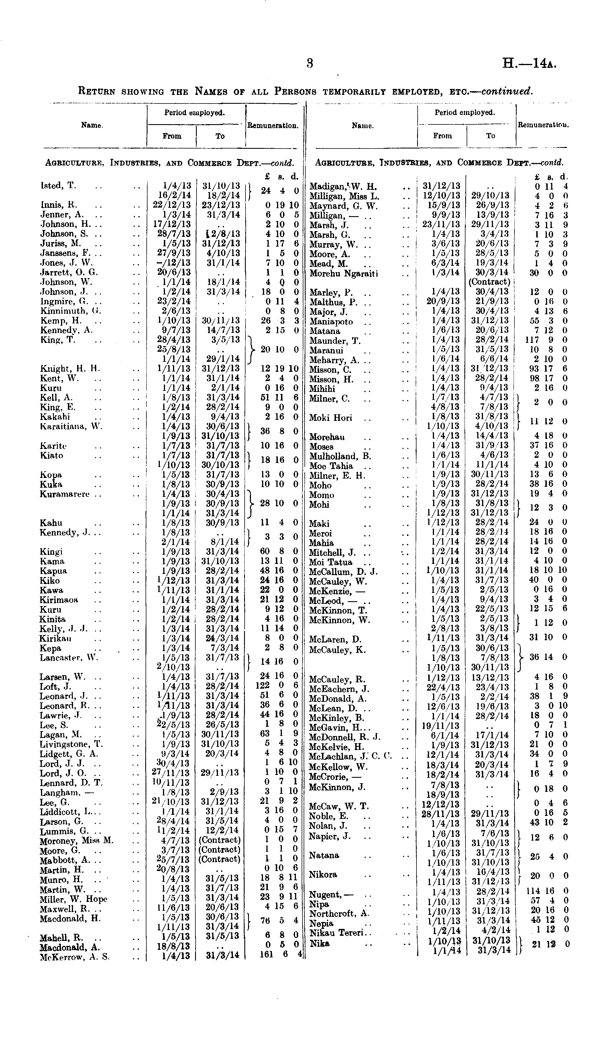 Period employed. MM'. Remuneration. From To Agriculture, Tndusti :bs, and Ci IMMERCE E EPT.— contd. Madigan," W. H. Milligan, Mies L. Maynard, G. W. Milligan, — Marsh, J. Marsh, 0. . . Murray, W. Moore, A. Mead, M. Morehu Ngaraili 31/12/13 12/10/13 15/9/13 9/9/13 23/11/13 1/4/13 3/6/13 1/5/13 6/3/14 1/3/14 29/10/13 26/9/13 13/9/13 29/11/13 3/4/13 20/6/13 28/5/13 19/3/14 30/3/14 (Contract) 30/4/13 21/9/13 30/4/13 31/12/13 20/6/13 28/2/14 31/5/13 6/6/14 31 12/13 28/2/14 !l 4 i:t 4/7/13 7/8/13 31/8/13 4/10/13 14/4/13 31/9/13 4/6/13 11/1/14 30/11/13 28/2/14 31/12/13 31/8/13 31/12/13 28/2/14 28/2/14 28/2/14 31/3/14 31/1/14 31/1/14 31/7/13 2/5/13 9/4/13 22/5/13 2/5/13 3/8/13 31/3/14 30/6/13 7/8/13 30/11/13 13/12/13 23/4/13 2/2/14 19/6/13 28/2/14 £ a. d. 0 11 4 4 0 0 4 2 6 7 16 3 3 11 9 1 10 3 7 3 9 5 0 0 1 4 0 30 0 0 Marley, P. .. Malthas, P. .. Major, J. Maniapoto Matana Maunder, T. Maranui Meharry, A. .. Misson, C. . . Misson, H. .. Mihihi Milner, C. .. 1/4/13 20/9/13 1/4/13 1/4/13 1/6/13 1/4/13 1/5/13 1/6/14 1/4/13 1/4/13 1/4/13 1/7/13 1/8/13 1/8/13 1/1(1 l:i 1/4/13 1/4/13 1/6/13 1/1/14 1/9/13 1/9/13 1/9/13 1/8/13 1/12/13 1/12/13 1/1/14 1/1/14 1/2/14 1/1/14 1/10/13 1/4/13 1/5/13 1/4/13 1/4/13 1/5/13 2/8/13 1/11/13 1/5/13 1/8/13 1/10/13 1/12/13 22/4/13 1/5/13 12/(i L3 1/1/14 19/11/13 6/1/14 1/9/13 12/1/14 18/3/14 18/2/14 7/8/13 18/9/13 12/12/13 28/11/13 1/4/13 1/6/13 I 10/13 1/6/13 1/10/13 1/4/13 1/11/13 1/4/13 1/10 L3 1/10/13 1/11/13 1/2/14 1/10/13 1/1/14 12 0 0 0 Iβ ii 4 IS I) r>5 3 0 7 12 0 117 9 0 10 8 0 2 10 0 93 17 6 98 17 0 2 Lβ ii Moki Hori [ 2 0 0 I I I 12 0 Morehau Moses Mulholland, B. Moe Tahia .. Milner, E. H. Moho Momn Mohi 4 IS (I 37 16 0 2 t) li 4 10 0 13 6 0 38 Iβ (t 19 4 0 [ 12 3 0 Maki Meroi Mahia Mitchell, J. Moi Tatua McCallum, D. J. McCauley, W. McKenzie, — McLeod, — McKinnon, T. McKinnon, W. 24 0 0 18 Iβ 0 14 16 0 12 0 0 4 10 0 18 10 10 40 0 0 0 Iβ ii 3 4 0 12 15 6 L 1 12 0 McLaren, D. McCauley, K. 31 10 0 I 36 14 0 McCauley, R. McEachern, J. McDonald, A. McLean, D. .. McKinley, B. McGavin, H... McDonnell, R. •). McKelvie, H. McLachlan, J. C ('. .. McKellow, W. McCrorie, — McKinnon, J. 17/1/14 31/12/13 31/3/14 20/3/14 31/3/14 4 16 0 1 8 0 38 1 9 3 0 10 18 0 0 0 7 1 7 10 0 21 0 0 34 0 0 1 7 9 16 4 0 [ 0 18 0 McCaw, W. T. Noble, E. Nolan, J. Napier, J. 29/11/13 31/3/14 7/6/13 31/10/13 31/7/13 31/10/13 16/4/13 31/12/13 28/2/14 31/3/14 31/12/13 31 3/U 4/2/14 31/10/13 31/3/14 0 4 6 0 16 5 43 10 2 Natana I 12 (i li I 25 4 0 I 20 0 0 Nikora Nugent, — Nipa Northcroft, A. Nepia Nikau Tereri. . Nika 114 Iβ 0 57 4 0 20 16 0 45 12 0 1 12 0 I 21 12 0
