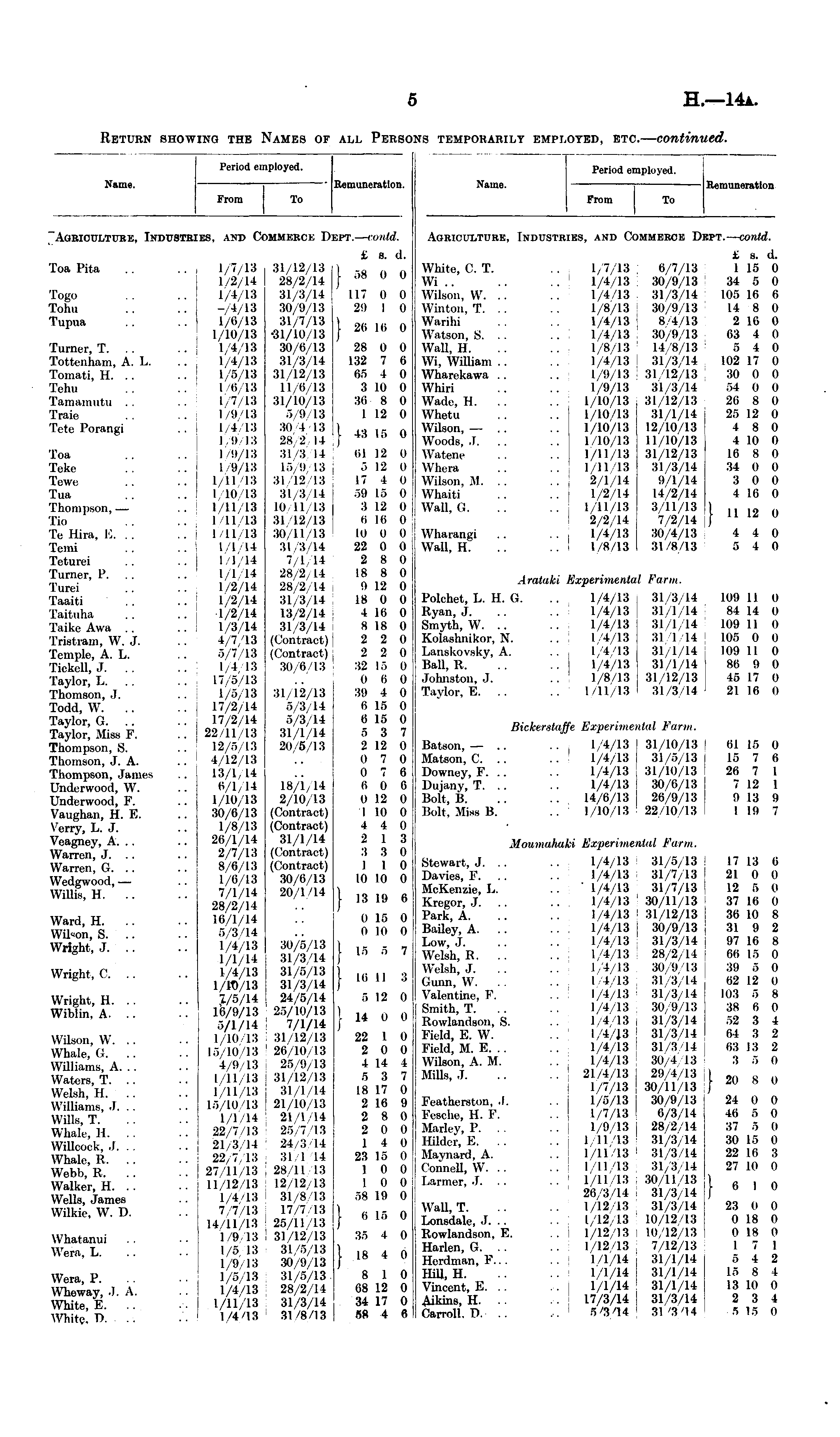 Period employed. Name. Remuneration. From To Agbicultcrk, Industr] ES, AND C )MMERCK Dl EPT. — COtUd. £ 8. d. Toa Pita 1/7 13 1/2/14 1/4/13 - I 13 1/6/13 1/10/13 I 4 L3 1/4/13 1/5/13 1/6/13 1/7/13 1/9/13 1/4/13 I 9 13 I ii 13 1/9/13 I : i 13 I lo L3 I II 13 I II 13 1/11/13 1/1/14 I I I I I I II 1/2/14 1/2/14 1/2/14 I 3 14 t 7 13 :. 7 L3 I 4 L3 17 5/13 1/5/13 17/2/14 17/2 14 22/11 L3 12 :> 13 4/12/13 13/1/14 6/1 II 1/10/13 30/6/13 1/8/13 26/1/14 2/7/13 8/6/13 1/6/13 7/1/14 28/2/14 16/1/14 5/3/14 I I 13 1/1/14 1/4/13 l/lt>/13 ,1/5/14 16/9/13 5/1/14 I in 13 15/10 13 4 9 13 I II L3 1/11/13 15/10'13 1/1/14 22/7/13 21/3/14 22/7 13 27/11/13 II 12/13 1/4/13 7 7 13 14/11 13 I it 13 I :> 13 1/9/13 1/5/13 1/4/13 1/11/13 I '4 '13 31/12/13 28/2/14 31/3/14 30/9/13 31 7/13 •31/10 1:1 30/6/13 31/3 14 31/12/13 II 8 13 :s 1/10/13 .'. i> 13 30 i 13 28 2 14 31/3 14 i.-) g 13 31 12 !:s 31 3 11 In II i:s :il 12/13 30 11/13 31 3/14 7 I 14 28/2, U 28/2/14 3] 3/14 I 13/2 I I 31 3/14 (Contract) (Contract) 30/6 13 31. 12/13 5/3 I I 5/3 I 1 31/1/14 20 5/13 18/1/14 2/10/13 (Contract) (Contract) 31/1/14 (('ontract) (('ontract) 30/6/13 20/1/14 j- 58 0 0 117 0 0 29 1 0 1 2(1 l(i 0 28 0 0 L32 7 6 65 4 0 3 10 0 36 8 0 1 12 0 J 43 15 o 111 12 0 ."> 12 0 17 4 u 59 15 0 3 12 0 ii Lβ 0 lo 0 0 22 0 0 2 8 0 18 8 0 9 12 0 18 0 0 1 16 (I 8 IS 0 2 2 0 2 2 0 32 15 0 0 (i (I 39 4 0 (i 15 0 6 15 0 5 3 7 2 12 0 0 7 0 0 7 6 li 0 6 0 12 0 1 10 0 4 4 0 2 1 3 :i 3 0 1 1 0 10 10 0 I 13 n> 6 Togo Tohu Tupua Turner, T. . . Tottenham, A. L. Tomati, H. .. Tehu Tamaimitu Traie Tctr Poiangi Toa Teke Tewe Tua Thompson,— Tio Tβ I lira, 10. .. Temi Teturei Turner, l>. Turei Taaiti Taituha Taike Awa Tristram, W. J. Temple, A. L. Tirkcll, J. . . Taylor, L. .. Thomson, .1. Todd, W Taylor, G. .. Taylor, Miss F. Thompson, 8. Thomson, J. A. Thompson, James Underwood, W. Underwood, F. Vaughan, H. E. V'erry, L. J. Veagney, A. .. Warren, J. .. Warren, G. .. Wedgwood, — Willis, H. .. Ward, H Wilson, S. .. Wright, J 30/5/13 31/3/14 31/5/13 31/3/14 24/5/14 25/10/13 7/1/14 ! 31/12/13 1 26/10/13 25/9/13 31/12/13 31 1/14 21/10/13 21/1 II 26 7 13 24 3 14 31 I 14 28/11 13 12 12 13 31/8 13 17 7 13 25/11 L3 31/12/13 31 ■"» 13 30/9/13 31/5/13 28/2/14 31/3/14 31/8/13 0 15 0 0 10 0 j- L6 •"> 7 [- n> ii :; r> 12 (i J- 14 0 0 22 I 0 2 0 0 4 14 4 5 3 7 18 17 0 2 16 it 2 8 0 2 0 0 1 4 0 23 15 0 1 0 0 1 0 0 58 19 0 1 6 15 0 35 4 0 I 18 4 0 8 1 0 68 12 0 34 17 0 58 4 R Wright, C Wright, H. .. Wiblin, A. .. Wilson, \V. Whale, <!. Williams, A. . . Waters, T. Welsh, H. .. Williams, .). . . Wilis, T. Whale, H. .. Willcock, .1. . . Whale, R. Webb, R. . . W 7 alker, H. . . Wells, James Wilkie, W. D. Whatanui Wera, L. Wora, P. Wheway, J. A. White, E. . . White. T>. ..