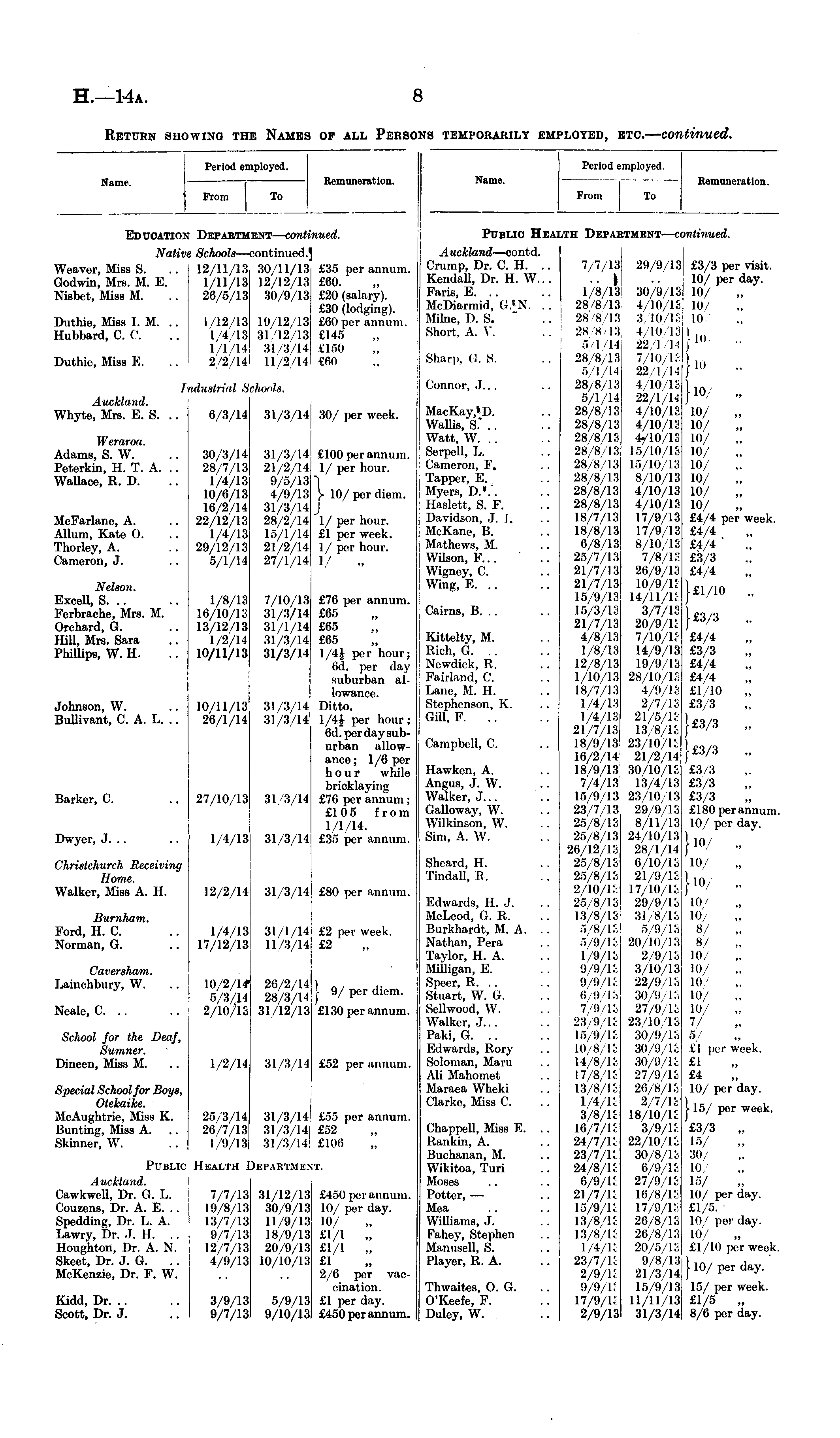 Name. Period employed. From To Remuneration. Public He/ .TH Depab tTMENT— CI mtinued. Auckland —contd. Crump, Dr. C. H. Kendall, Dr. H. W.. . Faris, E. .. McDiarmid, G.'N. . . Milne, 1). S. Short, A. V. 7/7/13 1/8/13 28/8/13 2s s 13 28 8 13 5/1/14 28/8/13 5/1/14 28/8/13 5/1/14 28/8/13 28/8/13 28/8/13 28/8/13 28/8/13 28/8/13 28/8/13 28/8/13 18/7/13 is s i:i 6/8/13 25/7/13 21/7/13 21/7/13 15/9/13 15/3/13 21/7/13 4/8/13 1/8/13 12/8/13 1/10/13 18/7/13 1/4/13 1/4/13 21/7/13 18/9/13 16/2/14 18/9/13 7/4/13 15/9/13 23/7/13 25/8/13 25/8/13 26/12/13 25/8/1S 25/8/13 2/10/1 'i 25/8/13 13/8/13 5 8 i: 5 ii i: 1/9/13 9/9/13 9/9/1S (i 9 IS 7/9 i: 23 (i i: 15/9/13 Ki s L3 14/8/1 £ 17/8/13 13/8/U 1/4/13 3/8/15 16/7/13 24/7/13 23/7/11. 24/8/1:. 6/9/1J 21/7/15 15/9/lt 13/8/1 c 13/8/U 1/4/13 23/7/13 2/9/15 9/9/15 17/9/13 2/9/13 29/9/13 30/9/13 4/10/1S 3 Id i: 4 III 13 22 I I-: 7 10 i: 22/1/14 4/10/13 22/1/14 4/10/12 4/10/13 1 10 I! 15/10/13 15/10/13 8/10/13 4/10/13 4/10/13 17/9/13 17 9 I: 8/10/13 7/8/13 26/9/13 io/9/i; 14/11/1E 3/7/13 20/9/1; 7/10/U14/9/13 19/9/13 28/10/1S 4/9/1S 2/7/13 21/6/13 13/8/1 c 23/10/1£ 21/2/14 30/10/1S 13/4/13 23 10 13 2(1 !) \:. 8/11/13 24/10/13 28/1/14 6/10/13 21/9/13 17/10/13 29/9/13 31 8, 13 6 it 13 ■20 Hi 13 2/9/13 3/10/13 22/9/13 30/9/13 27/9/13 i>:! io 13 30/9/13 30/9/13 30/9/13 27/9/13 26/8/13 2/7/13 18/10/13 3/9/13 22/10/1 £ 30/8/13 6/9/13 27/9/13 16/8/13 17 9 i: 26/8/13 26/8/13 20/5/13 9/8/131 21/3/14 15/9/131 11/11/13 31/3/141 £3/3 per visit. 10/ per day. 10/ „ 10/ > : }.. .. 10/ „ 10/ „ 10/ „ 10/ „ 10/ ,. 10/ „ 10/ „ 10/ „ £4/4 per week. £4/4 £4/4 ' £3/3 £4/4 I £1/10 }£3/3 .. £4/4 £3/3 £4/4 £4/4 £1/10 £3/3 I £3/3 }£3/3 £3 3 £3 3 £3/3 £180 per annum 10/ per day. } 10/ .. 10 110/ „ 10/ 10/ „ 8/ ,. 8/ 10/ Id l<1 10/ .. 10/ ., V 5/ £1 per week. £1 £4 10/ per day. 1 15/ per week. £3/3 15/ 30/ in 15/ 10/ per day. £1/5. 10/ per day. 10/ „ £1/10 j>er week. 1 10/ per day. 15/ per week. £1/5 „ 8/6 per day. Sharp, G. S. Connor, .).. . MaoKay, 1 1). Wallis, S. .. Watt, W. .. Serpell, L. Cameron, F. Tapper, E. Myers, D. , .. Haslett, S. F. Davidson, J. I. MeKane, B. Mathews, M. Wilson, F... Wigney, C. Wing, E. .. Cairns, B. .. Kittelty, M. Rich, G. .. Newdiok, J?. Fairland, C. Lane, M. H. Stephenson, K. Gill, F Campbell, C. Hawken, A. Angus, .). W. Walker, J... Galloway, W. Wilkinson, W. Sim, A. W. Sheard, H. Tindall, R. Edwards, H. J. McLeod, G. R. Burkhardt, M. A. .. Nathan, Pera Taylor, H. A. Milligan, E. Speer, R. .. Stuart, W. G. Sellwood, W. Walker, J... Paki, G. .. Edwards, Rory Soloman, Maru Ali Mahomet Maraea Wheki Clarke, Miss C. Chappell, Miss E. .. Rankin, A. Buchanan, M. Wikitoa, Turi Moses Potter, — Mea Williams, J. Fahey, Stephen Manusell, S. Player, R. A. Thwaites, 0. G. O'Keefe, F. Duley, W.