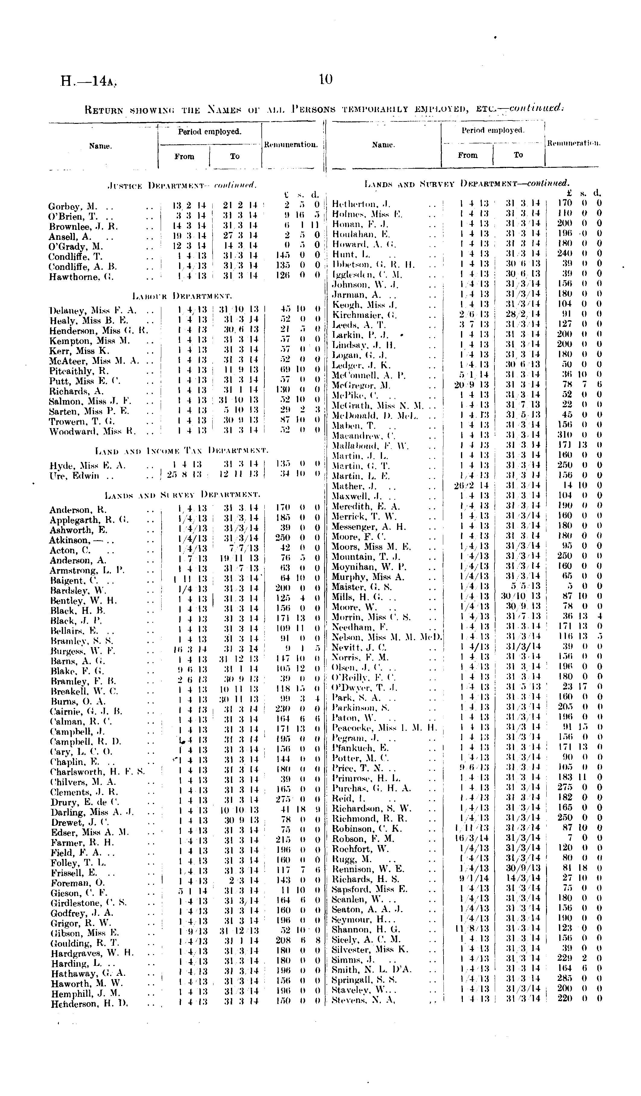[Tame Period employed. From To Etemuneratii n. Lanch lnd Subvei Department— amiit Hetherton, J. .. II 13 31 3 14 Holmes, Miss i: .. 14 13 :il :t 14 Honan, F. .1. . 14 13 :il 3 14 Houlahan, K. .. I 4 Mi 31 3 14 II,.»ar,i. A. <:. .. 14 13 :si :f 14 Hunt, L. .. . . 14 13 31 3 14 [bbeteon, G. l{. II .. 14 13 :i(> 6 13 [ggleeden, C. M. .. 1/4/13 30 6 13 Johneon, W. .1 .. III:! :il 3/14 .human. A. . . .. 14 13 :S1 3 I I Keogh, .Miss .1. .. 14 13 31 3/14 Kirchraaier, G. .. 2 6 13 2S 2 14 Leeds, A. T. .. :i 7 13 :'.l :) 14 Larkin, !'. J. • .. 14 13 :fl :t 14 Lindsay, .1. II. .. 14 13 31 .'! 14 Logan, G. .1. .. 14 13 31 :s 14 Ledger, J. l<. .. 14 13 30 6 13 McOonnell, A. l>. .. 5/1/14 31 3 14 McGn i M .. 20 !i 13 31 :i 14 McPike, C. .. .. 14 13 31 3 14 McGrath, Miss N. M. . . 14 13 :il 7 13 McD lid. r>. M.l,. .. I I l:i :tl 6 13 Maben, T. . . .. 1/4/13 31/3/14 Macandrew, V .. \ 1/4/13 31 :( 14 MaUabond, F. \\. .. \ 1/4/13 :i\ :! 14 Martin, -I. L. .. 14 13 31 :i 14 Martin, <:. T. .. 1/4/13 31 3 11 Martin, U E, .. 1/4/13 31 3 I I Mather, J. .. .. 26 2 14 31 :! 14 MaxweU, .1. .. .. 1/4/13 31/3/14 Meredith, E. A. .. 14 13 31 •'! 14 Merrick, T. W. . . 14 13 :il :i 14 Messenger, A. II. .. 14 13 :SI 3 14 Moore, F. C. .. 1/4/13 :ll 3 14 Moors. Miss M. Iv .. 14 13 31 3 I I Mountain, T. .1. .. 14 13 31 3 14 Moynihan, W. P. .. 1/4/13 :SI 3 II Murphy, Miss A. .. t/4/13 31 3 14 Mais,,.',.. <;. s. . . 1/4/13 5 5 13 Milk H. (!. .. .. 14 13 30 Ml 13 Moore, \V. .. .. 1/4/13 :to 9 13 Morrin, Miss ('. s. .. 14 13 31 7 13 Needham, F. .. 14 13 31 3 I I Nelson Miss M. M. Mil). I 4 [3 :U :i 14 Nevitt, J. ('. .. 1 i/i:s :il/3/14 Norrie, F. M. . . 14 L3 :si :i 14 Olsen J. C. .. . . 1/4/13 31 3 I I O'Reilly, F. C. .. 14 13 31 3 14 O'Dwyer, T. J. .. 1/4/13 31 5 i:i I'arU.S. A. .. .. 14 13 :il 3 I I Parkinson, S. .. 14 13 31 3 14 Paton, W. .. .. 1/4/13 31 :'» 1 I Peacooke, Mi- I. M. H. I 4 13 31 :i 14 I'egrani, J. .. ■ ■ I 4 13 :!l :i I ' Pfankuch, E. . . 1/4/13 :!l :i 14 Potter, M. C. .. 1/4/13 31/3/14 Price, T, N. .. .. H/6 13 31 3 I I Primrose, H. L. .. II 13 31 3 14 Purchas, <:. II. A. .. ! 1/4/13 31 :i 14 Reid, I. .. .. 1/4/13 :il :i 14 Richardson, S. W. .. 1/4/13 31 :i 14 Richmond, R. R. .. 14 13 31 3 14 Robineon, c K. .. Ill L3 :si :i 14 Robson, F. M. .. IK/3/14 31/3, 14 Rochfort, W .. 1/4/13 31 3 14 Rugg, M 14 L3 31 3 14 Rennison, \V. E. .. I 4/13 :«) d i:t Richards, II. s. .. 9/1 14 14 :{ 14 Sapsford, Miss E. .. 14 13 31 3 14 Scanlen, W I 4 i:i :il :< 14 Beaton, A. A. J. .. I 4 L3 31 :i 14 Seymour. H... .. 14 L3 31 3 14 Shannon, II. G. .. US 13 31/3 14 Sicely, A. C. M. .. 1/4/13 31 3 14 Silvester, Miss K. .. I 4 in :(l :* 14 Simms, .1 I 4/13 31 3 II Smith. N. L. DA. .. 14 13 31 IS 14 Spriimall. S. S. .. I 4 13 31 .f 14 Staveley, W... .. 14 i:i 31 3 14 Stevens, \. A, I 4 13 31 3 14 intted. £ s. d. 17(1 0 II IK) I) 0 2(1(1 II 0 196 (i () ISO (I U 24(1 (I 0 39 I) 0 :s<i (i 0 186 l> (I ISO (I (I 11)4 II II '.II II (I 127 (I (I 200 0 (i 200 (I 0 ISO I) 0 "id 0 (I 36 Id 0 78 7 r> 52 0 0 22 (I 0 US (i (i 166 (i o :{lo (i ii 171 13 (i Kid 0 0 260 0 (I 166 o 0 14 10 0 104 0 0 Mid 0 o Kill (I 0 iso 0 o ISO o 0 96 0 0 250 0 0 Hill 0 0 66 0 o ."> 0 0 sv 10 o 7S II 0 36 13 4 171 13 0 iin 13 s 39 o o 156 o o 196 o 0 I so o n 2:s 17 0 Hid I) II 20."i II II l<11) II O ill in 0 156 0 0 171 13 II 90 o 0 106 0 o 183 11 0 27.-. o (i IS2 0 I) 166 0 0 250 o 0 S7 10 0 7 (I 0 12(1 II 0 SO (I 0 81 is o 27 10 0 7."i 11 i) ISO 0 (I 166 0 0 190 o 0 123 0 0 156 0 o 39 o o 229 2 o 1(14 Ii H 286 o ii 200 (I 0 220 (I (I