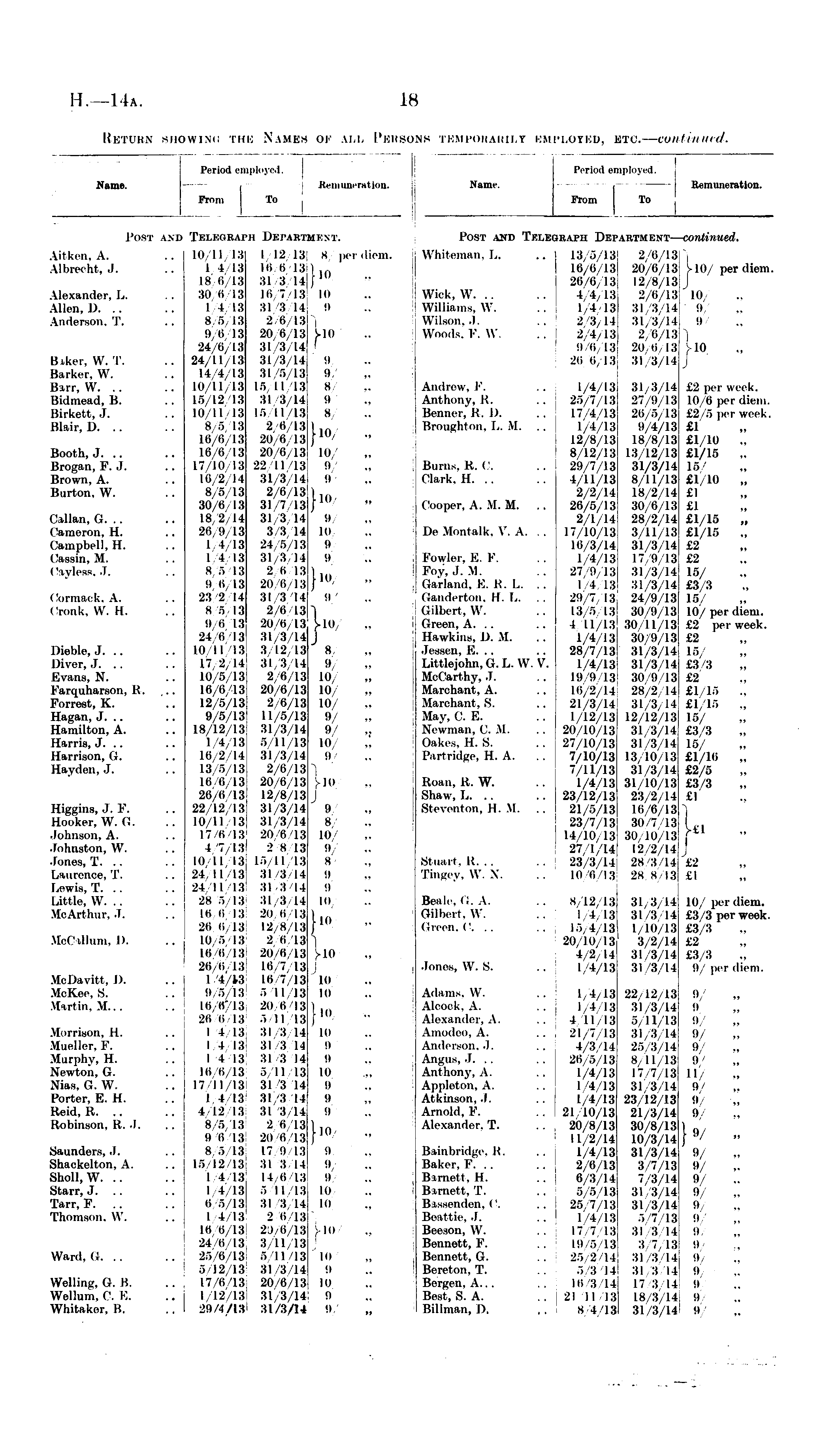 Name. Period employed. Frnm To I J_ Remunerat Ion. Post and Tblegrap •II DKrARTl KENT. Aitken, A. Albreoht, J. III II Hi I t/13 is ii 13 30 ii 13 I 4 13 8 5 13 9 ii 13 24 6/13 24 II 13 14 4 Hi 10 II Hi L6 12 13 III II Hi 8 r> 13 16/6/13 Lβ ii 13 17 10 111 Hi 2 II s .-> 13 30 6 Hi 15 2 14 26 9 Hi I 4 13 1 4 13 8 5 L3 '.i ii in 23 2 14 s :, 13 9 li II! 2 4 6 13 III II Hi 17 2 II III r> Hi Hi li Hi 12/5/13 9/5/13 18/12/13] I 4 13 Ki 2 14 L3 5 13 111 l> 13 26 ii Hi 22 12 Hi HI II Hi 17 (i L3 4 7 Hi 10 II Hi 24 II L3 24 II Hi 28 5 Hi Hi i; lit 26 ii L3 lo ."> 13 Hi li Hi 26 8 13 I 4 Hi 9 5 Hi Lβ »" L3 26 ii IH I 4 L3 I 4 13 I 4 L3 Hi l> IH 17 II Hi 1 4 13 4 12 13 5 .-, IH 9 ii 13 8 5 Hi IT, 12 Hi I 4 13 I 4 Hi ii 5 13 I 4 13 Hi ii Hi 21 li Hi 2.~, li L3 5 12 IH 17 6 13 I 12 Hi 29/4/131 I 12 13 i>; i> 13 hi :j u Lβ 7 13 31 3 14 2 ii L3 20 ii 13 31 3 14 31 3 14 31/5/13 15/11 I H .ii it 14 15 n 13 2/6 13 20 8 13 20/6/13 22 11 1 li 31 :s It 2/6/13 ill 7 13 HI I! 14 3 3 14 24/5/13 31/3/14 2 ii 13 20 ii 13 31 3 14 2 ii 13 20 l> Hi 111 li 14 11 12 13 HI li 14 2/6/13 20/6/13 2 c> 13 11/5/13 J 31/3/14 5/11/13 HI li 14 2/6/13 20/6/13 ! 12/8/13 ill li II HI 3 14 20 ii 13 2 8 13 15 II Hi 31 3 14 HI H 14 31/3/14 20 ii Hi 12 8 Hi 2 li 13 20 ii 13 Hi 7 us Hi 7 L3 .'ill 13 211 li Hi ."> II 13 31 3 14 31 3 M HI 3 14 S II Hi 31 H 14 31 3 It 31 3 14 2 li 13 20 li 13 17 li 13 31 3 14 I I (i IIS r> II L3 31 3 14 2 (i 13 20/6 13 3 II 13 r> II 13 31 3 14 20/6/13 31 3 14 I 31/3/14 S per diom. !- in Alexander, I... Allen. I). .. Anderson, 'I'. (.10 .. Hiker. W. T. Barker, W. Barr, W, .. Hid mead, B. Birkett, J. Blair, D. .. 9 9 8 9 8 Booth, J. .. Brogan, P. J, Brown, A. Burton, W. J 10/ ., Hi 9 9 110/ (Ullan, (!. . . Cameron, H. Campbell, H. i 'iis-iin. M. (' iyless. J. !> lo ;: : Cormack, A. ('mill;. \V. H. () '<: : (i 10 10/ 10/ „ 9/ „ 9/ ., in !> Oieble, J. .. Diver. J. .. I'lvans, N. Karquharson, R. Forrest, K. Hagan, J. .. Hamilton, A. Harris, J. .. Harrison, G. Hayden, J. Higgins,.). F. Hooker, W. G. Johnson, A. Johnston, \\'. Jones, T. .. l/uirenoe, T. Lewis, T. .. little, \V. .. MeArtlinr. .1. 9 ■s 10 8 8 !t '.I III MoC*llum, I). !"■ •• J- 10 Mcllavitt, J). MoKee, S. Martin. M.. . lo 10 I Morrison, H. Mueller.F. Murphy, H. Newton, G. Nias. G. W. Porter. E. H. Reid. H. . . Robinson, K. J. 10 9 i> lo 9 9 ii !"■ Saunders. .1. Shackelton, A. Sholl, W. .. Starr, J. Tarr. V. .. Thomson. W. 9 8 !> 10 10 Hi ... Ward. (J. .. I 1" !l 10 (I 11 Welling, G. B. Welhuii. C. E. Whitaker. li.