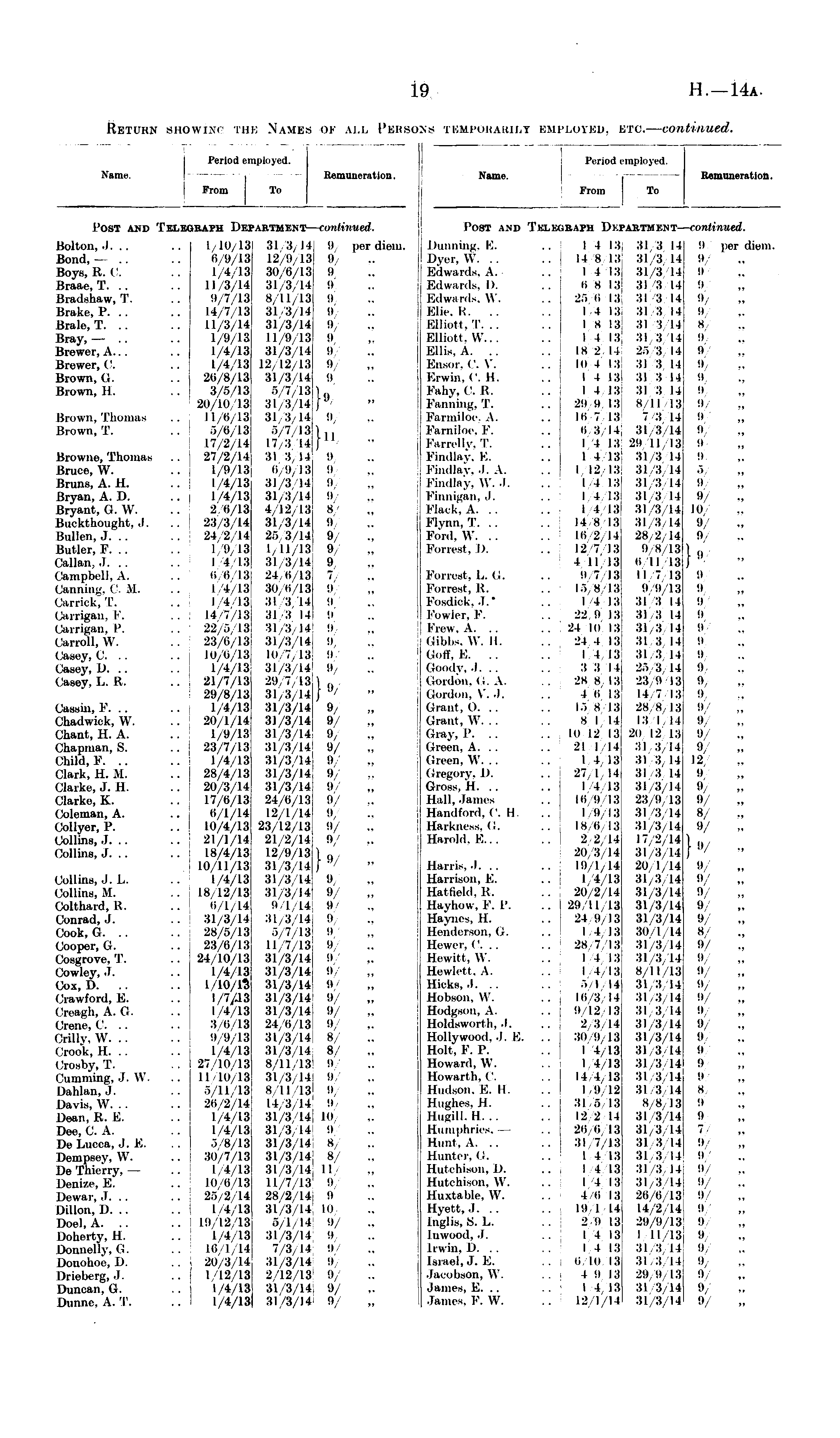 Xame. Period employed. ] From To KemuuoratioD. I'OST AND TEL] ieaph Dei •AKTMENT— innliimed: Bolton, J. .. Bond, — .. Boyn, R. C Braae, T. .. Bradshaw, T. Brake, P. .. Brale, T. . . Bray, — .. Brewer, A... Blower, ('. Brown, Q. Brown, H. I lo. L3 ii :i 13 1/4/13 11/3/14 ii 7 L3 II 7 13 11/3/14 I 9 IS 1/4/13 I I 13 26/8/13 3/5/13 20/10/13 II ii 13 5/6/13 17/2/14 27/2/14 1 li 13 1/4/13 1/4/13 2 6/13 ■i:\ :\ 14 24 -2 14 I li I." II 13 ii ii 13 I 4 13 I 4 13 14 7 13 22 5 13 23/6/13 10 8 13 1/4/13 21/7/13 29/8/13 1/4/13 20/1/14 1/9/13 23/7/13 1/4/13 28/4/13 20/3/14 17/6/13 (i/1/14 10/4/13 21/1/14 18/4/13 10/11/13 I 4/13 18/12/13 li I 14 31/3/14 28/5/13 23/6/13 24/10/13 1/4/13 1/10/19 i ; 13 i i 13 3 8 L8 ii ii 13 1/4/13 27/10/13 I1 hi 13 5/11/13 26 2 II 1/4/13 1/4/13 5/8/13 30/7/13 I I i:i in ii L3 25/2/14 I 4 13 III 12 L3 I 4 13 16 I 14 20/3/14 1/12/13 1/4/13 i i 13 31 3 If 12 9 13 .■)<> ii I.'I 31/3/14 8/11/13 31/3/14 31/3/14 11/9/13 31/3/14 L2 I l> 13 31 3 11 5/7/13 31/3/14 31/3/14 .-, 7 13 17 3 It 31 3 14 (i ii 13 31 3 i I 31 3 I I 4 I l> 13 31 3 14 26 3 14 1 II 13 :u 3/14 24 ii 13 30/H/13 31 3 14 31/3 14 31 :i 14 31/3 14 Id 7. L3 31 3 II 29 7 13 31 3 14 31/3/14 31/3/14 31 3, 14 31/3/14! 31/3/14 31/3/14 31/3/14 21 li 13 12/1/14 23/12/13 21/2/14 12/9/13 31/3/14 :si :f 14 31/3/14 9/1/14 31 :i II :, 7 i:! 11/7/13 31/3/14 31/3/14 31/3/14! 31/3/14! 31/3/14 ■li ii 13 31/3/14 31/3/14: 8/11/13 31/3/14 8/11/13 li 3 II 31 3 II 31 3 I I 31 3 I l 31/3/14J 31/3/14 H/7/13 1 28/2/14| 31/3/14! 5/1/14 31/3/14! 7/3/14 31/3/14 2 12 13 31/3/141 31/3/14' !t per diem. 9/ !• II 9 9 n '■i !l 9 9 ), , Brown, Thomas Brown, T. !i )■■ Browne, Thomas Bruce, W. Bruns, A. H. Bryan, A. D. Bryant, G. \V. Buckthought. .1. Bullen, J. .. Butler, 1". Callan, .1. . . Campbell. A. Canning, (.'. M. Carrkk, T. Carrigan, I , '. ( larrigan, P. Carroll, W. ('asey. ('. . . ( laeey, IJ. .. Casey, L. R. !t 9 9 s !l 9 9 9 7 II II II II II II !l !•■ •■ Casein, K. Chadwick, W. Chant, H. A. Chapman, S. Child, F. .. Clark, H. M. Clarke, J. H. Clarke, K. Coleman, A. Collyer, P. Collins, J. .. Collins, J. .. B 9/ II 9/ .. !i II II II. 9 9/ .. 9 }• ■• Collins, J. L. Collins, M. Colthard, R. Conrad, J. Cook,G. .. Cooper, G. < loegrove, T. Cowley, I. Cox, I). Crawford, E. Creagh, A. 0. Crene, ('. .. Crilly, W. Crook, H. . . Crosby, T. Cumming, J. W. Dahlan, J. Davis, W. .. Dean, B. E. Dee, C. A. De Luooa, J. E. Dempsey, W. Dβ Thierry, — Denize, E. Dewar, J. Dillon. D. .. Doel, A. .. Uoherty, H. Donnelly. Q. Donohoe, D. Drieberg, J. Duncan, G. Dunne. A. T. 9, 9/ .. 9 ii 11 9 it it 9 „ '•• li Q s " 8/ .. ii 5 :: I. 10 I' s 8/ .. 'J 9 in ii li ii ii B .. i 9/ •• 9/ ..