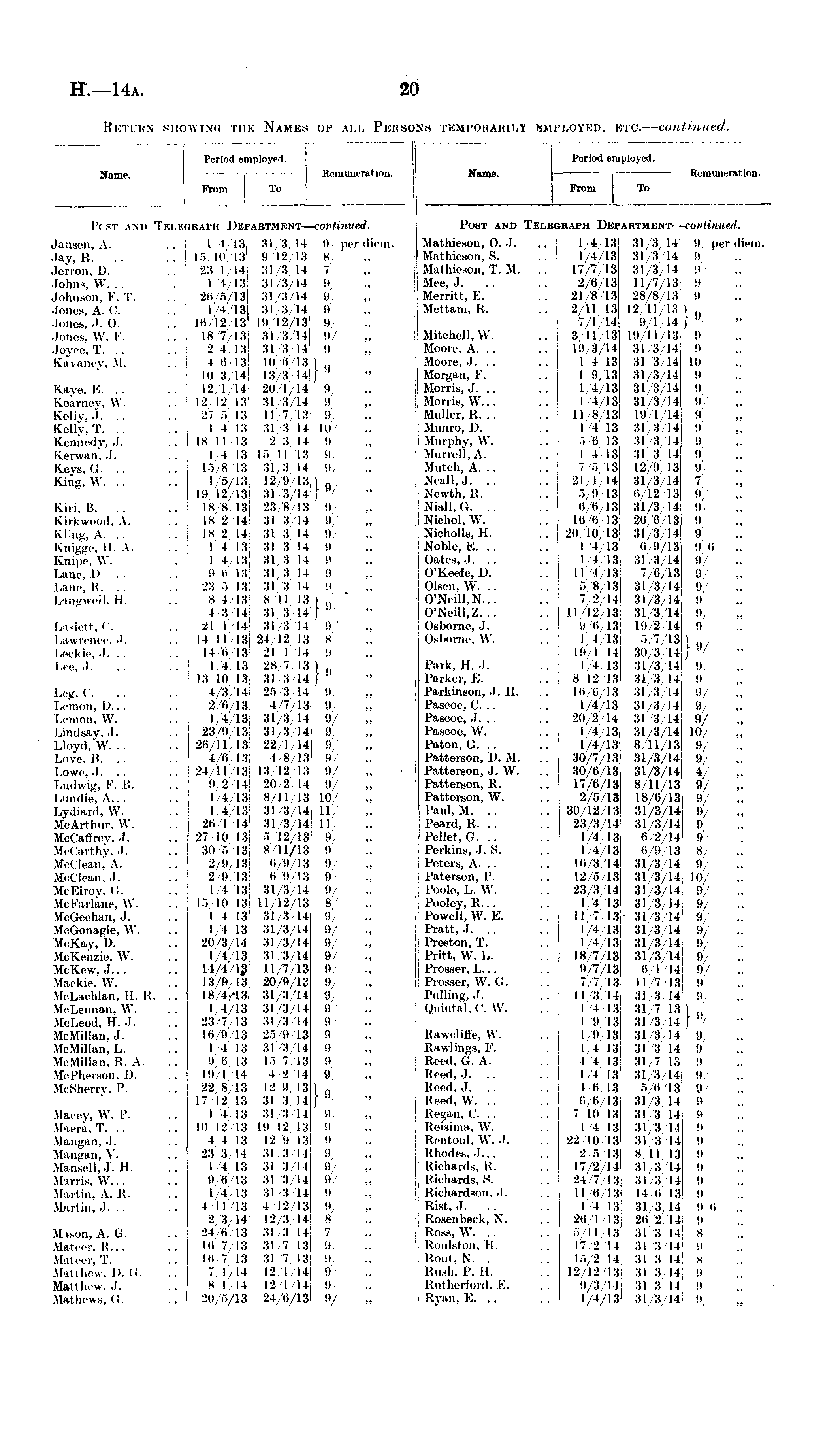 Period employed. N am e. - - lti'iininrmtion. From To Pcst am> Tkikchahi Dki-artmknt— continued. Jan«en, A. .. 1 L/4/18 31/3, 14 9 per diem. Jay, B. .. .. 15 io 13 it 12 13 8 .Ion on. D. .. 2:! I 14 31/3/14 7 Johns, W. .. .. I t 13 31/3/14 it Johnson, F. T. .. 2<> r>13 31 :i 14 i> Jones. A. <'. . . I 4 IS I!I :S 14 II Jones, .1. O. .. Hi 12 13 lit 12 13 '.» Jones, W. F. .. 18/7/13 31/3/141 9 Joyce, T. .. .. 2/4/13 31 3 14 i> Kavaney, M. .. I 8 13 Id ii 13 I 10 :s 14 13 :s 14 j •' Kaye, E. .. .. 12 1 II 20 I 14 i> Kearney, W. .. 12 12 1:! :il :f 14 9 Kelly, J. .. .. 27 r, I:! II 7 13 i> Kelly. T. .. . . 1/4/13 31 3 14 III Kennedy, .1. .. is II 13 2 :i 14 i> Kerwan, J. .. 1/4/13 15/11 13 !i Keys, <i. .. .. l"> 8 13 :il 3 II it Kin-, \V. .. .. I 5 13 12 it 13 ) Q/ 19 12 13 31 :s 14 } "/ Kiii. 15. .. .. 18/8/18 23/8/13 i> Kirkwood, A. .. is 2 14 31 :! 14 it Kling, A. .. .. 18 2 14 31 3 14 9 Knigge, II. A. .. I I 13 31 3 14 9 Knipe, W. .. 1/4 13 :il 3 14 9 l.:iur. I). .. .. 9 (i 13 31 3 14 9 Une, R. .. .. 23 5 13 31 3 14 9 Langwell, H. .. 8/4 13 8 II 13 | ,, 4 :i 14 :il 3 14 j ■ Laslctt.C. .. 21 I 14 :tl 3 I I 9 Lawrence. J. .. 14/11/13 24 12 13 8 Leokie.J. .. .. 14/6 13 21 I 14 9 Lee, J 1/4/13 28 7 18 I ,. 13 in 13 31 3 14 J ■' Leg, C. .. ■ ■ l/S/14 2."> :! 14 9 Lemon, D... . . 2/6/18 4 7 13 9 Lemon, W. .. 1/4/18 31 3 14 ii Lindsay, J. .. 2:! it 13 31 3 14 it Lloyd, W. .. .. 28/11/13 22/1/14 9 Love. B. .. .. t/6/13 4/8/13 9 Low. .1. .. .. 2; II 13 13 12 13 it Ludwig, K. B. .. 9/2/14 20 2 ! I it Lundie, A.. . .. t/4/18 8/11/13 10 Lydiard, W. .. 14 18 3J 3/14 II MoArthnr, W. .. 26 I 14 31 3 II II IfcCaffrey, J. .. 27 10 13 •"> 12, 13 it McCarthy, J. .. 30 6 18 8 11/13 it MoClean, A. .. 2 9 13 6 it 13 it MoClean, J. .. 2/9/13 6/9/13 9 MoElroy, Q. .. 1/4/13 31/3 14 it Me Karlane, \V. .. 15 lo 13 II 12 13 8 McGeehan, J. .. II 18 31 3 14 !)/ MoQonagle, W. .. 1/4/13 31 3 14 it McKay, D. .. 20 :S 14 :SI :! 14 it MoKenzie, W. .. 1/4/13 31/3/14 it MoKew.J... .. 14/4/15 11/7/18 it Maokie, W. .. 13 9 13 20 it 13 it MoLaohlan, H. K. .. 18 4,-13, 31 3 14 it MoLennan, W. .. II 13 :SI 3 14 9 MoLeod, H. J. .. 23 7 13 3] 3 14 it McMillan, J. .. 16/9/13 25/9/13 9 McMUlan, L. .. 1/4 13 31 3 II 9 McMillan, B. A. . . 9/6 13 15 7 13 it MoPhereon, D, .. l!),i 14 4 2 14 9 McSherry, P. .. 22,8 13 12 it 13} 17 12 13 31 3 14 f '' Maoey, W. P. .. 14 13 31 3 14 it M-lei-i'i. T. . . ..10 12 13 lit 12 13 !' Mangan, J. .. 4 t 13 12 ii 13 it Mangan, V. .. 23 3 14 31 3 14 it Mansell.J. B. .. 14 13 31 :( 14 it Minis. W... .. 9/6/18 31/3/14 it Martin, A. l<. .. 14 13 31 3/14 it Martin. J. .. .. 4 I 1 11! 4 12 13 it 2 3 14 12 3 14 8/ M won, A. G. .. 24 l> 13 31 3 14 7 Mateer, B... .. Mi 7 13 31 7 13 it Mateer, T. . . Mi 7 13 31 7 13 9 M rtthew, l>. Q. .. 7/1 14 12 1/14 9/ Mattlirw. J. .. s l 14 12 I 14 it MAthews, G. .. 20/5/13 24 11/13 9/