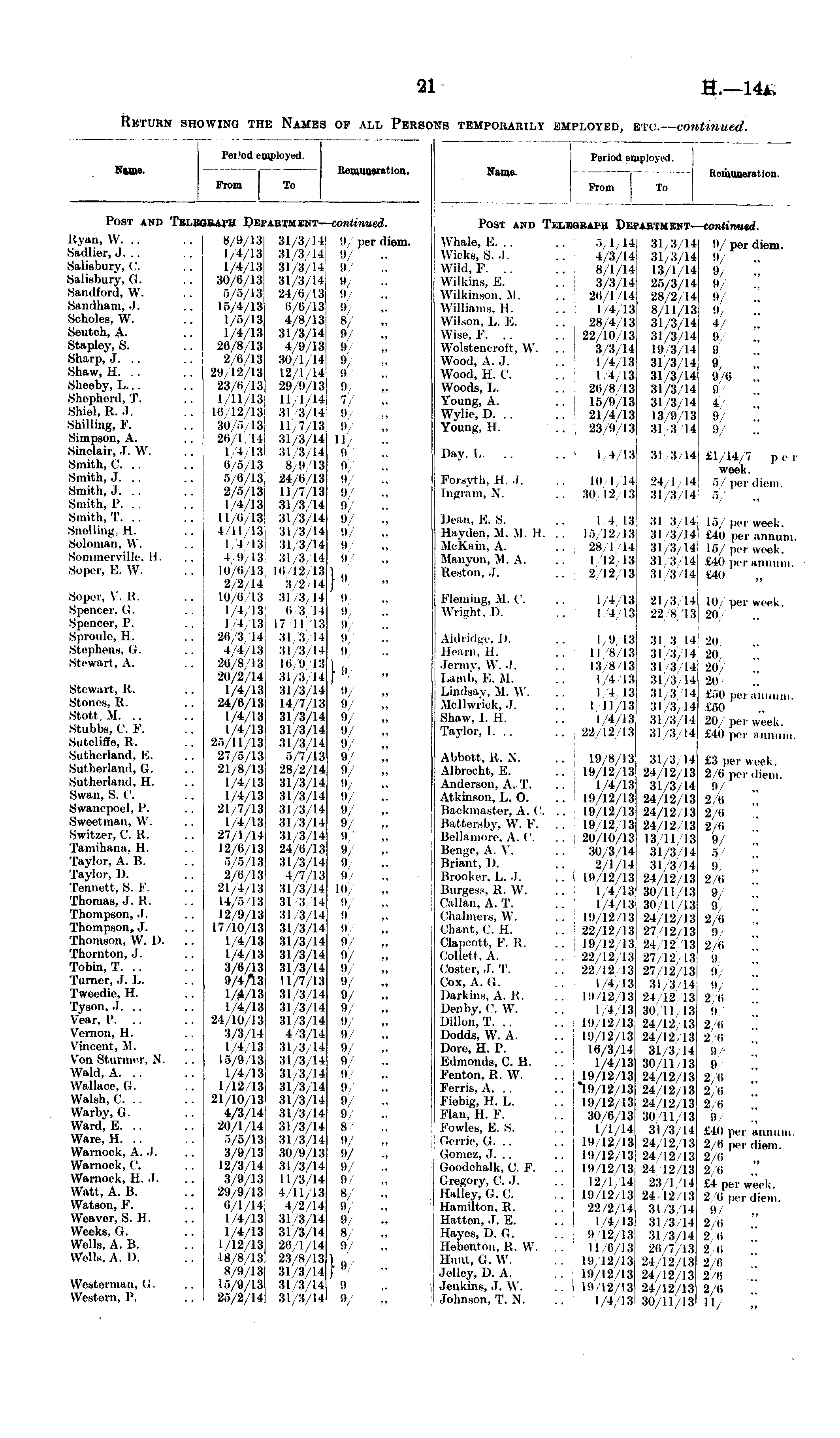 Name. I Period NBfloyed From To Kciiiuuorntion. Pogt ami Tklegkajmi Di:i MRTMENTniiilinued. Whale, B. .. .. •"> I 14 Wicks, S.J. .. l 3 II Wild, F. .. .. si ii Wilkine, E. .. 3/3/14 Wilkinson. M. .. 2<i I 14 Williams, ii. .. I 4 i:i Wilson, L. E. .. 28/4/18 Wise, J' , . .. .. 22/10 13 Woletencroft, W. .. 3 :i 14 Wood, A. .1. .. I J 18 Wood, H. C. .. 1/4/13 Woods, L. . . 26/8 13 Young, A. .. 15/9/13 Wylic, D. .. ..21/4/13 Younu'. H. .. 2.'! 9 13 :u :; 14 31/3/14 13/1/14 25/3/14 28/2/14 8/11/13 31/3/14 31/3/14 mi :t u 31 :i 11 :u :\ 11 ::i :: 14 ::i :i 14 13 !i 13 31 :t 14 9/ per diem. 1' 9 8 9 9 4 i) !t 9 !> Ii 0 t II 9 Day, L. .. .. i I 4 I:( 31 .( 14 £1/14/ 7 pei week. "1 ' per diem. 8 Forsyth, H.J. .. Id I 14 [ngram, X. .. 30 12 13 24 I 14 :;i :( 14 Dean, E. s. .. 14 13 II.mini. M. M. II. . . 16/12/13 McKain, A. .. 28/1/14 Manyon, M. A. .. 112 13 Eteeton, .1. .. 2/12 13 :tl 3 14 :si :; 14 :il :i 14 :si it 14 31 3 14 l.i pei week, t4n per annum. Iβ per week. t4(i per annum. £40 Fleming, M. C. .. 1/4/13 Wright, D. .. 1/4/13 21 I! 14 22 s 13 In per week. 211 Aldridge, I). .. 1/9/13 I l.-i in. LI. .. us Kt Jenny, W. J. .. 18/8/13 Lamb, E. M, .. 1/4/13 Lindsay, .\1. \Y. .. 1/4/13 MbHwrick, J. .. I II 13 Shaw, J . 11. .. 1/4/13 Taylor, I. . . .. 22/12/13 :si :j 14 :tl :s, 14 :il :i 14 ;:i :, 11 :ji :! 14 31 :i 11 31/3/14 31 3 14 20 2(1 2d £60 per annum. £50 20 per week. t!4o per annum. Abbott, I!. X. .. lii 8 13 Albreoht, E. .. 19/12/13 Anderson, A. T. .. Ill: , , Atkinson, L. O. .. 19/12/13 Baokmaster, A. C. .. 19/12/13 Battereby, W. F. .. 19/12/13 Bellamore, A. C. .. 20 10 13 Benge, A. V. .. 30 3 14 Briant, I). .. 8/1/14 Brooker, l>. J. .. ( 19/12/13 Burgess, R. W. .. 1/4/13 Callan. A. T. .. 1/4/13 Chalmers, W. .. 19/12/13 Chant, C. H. .. ; 22/12 13 Clapcott, F. R. .. I!) 12 13 Collett, A. .. 22/12/13 Coster, J. T. .. 22/12/13 Cox, A. G. ..I 4 13 Darkins, A. R. .. 19/12/13 Denby, C. W. .. 1/4/13 Dillon, T. .. ..1 liJ/12/13 Dodds, W. A. .. 19/12/13 Dore, B. P. .. 16/3/14 Edmonds, <:. II. .. 1/4/13 Fenton, R. \V. .. ; 19/12/13 Ferris, A. .. .. "10/12/13 Fiebig, II. I.. .. 19/12/13 Flau, }|. F. . . 1 30/6/13 Fowles, E. s. .. 1 1 14 Qerrie, G. .. .. 19/12/13 Gomez, .1. .. .. 19 12 13 Goodohalk, C. F. .. 19 12 13 Gregory, C.J. .. 12/1/14 Halley, G. C. .. I!) 12 13 Hamilton, R. .. | 22/2/14 Hatten, J. E. . . 1/4/13 Hayes, l>. G. .. 9/12/13 Hebenton, I:. W. .. ll/e 1:; Hunt, c. W. .. mi 12 1:; Jelley, D, A. .. 19/12/13 Jenkins, J. W. .. I 10/12/13 Johnson, T. N. .. 1/4/13 :fi :; 14 24 12 18 :;i :: 11 21 12 13 2i 12 13 24 12/13 13 II 13 :il :! 14 :tl :i 14 24 12 l.'! 30/11/13 :i(i 11 13 24/12/13 27 12/13 24 12 13 27 12 13 27 12 l.-i 31 3 ii 21 12 1:! .•ill II I:! 24 12 I.'! 24 12 13 :ji :t 14 :;n 11 1:; 21 12 13 24. 12/13 24 12 I:) 30 II 1:1 31/3/14 24 12 13 24 12 I.'! 24 12 13 2:; I II 24 12 13 ::i :i it :u :! 14 31/3/14 26 7 Mi 24/12/13 24/12/13 24/12/13 30 11/18 £3 per week. 2 ii per diem. !l 2 8 2 ii 2 Ii !l /> !) 2 Ii !l '.I 2 Ii 9 2/<i '.I 8 '.> 2 li .. 11 2 ii ■2 ii '■> ■ !i 2 ii .. 2 Ii 2 Ii (I t4o per annum. 2 (i per diem. - 8 ■2 ii II per ivitI, 2 ii per diem. !i ■2 li 2 li 2 (i 2 ii 2 li 2 li