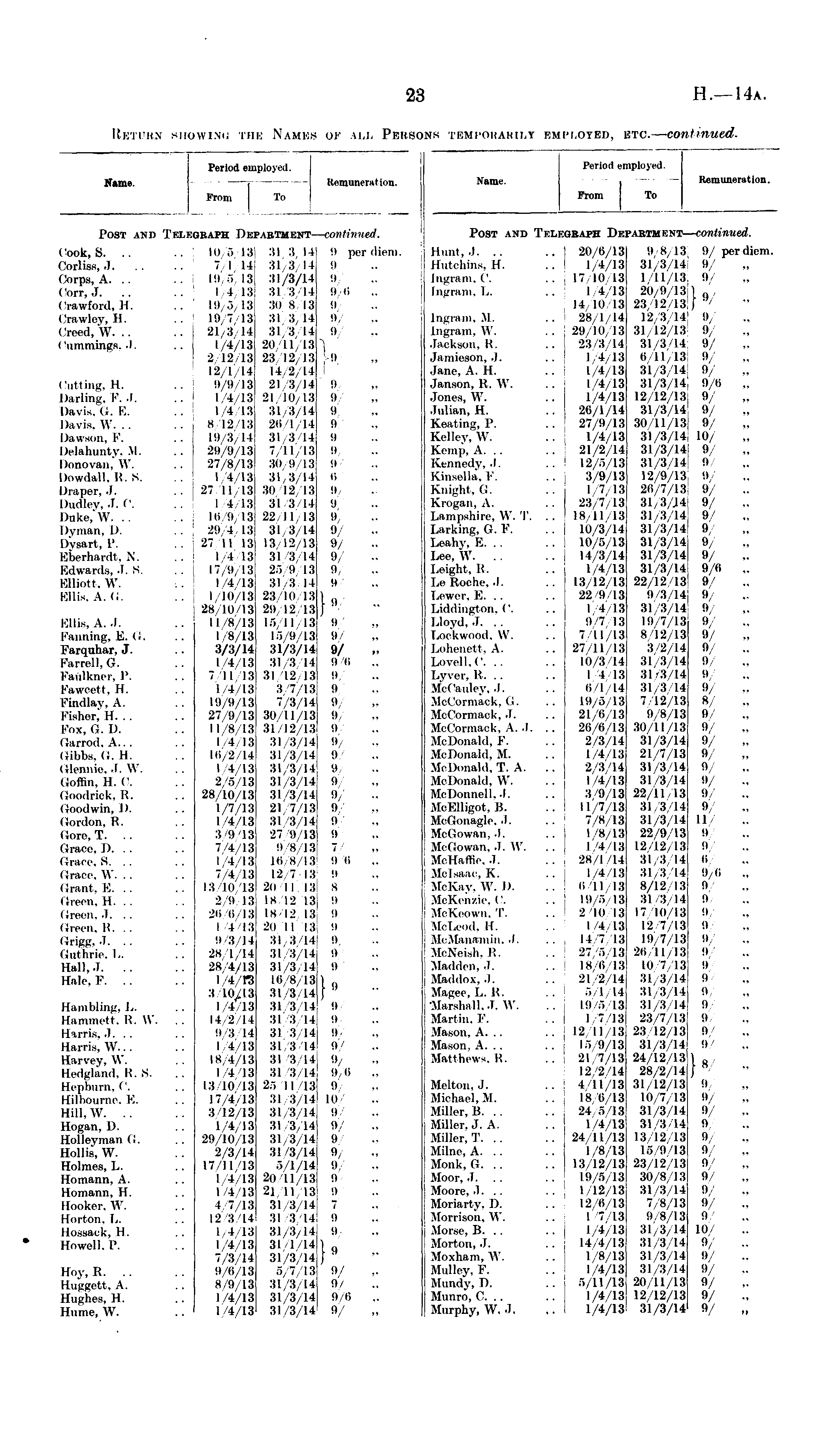 Name. Period employed. From To Remuneration. Post and Telei IBAPH DEI ■ARTMKNT--continued. limit,.I. .. Hutohins, II. [ngram, ('. .. IllL'iam. I,. 20/6/13 I 4 13 17 Id 13 I 4 13 14 III 13 28/1/14 211 10 13 23/3/14 I -t 13 1/4/13 L/4/13 i I 13 26/1/14 27/9/13 I t 13 21/2/14 12 S 13 3/9/13 I 7 13 23 7 13 18 II L3 10/3/14 10/5/13 14/3/14 1/4/13 13/12/13 22 II 13 I 4 13 Ii 7 13 7 II 13 27/11/13 in 3 II 1 4 13 6 I 14 iii e i3 21/6/13 2(1 (i 13 2/3/14 1/4/13 2 3 14 I I 13 3/9/13 11/7/13 7 S 13 1 S 13 1 I 13 2S I 14 1/4/13 Ii II 13 111 5 13 2 Ki 13 1/4/13 11 7 13 27 5 13 15 Ii 13 21 2 14 5 I 14 lit r, 13 I 7 13 12 II 13 16 9 13 21 7 13 12 2 14 4 II 13 IS Ii 13 24 r> 13 1/4/13 24/11/13 1/8/13 13/12/13 III .-) 13 1/12/13 12/6/13 I 7 13 I 1 13 It 4 13 1/8/13 1/4/13 5/11/13 I 1 13 1/4/13 ii s 13 31 3 11 I II 13 2u ii 13 23/12/13 12/3/14 31 L2 13 31/3/14 11 II 13 :ti :i 14 31/3/14J 12 \2 13 31 3 14 30 11 13 31/3/14i 31/3/14 31/3/14 12/9/13 26/7/13 31/3/J4 .11 3 14 31/3/141 31/3/14 31 3 14 31/3/14 22/12/13 it 3 14 31/3/14 Hi 7 L3 8/12/13 3 2 14 31 3 14 31 3 14 :si :i 14 7/12/13 9/8/13 30/11/13 31/3/14 21/7/13 31/3/14 31 :) 14 22 II 13 :si :» 14 31 3 14 22/9/13 L2 L2 13 :{| 3 14 31/3 14 8/12/13 31 3 14 17 1(1 13 12 7 1:1 19/7/13 26 II 13 Id 7 13 31/3/14 31/3/14 31 3 14 23/7/13 2:\ 12 13 31 3 it 24/12/13 28/2/14 31/12/13 in 7 13 31/3/14 :ti 3 14 l.T 12 LS 16 it 13 23 12/13 30/8/13 31/3/14 7/8/13 9/8/13 31 3 14 31/3/14 31/3/14 31/3/14 20/11/13 12/12/13 31/3/14 9/ per diem. 9, I" - [ngram, M. Ingram. W. Jaokson, I!. Jamieeon, J. Jane, A. H. Janson, R. W. .. : Jonee, W. Julian, H. I , . Kelley, W. .. ; Kemp. A. . . .. ' Kennedy, .1. .. ! Kjnselia. I ,- . .. i Knight, G. Krogan, A. Lampehire, W. T. Larking, (!. V. Leahy, E. .. Lee, W. .. Leight, B. Lβ Roche J. Lewer, E. . . Liddington, ('. Lloyd, J. .. Lookwood, W. Lohenett, A. Lovell.C. .. Lyver, K. .. \1( (!auley, J. Mc( lormack, Q. McCormack, J. McCormack. A. .1. .. McDonald, V. McDonald. M. McDonald.'I'. A. .. McDonald. \V. McDonnell, J. .McKlli.L'ot. I'.. MoGonagle, .1. .. J MoGowan, I. McGowan, .1. W. McHaflie. .1. Mclsaac. K. McKay. \V. D. MoKenzfe, C. McKcown. 'I'. McLeod, II. McManamin. .1. McNeisli. R. Madden, .1. Maddox, .1. Magee, L. It. Marshall, J. \V. Martin, I-'. Mason, A... .. j Mason, A. .. .. | Matthews, R. 9, 9/ .. 9/ .. 9/ .. 9/ .. 9/6 .. 9/ .. 9 9 10/ 9/ „ H II 9/ .. 9/ .. 6 !) 9/ .. 9/ .. 9/6 .. 9/ i> 9 9/ .. 9/ „ '.I !» !• 9 8/ .. 9/ „ 9/ .. 9/ „ 9/ „ II 9 H it II !l it I) It 6 it' II '.I g g g 9/ !• !• !» i> II 1» - Melton, J. Michael. M. .. ! .Miller. B. .. Miller, J. A. Miller. 'I'. .. Milne, A. .. Monk, (i. Moor, J. .. Moore, .1... Moriarty, D. Morrison. W. Morse, 15. .. Morton, J. Moxham, W. Mill ley, F. Muiidy, D. Munro, C. .. Murphy, W.J, II II II !) 9 it 9 9 it 9/ .. 9/ HI II II it 9/ ,. 9/ ., 9/ „
