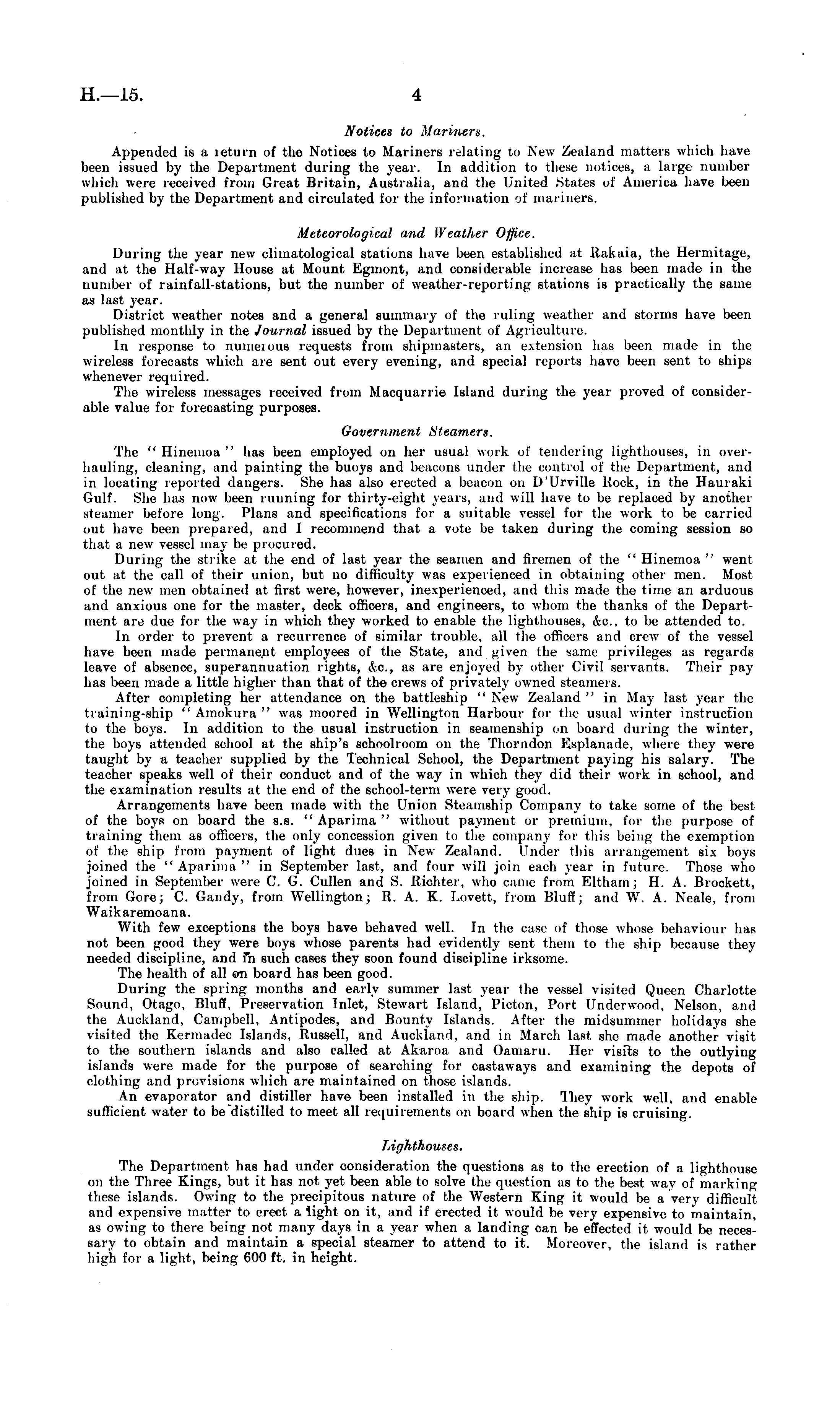 Notices to Mariners. Appended is a leturn of the Notices to Mariners relating to New Zealand matters which have been issued by the Department during the year. In addition to these notices, a large number which were received from Great Britain, Australia, and the United States of America have been published by the Department and circulated for the information of mariners. Meteorological and Weather Office. During the year new climatological stations have been established at Rakaia, the Hermitage, and at the Half-way House at Mount Egmont, and considerable increase has been made in the number of rainfall-stations, but the number of weather-reporting stations is practically the same as last year. District weather notes and a general summary of the ruling weather and storms have been published monthly in the Journal issued by the Department of Agriculture. In response to numeious requests from shipmasters, an extension has been made in the wireless forecasts which are sent out every evening, and special reports have been sent to ships whenever required. The wireless messages received from Macquarrie Island during the year proved of considerable value for forecasting purposes. Government Steamers. The " Hinemoa " has been employed on her usual work of tendering lighthouses, in overhauling, cleaning, and painting the buoys and beacons under the control of the Department, and in locating reported dangers. She has also erected a beacon on D'Urville Rock, in the Hauraki Gulf. She has now been running for thirty-eight years, and will have to be replaced by another steamer before long. Plans and specifications for a suitable vessel for the work to be carried out have been prepared, and I recommend that a vote be taken during the coming session so that a new vessel may be procured. During the strike at the end of last year the seamen and firemen of the " Hinemoa " went out at the call of their union, but no difficulty was experienced in obtaining other men. Most of the new men obtained at first were, however, inexperienced, and this made the time an arduous and anxious one for the master, deck officers, and engineers, to whom the thanks of the Department are due for the way in which they worked to enable the lighthouses, etc., to be attended to. In order to prevent a recurrence of similar trouble, all the officers and crew of the vessel have been made permanent employees of the State, and given the same privileges as regards leave of absence, superannuation rights, &c, as are enjoyed by other Civil servants. Their pay has been made a little higher than that of the crews of privately owned steamers. After completing her attendance on the battleship " New Zealand " in May last year the training-ship " Amokura " was moored in Wellington Harbour for the usual winter instruction to the boys. In addition to the usual instruction in seamenship on board during the winter, the boys attended school at the ship's schoolroom on the Thorndoii Rsplanade, where they were taught by a teacher supplied by the Technical School, the Department paying his salary. The teacher speaks well of their conduct and of the way in which the} 7 did their work in school, and the examination results at the end of the school-term were very good. Arrangements have been made with the Union Steamship Company to take some of the best of the boys on board the s.s. " Aparima " without payment or premium, for the purpose of training them as officers, the only concession given to the company for this being the exemption of the ship from payment of light dues in New Zealand. Under this arrangement six boys joined the "Aparima" in September last, and four will join each year in future. Those who joined in September were C. G. Cullen and S. Richter, who came from Eltham; H. A. Brockett, from Gore; C. Gandy, from Wellington; R. A. K. Lovett, from Bluff; and W. A. Neale, from Waikaremoana. With few exceptions the boys have behaved well. In the case of those whoso behaviour has not been good they were boys whose parents had evidently sent them to the ship because they needed discipline, and fh such cases they soon found discipline irksome. The health of all on board has been good. During the spring months and early summer last year the vessel visited Queen Charlotte Sound, Otago, Bluff, Preservation Inlet, Stewart Island, Picton, Port Underwood, Nelson, and the Auckland, Campbell, Antipodes, and Bounty Islands. After the midsummer holidays she visited the Kcrniadec Islands, Russell, and Auckland, and in March last she made another visit to the southern islands and also called at Akaroa and Oamaru. Her visits to the outlying islands were made for the purpose of searching for castaways and examining the depots of clothing and provisions which are maintained on those islands. An evaporator and distiller have been installed in the ship, lhey work well, and enable sufficient water to be distilled to meet all requirements on board when the ship is cruising. Lighthouses. The Department has had under consideration the questions as to the erection of a lighthouse on the Three Kings, but it has not yet been able to solve the question as to the best way of marking these islands. Owing to the precipitous nature of the Western King it would be a very difficult and expensive matter to erect a light on it, and if erected it would be very expensive to maintain, as owing to there being not many days in a year when a landing can be effected it would be necessary to obtain and maintain a special steamer to attend to it. Moreover, the island is rather high for a light, being 600 ft. in height.