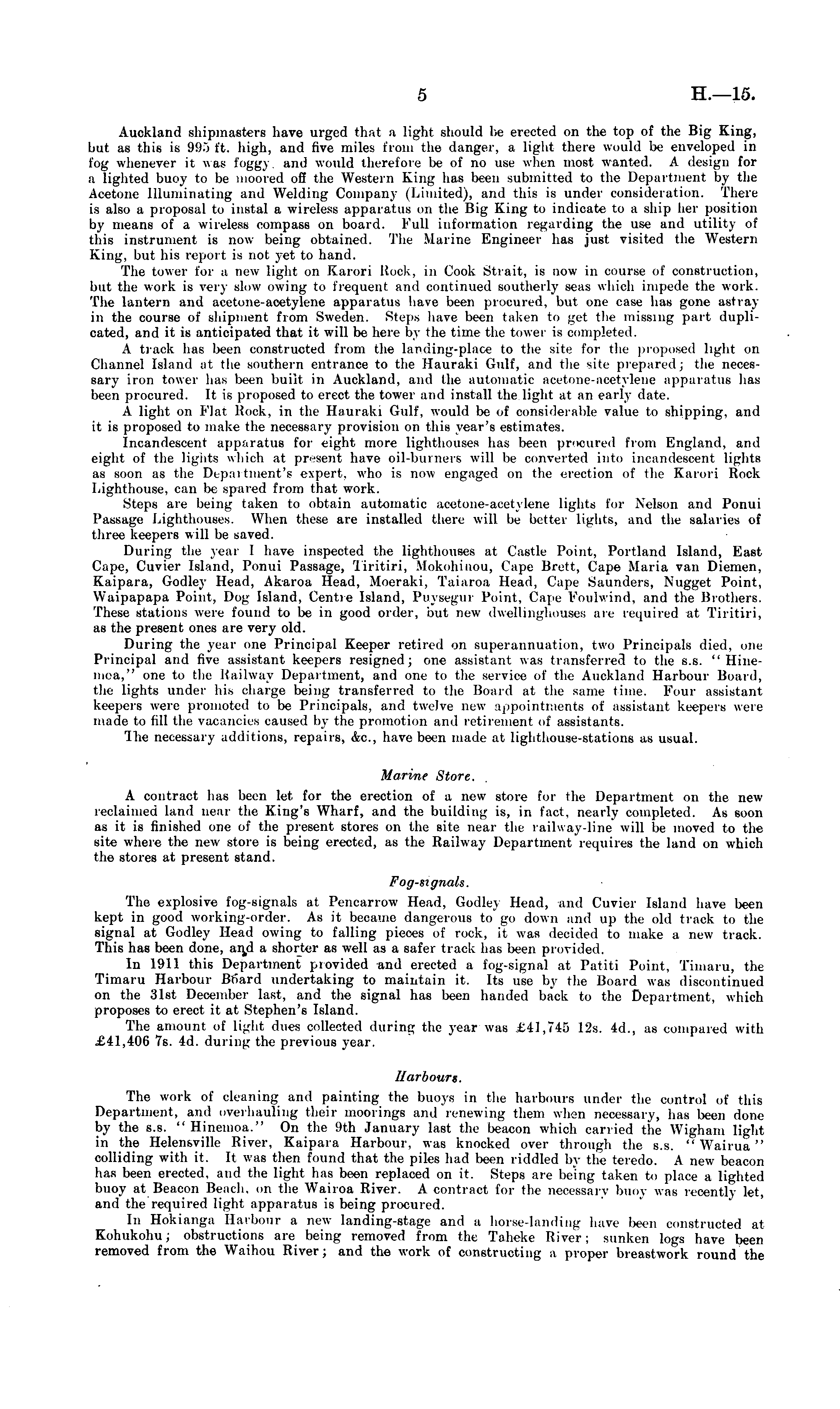 Auckland shipmasters have urged that a light should he erected on the top of the Big King, but as this is 995 ft. high, and five miles from the danger, a light there would be enveloped in fog whenever it was foggy and would therefore l>e of no use when most wanted. A design for a lighted buoy to be moored off the Western King iias been submitted to the Department by the Acetone Illuminating and Welding Company (Limited), and this is under consideration. There is also a proposal to instal a wireless apparatus on the Big King to indicate to a ship her position by means of a wireless compass on board. Full information regarding the use and utility of this instrument is now being obtained. The Marine Engineer has just visited the Western King, but his report is not yet to hand. The tower for a new light on Karori Rook, in Cook Strait, is now in course of construction, but the work is very glow owing to frequent and continued southerly seas which impede the work. The lantern and acetone-acetylene apparatus have been procured, but one ease has gone astray in the course of shipment from Sweden. Steps have been taken to get the missing part duplicated, and it is anticipated that it will be here by the time the tower is completed. A track has been constructed from the landing-place to the site for the proposed light on Channel Island at the southern entrance to the Hauraki Gulf, and the site prepared; the necessary iron tower has been built in Auckland, and the automata acetone-acetylene apparatus has been procured. It is proposed to erect the tower and install the light at an early date. A light on Flat Rook, in the Hauraki Gulf, would be of considerable value to shipping, and it is proposed to make the necessary provision on this year's estimates. Incandescent apparatus for eight more lighthouses has been procured from England, and eight of the lights whioh at present have oil-burners will be converted into incandescent lights as soon as the Department's expert, who is now engaged on the erection of the Karori Rock Lighthouse, can be spared from that work. Steps are being taken to obtain automatic acetone-acetylene lights for Nelson and Ponui Passage Lighthouses. When these are installed there will be better lights, and the salaries of three keepers will be saved. During the year I have inspected the lighthouses at Castle Point, Portland Island, East Cape, Cuvier Island, Ponui Passage, liritiri, Mokohinou, (ape Brett, Cape Maria van Diemeii. Kaipara, Godley Head, Akaroa Head, Moeraki, Taiaroa Head, Cape Saunders, .Nugget Point, Waipapapa Point, Dog Island, Centre Island, Puysegui , Point, Cape Foulwind, and the Brothers. These stations were found to be in good order, but new dwellinghouses are required at Tiritiri, as the present ones are very old. During the year one Principal Keeper retired on superannuation, two Principals died, one Principal and five assistant keepers resigned; one assistant was transferred to the s.s. " Hinemoa," one to the Railway Department, and one to the service of the Auckland Harbour Board, the lights under his charge being transferred to the Board at the same time. Four assistant keepers were promoted to be Principals, and twelve new appointments of assistant keepers were made to fill the vacancies caused by the promotion and retirement of assistants. The necessary additions, repairs, &c, have been made at lighthouse-stations as usual. Marine Store. A contract lias been let for the erection of a new store for the Department on the new reclaimed land near the King's Wharf, and the building is, in fact, nearly completed. As soon as it is finished one of the present stores on the site near the railway-line will lie moved to the site where the new store is being erected, as the Railway Department requires the land on which the stores at present stand. Fog-signals. The explosive fog-signals at Pencarrow Head, Godley Head, and Cuvier Island have been kept in good working-order. As it became dang< runs to go down and up the old track to the signal at Godley Head owing to falling pieces of rock, it was decided to make a new track. This has been done, ami a shorter as well as a safer track has been provided. In 1911 this Department provided and erected a fog-signal at Patiti Point, Timaru, the Timaru Harbour Board undertaking to maintain it. Its use by the Board was discontinued on the 31st December last, and the signal has been handed back to the Department, which proposes to erect it at Stephen's Island. The amount of light dins collected during the year was £41,745 12s. 4d., as eumpared with £41,406 7s. 4d. during the previous year. Harbours. The work of cleaning and painting the buoys in the harbours under the control of this Department, and overhauling their moorings and renewing them when necessary, has been done by the s.s. " Hinemoa." On the 9th January last the beacon which carried the Wigham light in the Helensville River, Kaipara Harbour, was knocked over through the s.s. " Wairua " colliding with it. It was then found that the piles had been riddled by the teredo. A new beacon lias been erected, and the light has been replaced on it. Steps arc being taken to place a lighted buoy at Beacon Beach, on the Wairoa River. A contract for the necessary buoj was recently let, and the required light apparatus is being procured. In Hokianga Harbour a new landing-stage and a horse-landing have been constructed at Kohukohu; obstructions are being removed from the Taheke River; sunken logs have been removed from the Waihou River; and the work of constructing a proper breastwork round the
