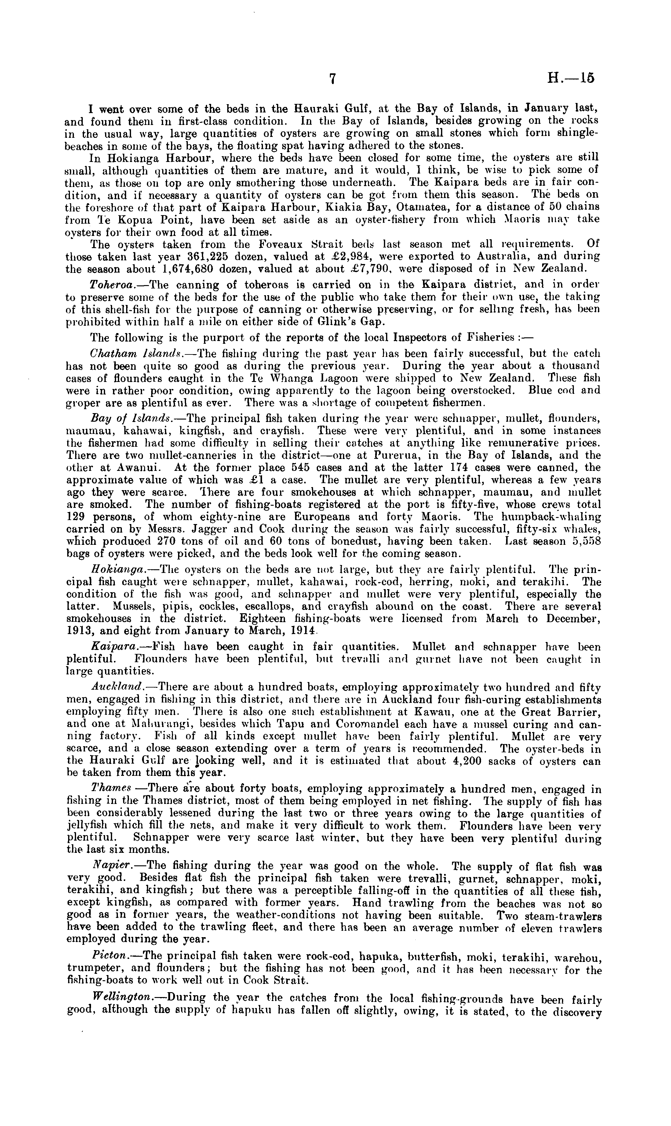 I went over some of the beds in the Hauraki Gulf, at the Bay of Islands, in January last, and found them ill first-class condition. In the Bay of Islands, besides growing on the rocks in the usual way, large quantities of oysters are growing on small stones which form shinglebeaches in some of the bays, the flouting spat having adhered to the stones. In Hokianga Harbour, where the beds have been closed for some time, the oysters are still small, although quantities of them are mature, and it would, I think, be wise to pick some of them, as those on top are only smothering those underneath. The Kaipara beds are in fail- condition, and if necessary a quantity of oysters can be got from them this season. The beds on the foreshore of that part of Kaipara Harbour, Kiakia Bay, Otamatea, for a distance of 50 chains from Te Kopua Point, have been set aside as an oyster-fishery from which Maoris may take oysters for their own food at all times. The oysters taken from the Foveaux Strait beds last season met all requirements. Of those taken last year 361,225 dozen, valued at £2,984, were exported to Australia, and during the season about 1,674,680 dozen, valued at about £7,790, were disposed of in New Zealand. Toheroa. —The canning of toheroas is carried on in the Kaipara district, and in order to preserve some of the beds for the use of the public who take them for their own use, the taking of this shell-fish for the purpose of canning or otherwise preserving, or for selling fresh, has been prohibited within half a mile on either side of Glink's Gap. The following is the purport of the reports of the local Inspectors of Fisheries : — Chatham /slant/x. —The fishing during the past year has been fairly successful, but the catcli has not been quite so good as during the previous year. During the year about a thousand cases of flounders caught in the Te Whanga Lagoon were shipped to New Zealand. These fish were in rather poor condition, owing apparently to the lagoon being overstocked. Blue cod and groper are as plentiful as ever. There was a shortage of competent fishermen. Bay of Islands. —The principal fish taken during the year were schnapper, mullet, flounders, maumau, kahawai, kingfish, and crayfish. These were very plentiful, and in some instances the fishermen had some difficulty in selling their catches at anything like remunerative prices. There are two mullet-canneries in the district —one at Purerua, in the Bay of Islands, and the other at Awanui. At the former place 545 cases and at the latter 174 cases were canned, the approximate value of which was £1 a case. The mullet arc very plentiful, whereas a few years ago they were scarce, lliere are four smokehouses at which schnapper, maumau, and mullet are smoked. The number of fishing-boats registered at the port is fifty-five, whose crews total 129 persons, of whom eighty-nine are Europeans and forty Maoris. The humpback-whaling carried on by Messrs. Jagger and Cook during the season was fairly successful, fifty-six whales, which produced 270 tons of oil and 60 tons of bonedust, having been taken. Last season 5,558 bags of oysters were picked, and the beds look well for the coming season. Hokianga. —The oysters on the beds are not large, but they are fairly plentiful. The principal fish caught were schnapper, mullet, kahawai, rock-cod, herring, moki, and terakihi. The condition of the fish was good, and schnapper and mullet were very plentiful, especially the latter. Mussels, pipis, cockles, escallops, and crayfish abound on the coast. There are several smokehouses in the district. Eighteen fishing-boats, were licensed from March to December, 1913, and eight from January to March, 1914 Kaipara. —Fish have been caught in fair quantities. Mullet and schnapper have been plentiful. Flounders have been plentiful, but trevalli and gurnet have not been caught in huge quantities. Auckland. —There are about a hundred boats, employing approximately two hundred and fifty men, engaged in fishing in this district, and there are in Auckland four fish-curing establishments employing fifty men. There is also one such establishment at Kawau, one at the Great Barrier, and one at Mahurungi, besides which Tapu and Coromandel each have a mussel curing and canning factory. Fish of all kinds except mullet have been fairly plentiful. Mullet are very scarce, and a close season extending over a term of years is recommended. The oyster-beds in the Hauraki Gi;lf are looking well, and it is estimated that about 4,200 sacks of oysters can be taken from them this year. Thames ■ —There are about forty boats, employing approximately a hundred men, engaged in fishing in the Thames district, most of them being employed in net fishing. The supply of fish has been considerably lessened during the last two or three years owing to the large quantities of jellyfish which fill the nets, and make it very difficult to work them. Flounders have been very plentiful. Schnapper were very scarce last winter, but they have been very plentiful during the last six months. Napier. —The fishing during the year was good on the whole. The supply of flat fish was very good. Besides flat fish the principal fish taken were trevalli, gurnet, schnapper, moki, terakihi, and kingfish; but there was a perceptible falling-off in the quantities of all these fish, except kingfish, as compared with former years. Hand trawling from the beaches was not so good as in former years, the weather-conditions not having been suitable. Two steam-trawlers have been added to the trawling fleet, and there has been an average number of eleven I ravlers employed during the year. Picton. —The principal fish taken were rock-cod, hapuka, butterfish, moki, terakihi, warehou, trumpeter, and flounders; but the fishing has not been good, and it has been necessary for the fishing-boats to work well out in Cook Strait. Wellington.— During the year the catches from the local fishing-grounds have been f