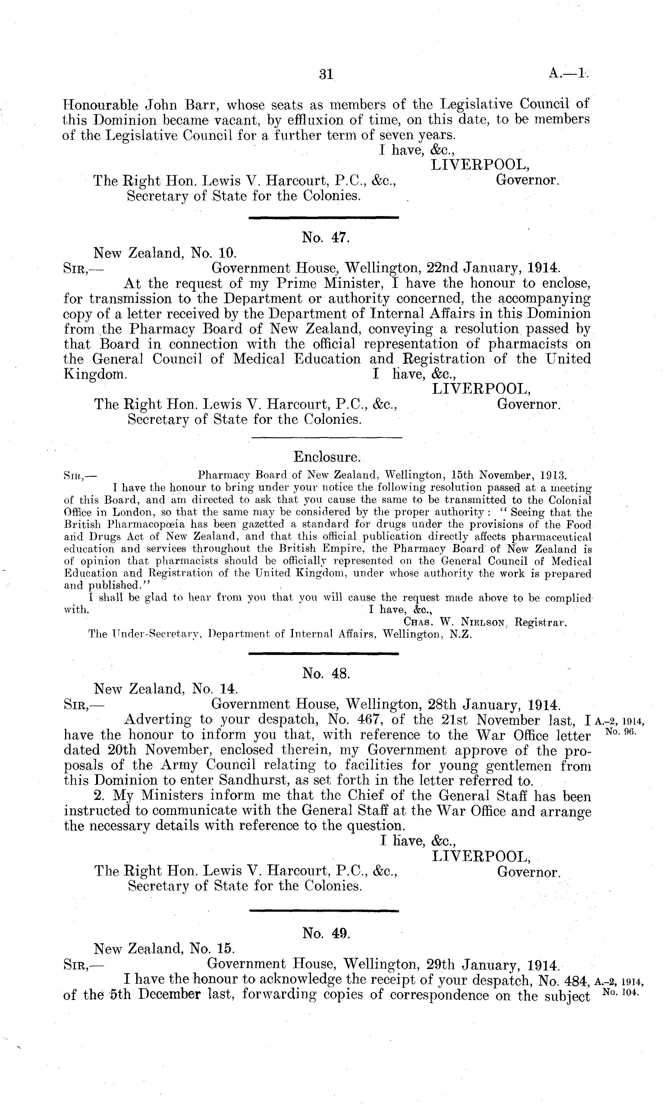 No. 47. New Zealand, No. 10. Sir, — Government House, Wellington, 22nd January, 1914. At the request of my Prime Minister, I have the honour to enclose, for transmission to the Department or authority concerned, the accompanying copy of a letter received by the Department of Internal Affairs in this Dominion from the Pharmacy Board of New Zealand, conveying a resolution passed by that Board in connection with the official representation of pharmacists on the General Council of Medical Education and Registration of the United Kingdom. I have, &c, LIVERPOOL, The Right Hon. Lewis V. Harcourt, P.C., &c, Governor. Secretary of State for the Colonies.