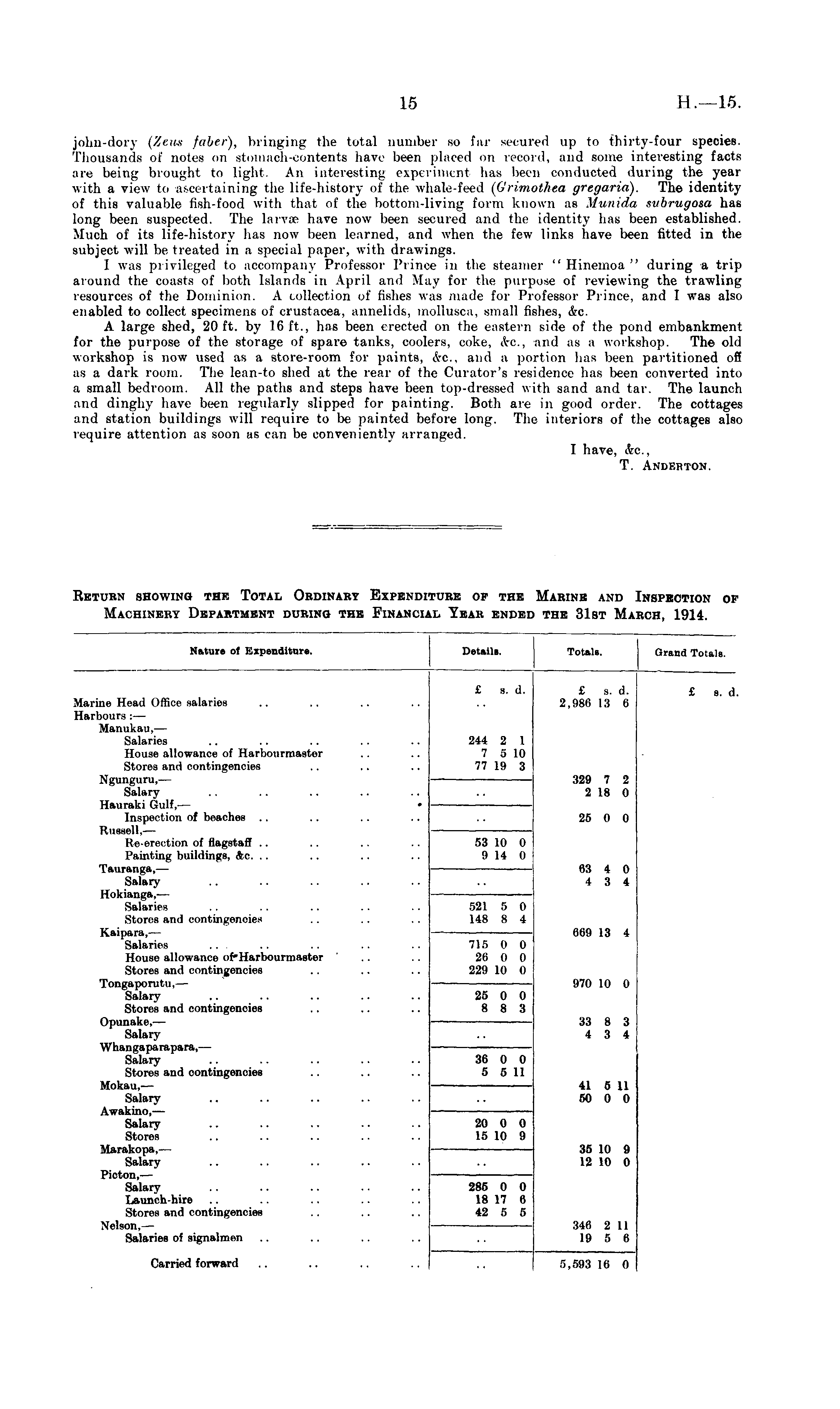 john-dory (Zetu faber), bringing the tutal number so far secured up to thirty-four species. Thousands of notes on stomach-contents have been placed on record, and some interesting facts :ire being brought to light. An interesting experiment has been conducted during the year with a view to ascertaining the life-history of the whale-feed (Grimothea gregaria). The identity of this valuable fish-food with that of the bottom-living form known as Munida mibrugosa has long been suspected. The larvae have now been secured and the identity has been established. Much of its life-history has now been learned, and when the few links have been fitted in the subject will be treated in a special paper, with drawings. I was privileged to accompany Professor Prince in the steamer " Hinemoa " during a trip around the coasts of both Islands in April and May for the purpose of reviewing the trawling resources of the Dominion. A collection of fishes was made for Professor Prince, and I was also enabled to collect specimens of crustacea, annelids, mollusca. small fishes, &c. A large shed, 20 ft. by 16 ft., has been erected on the eastern side of the pond embankment for the purpose of the storage of spare tanks, coolers, coke, <fee, and as a workshop. The old workshop is now used as a store-room for paints, &0., and a portion lias been partitioned off as a dark room. The lean-to shed at the rear of the Curator's residence lias been converted into a small bedroom. All the paths and steps have been top-dressed with sand and tar. The launch and dinghy have been regularly slipped for painting. Both are in good order. The cottages and station buildings will require to be painted before long. The interiors of the cottages also require attention as soon as can be conveniently arranged. I have, eve, T. Anderton.