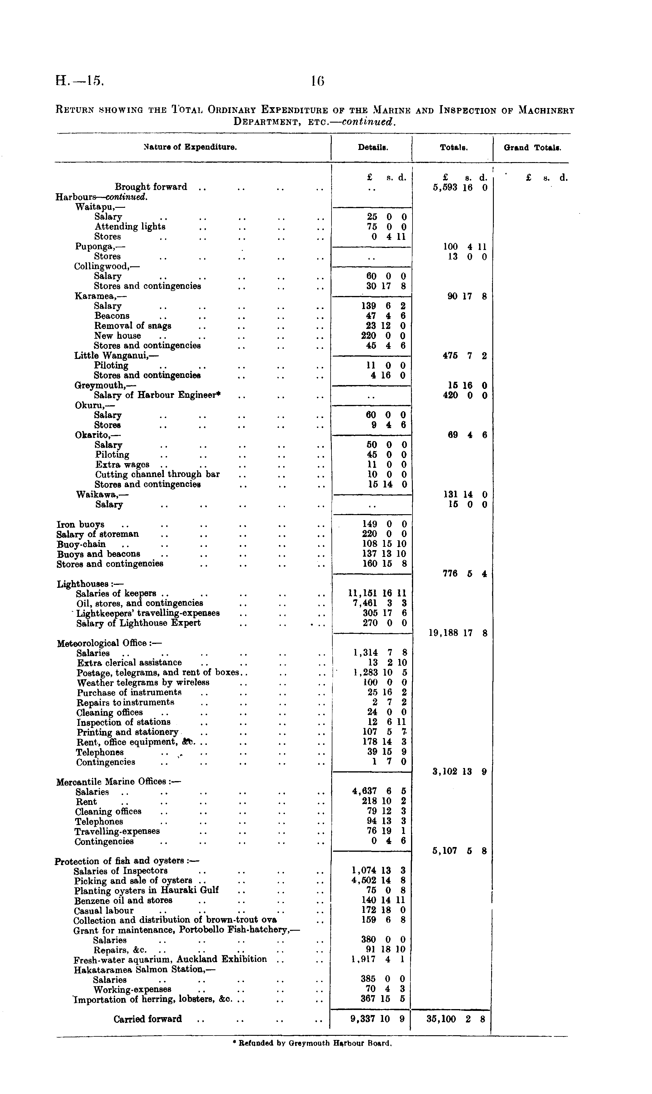 Nature of Expenditure. Details. Totals. Grand Totals. £ 8. d. £ s. d. 5,593 16 0 £ s. d. Brought forward Harbours — continued. Waitapu,— Salary Attending lights Stores 25 0 0 75 0 0 0 4 11 Puponga,— Stores Collingwood,— Salary Stores and contingencies Karamea, — Salary Beacons Removal of snags New house Stores and contingencies Little Wanganui,— Piloting Stores and contingencies Greymouth,— Salary of Harbour Engineer* Okuru,— Salary Stores Okarito, — Salary Piloting Extra wages Cutting channel through bar Stores and contingencies Waikawa, — Salary 139 6 2 47 4 6 23 12 0 220 0 0 45 4 6 60 0 0 30 17 8 11 0 0 4 16 0 100 4 11 13 0 0 90 17 8 475 7 2 15 16 0 420 0 0 60 0 0 9 4 6 69 4 6 50 0 0 45 0 0 11 0 0 10 0 0 15 14 0 131 14 0 16 0 0 Iron buoys Salary of storeman Buoy-chain Buoys and beacons Stores and contingencies 149 0 0 220 0 0 108 15 10 137 13 10 160 15 8 Lighthouses: — Salaries of keepers Oil, stores, and contingencies Lightkeepers' travelling-expenses Salary of Lighthouse Expert 776 5 4 11,151 16 11 7,461 3 3 305 17 6 270 0 0 19,188 17 8 Meteorological Office : — Salaries Extra clerical assistance Postage, telegrams, and rent of boxes.. Weather telegrams by wireless Purchase of instruments Repairs to instrument s (/leaning offices Inspection of stations Printing and stationery Rent, office equipment, Sft. Telephones • • ,- Contingencies 1,314 7 8 13 2 10 1,283 10 5 L00 0 0 25 16 2 2 7 2 24 0 0 12 6 11 107 5 7 178 14 3 39 15 9 1 7 0 Mercantile Marine Offices :— Salaries Rent Cleaning offices Telephones Travelling-expenses Contingencies 4,637 6 5 218 10 2 79 12 3 94 13 3 76 19 1 0 4 6 3,102 13 9 5,107 5 8 Protection of fish and oysters :— Salaries of Inspectors Picking and sale of oysters Planting oysters in Hauraki Gulf Benzene oil and stores Casual labour Collection and distribution of brown-trout ova Grant for maintenance, Portobello Fish-hatchery,— Salaries Repairs, &c. Fresh-water aquarium, Auckland Exhibition . . Hakataramea Salmon Station, — Salaries Working-expenses I mportation of herring, lobsters, &c. 1,074 13 3 4,502 14 8 75 0 8 140 14 11 172 18 0 159 6 8 380 0 0 91 18 10 1,917 4 1 385 0 0 70 4 3 367 15 5 Carried forward 9,337 10 9 35,100 2 8 • Refunded by Oreymouth Harbour Itoarii.