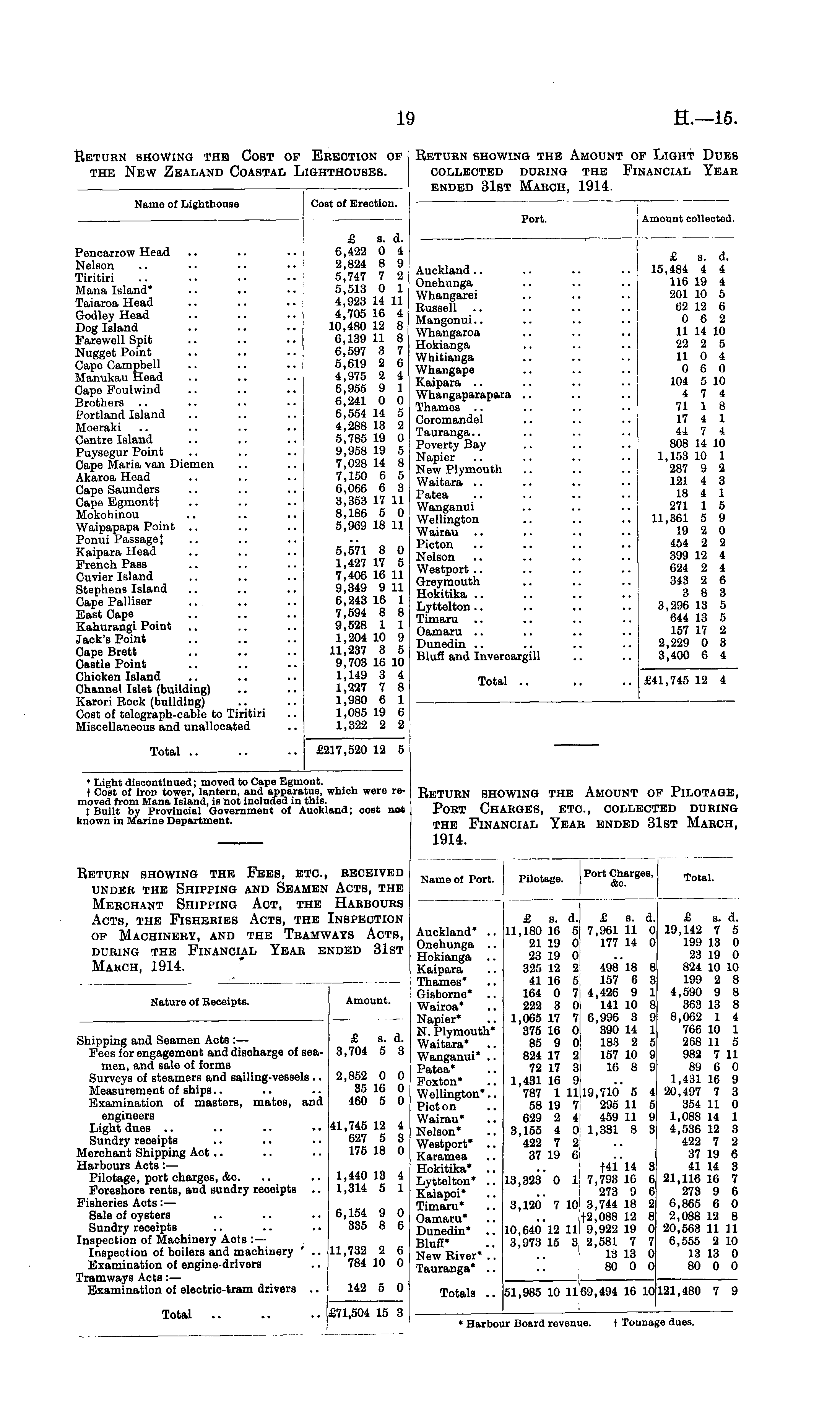 Name of Port. Pilotage. Port Charges, &c. Total. Auckland* .. Onehunga .. Hokianga .. Kaipara Thames* Gisborne* Wairoa* Napier* N. Plymouth* Waitara* .. Wanganui* .. Patea* Poxton* Wellington*.. Picton Wairau* Nelson* Westport* .. Karamea Hokitika* .. Lyttelton* .. Kaiapoi* Timaru* Oamaru* Dunedin* Bluff* New River* .. Tauranga* .. £ s. d. 11,180 16 5 21 19 0 23 19 0 325 12 2 41 16 5 164 0 7 222 3 Oi 1,065 17 7 375 16 0 85 9 0 824 17 2 72 17 3 1,431 16 9j 787 1 11 58 19 7 629 2 4 3,155 4 0 422 7 9 37 19 6 £ s. d. 7,961 11 0 177 14 0 498 18 8 157 6 3 ; 4,426 9 1 141 10 8 6,996 3 9 390 14 1 183 2 5 157 10 9 16 8 9 £ s. d. 19,142 7 5 199 13 0 23 19 0 824 10 10 199 2 8 4,590 9 8 363 13 8 8,062 1 4 766 10 1 268 11 5 982 7 11 89 6 0 1,431 16 9 20,497 7 3 354 11 0 1,088 14 1 4,536 12 3 422 7 2 37 19 6 41 14 3 21,116 16 7 273 9 6 6,865 6 0 2,088 12 8 20,563 11 II 6,555 2 10 13 13 0 80 0 0 19,710 5 4 295 11 5 459 11 9 1,381 8 3 •■ 13,323 0 1 3,12o' 7 10' f41 14 3 7,793 16 6 273 9 6 3,744 18 2 t2,088 12 8 9,922 19 0 2,581 7 7 13 13 0 80 0 0 10,64012 11 3,973 15 3 Totals .. 51,985 10 11 69,494 16 II 121,480 7 9 ♦ Harbour Board revenue. t Tonnage dues.