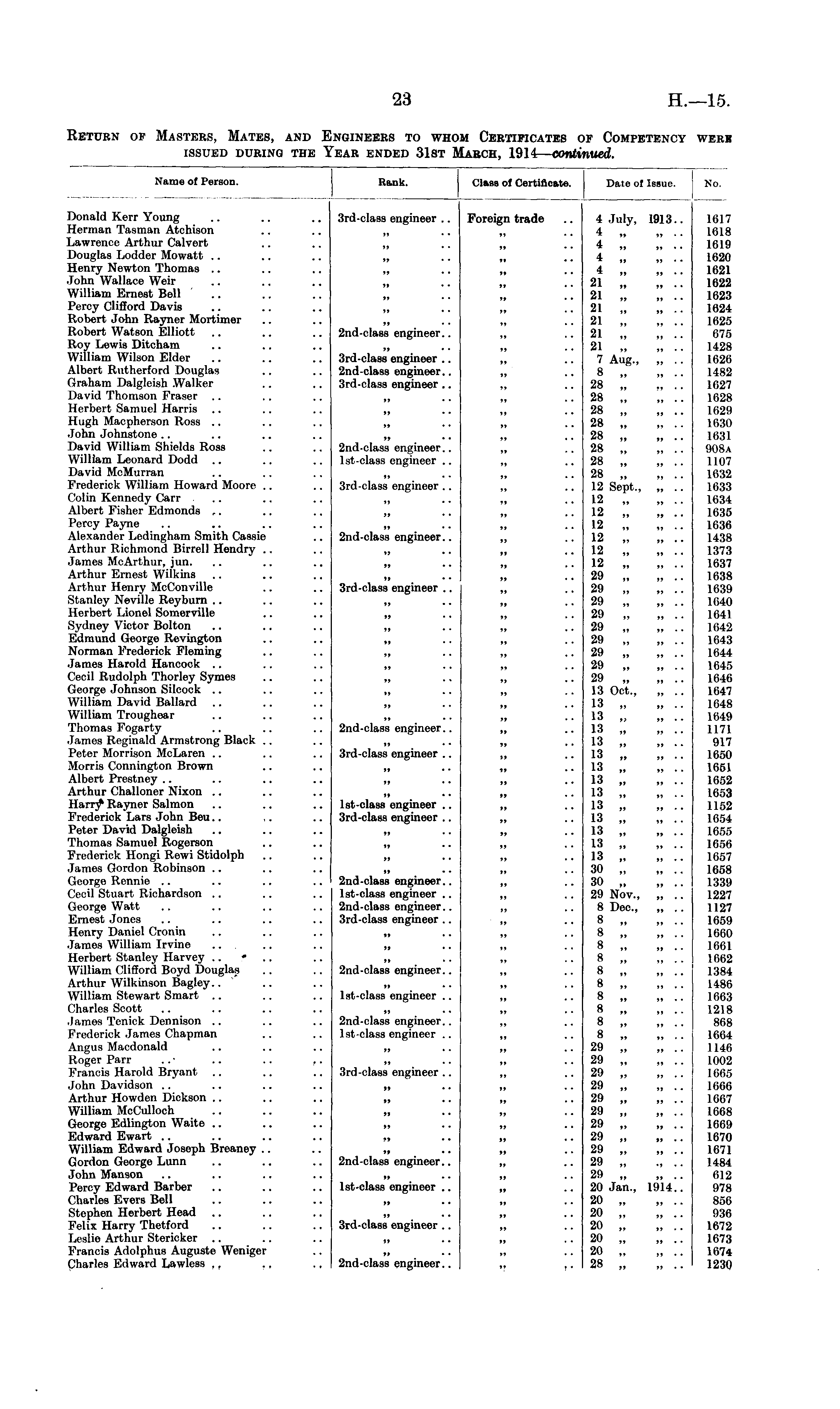 Return of Masters, Mates, and Engineers to whom Certificates of Competency were issued during the Year ended 31st Maech, 1914 — continued.