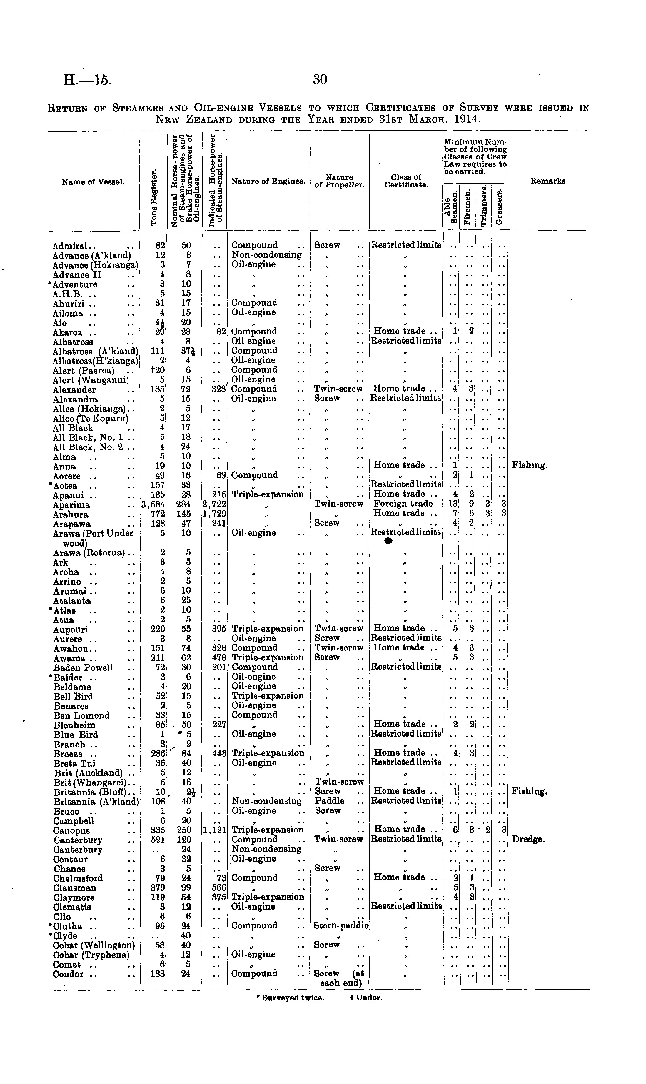 Return of Steamers and Oil-engine Vessels to which Certificates of Survey were issued in New Zealand during the Year ended 31st March, 1914.