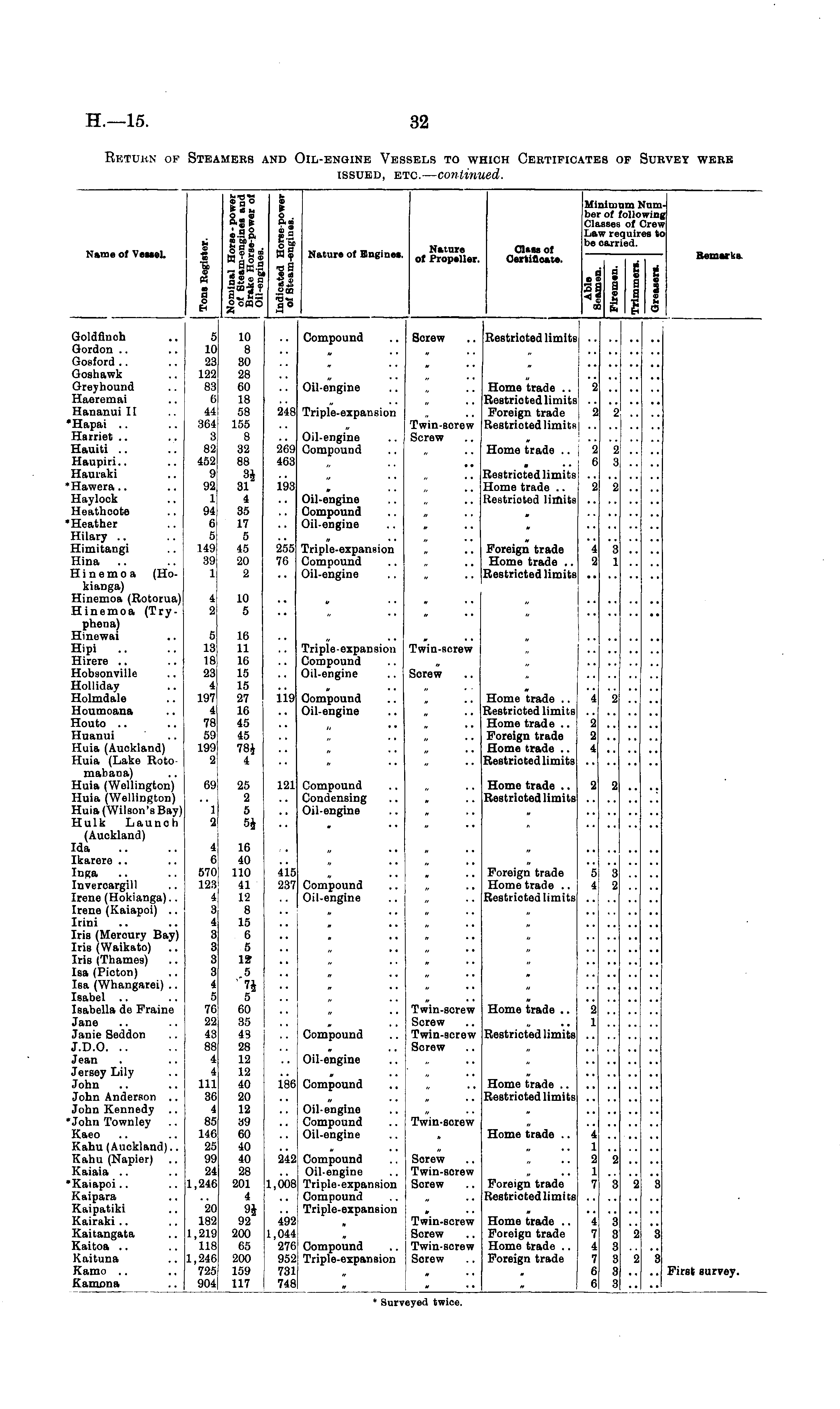 Name of Veuel. i s I 1*8 ®.5 ft DO do . if 23 If "CO Nature of Engines. Nature of Propeller. CIkss of Certificate. Mi, Lei (']« Lα' be niiiium Namf of following Lsses of Crew w requires to carried. Remarku 1 h Goldfinch Gordon Goeford Goshawk Greyhound Haeremai Hananui II 'Hapai Harriet Hauiti Haupiri.. Hauiaki 'Hawera Haylock Heathcote 'Heather Hilary .. Himitangi Hina Hi nemo a (Hokianga) Hinemoa (Rotorua) Hinemoa (Tryphena) Hinewai Hipi Hirere Hobsonville Holliday Holmdale Houmoana Houto Huanui Huia (Auckland) Huia (Lake Rotomabana) Huia (Wellington) Huia (Wellington) Huia (Wilson's Bay) Hulk Launch (Auckland) Ida Ikarere .. Inga Inveroargill Irene (Hokianga).. Irene (Kaiapoi) .. Irini Iris (Mercury Bay) Iris (Waikato) .. Iris (Thames) Isa (Picton) Isa (Whangarei) .. Isabel Isabella de Fraine Jane Janie Seddon J.D.O. .. Jean Jersey Lily John John Anderson .. John Kennedy "John Townley Kaeo Kahu (Auckland).. Kahu (Napier) .. Kaiaia 'Kaiapoi Kaipara Kaipatiki Kairaki Kaitangata Kaitoa Kaituna Kamo Kamona .. 5 10 23 122 83] 6 44 364 3 82 452 9 92 1 94 6 5 149 39 1 10 8 30 28 60 18 58 155 8 32 88 34 31 4 35 17 5 45 20 2 Compound 8crew Restricted limits 248 Oil-engine Triple-expansion Home trade .. Reetrioted limits Foreign trade Restrioted limits a a 2 Oil-engine Compound Twin-screw Screw 2G9 463 Home trade .. a 0 a 8 • • • • • Restricted limits Home trade .. Restricted limits 193 a 2 Oil-engine Compound Oil-engine • 255 76 Triple-expansion Compound Oil-engine Foreign trade Home trade .. Restricted limits: 4 2 '3 1 4 2 10 5 • • • H • • 5 13 18 23 4 197 4 78 59 199 2 16 11 16 15 15 27 16 45 45 78i 4 H9 Triple-expansion Compound Oil-engine Compound Oil-engine Twin-screw Sorew Home trade .. Restricted limits Home trade .. Foreign trade Home trade .. Restricted limits 4 a 2 2 4 69j 25 2 5 5i 121 Compound Condensing Oil-engine Home trade .. Restricted limits 2 ■2 "l 2 6 570 123 4 8 4 3 3 3 3 4 5 76 22 43 88 \ 111 36 4 85 146 25 99 24 1,246 16 40 110 41 12 8 15 6 5 12 5 "7J 5 60 35 43 28 12 12 40 20 12 39 60 40 40 28 201 4 9J 92 200 65 200 159 117 415 237 Compound Oil-engine Compound Oil-engine H • • Twin-screw Screw Twin-acrew Screw Foreign trade Home trade .. Restricted limits Home trade .. Restricted limits 5 4 a i 8 a 186 Compound Home trade .. Restricted limits Oil-engine Compound Oil-engine Twin-screw Home trade .. 4 1 2 1 7 242 Compound Oil-engine Triple-expansion Compound Triple-expansion Sorew Twin-screw Screw a 1,008: Foreign trade Restricted limits a 2 'i 20 182 1,219 118 1,246 725 904 492 1,044 276 952 731] 748| Compound Triple-expansion Twin-screw Screw Twin-screw Sorew Home trade .. Foreign trade Home trade .. Foreign trade 4 7 4 7 0 r, 8 B 8 8 3 8 'a '3 First survey. 2 '3 w • • H rr * Surve r ed twice.