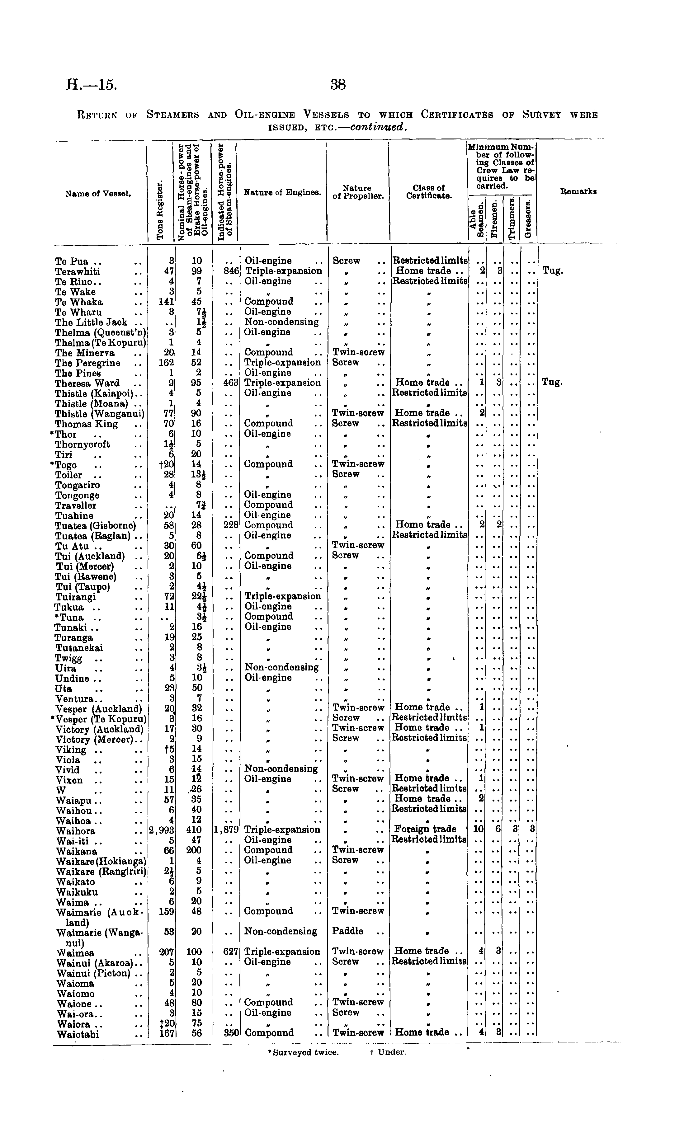 egg it* mi OoMO L "81 I—( Mini bei inp Cγ qu cai imut )r of g Cli rew ] lires irriec 11 followtsses of jaw reto be 1 Name of Vessel. i 5 ■r; a O H Nature of Engines. Nature of Propeller. Class of Certificate. a S 3 c B I E I. § 1 Ben) arks Te Pua Terawhiti TeRino.. Te Wake Te Whaka Te Wharu The Little Jaok .. Thelma (Queenst'n) Thelma (Te Kopuru) The Minerva .. , The Peregrine .. ■ The Pines .. ! Theresa Ward Thistle (Kaiapoi).. Thistle (Moana) .. Thistle (Wanganui) Thomas King 'Thor Thornycroft Tiri ■Togo Toiler Tongatiro Tongonge Traveller Tuahine Tuatea (Gisborne) Tuatea (Raglan) .. Tu Atu Tui (Auckland) .. Tui (Mercer) Tui (Rawene) Tui (Taupo) Tuirangi Tukua .. "Tuna .. Tunaki Turanga Tutanekai Twigg Uira Undine Uta Ventura.. Vesper (Auokland) "Vesper (Te Kopuru) Victory (Auckland) Victory (Meroer).. Viking .. Viola Vivid Vixen W Waiapu Waihou Waihoa Waihora Wai-iti .. Waikana Waikare (Hokianga) Waikare (Rangiriri) Waikato Waikuku Waima Waimarie (Auckland) Waimarie (Wanganui) Waimea Wainui (Akaroa).. Wainui (Picton) .. Waioma Waiomo Waione Wai-ora.. Waiora Waiotahi 77 70 6 1 0 f20 28 4 4 20 58 K 30 20 2 Q g 72 11 14 21 161 10 99 7 5 45 1\ 5* 4 14 52 2 95 5 4 90 16 10 5 20 14 13* 8 8 7| 14 28 8 60 6J 10 5 224 44 34 16 25 8 8 34 10 50 7 32 16 30 9 14 15 14 12 .26 35 40 12 410 47 200 4 5 9 5 20 48 846 463 228 Oil-engine Triple-expansion Oil-engine Compound Oil-engine Non-condensing Oil-engine Compound Triple-expansion Oil-engine Triple-expansion Oil-engine Compound Oil-engine Compound u • • Oil-engine Compound Oilengine Compound Oil-engine Compound Oil-engine Triple-expansion Oil-engine Compound Oil-engine Screw ir • • m • • Twin-screw Screw Twin-screw Screw » .. Twin-screw Screw # • • Twin-screw Screw Restricted limits Home trade .. Restricted limits m II II Home trade .. Restricted limits Home trade .. Restricted limits * m n n u Home trade .. Restricted limits m rr '2 i 'a '2 q *3 '. • a Tug. Tug. o 19 9 3 c 23 Q 20, c 17 g te g 6 15 11 57 6 4 2,993 i aj 6 Q 6 159 Non-condensing Oil-engine it * • u • ■ Non-conden si ng Oil-engine 11 * • ii • • // • • • « • * • • Twin-screw Screw Twin-screw Screw Twin-screw Screw H m n m m v Home trade .. Restricted limits Home trade .. Restricted limits m m m Home trade .. Restricted limits Home trade .. Restricted limits 1 i 1 2 # .. 1,879 Triple-expansion Oil-engine Compound Oil-engine Foreign trade Restricted limits io 6 3 "•A Twin-screw Screw n • . * . ■ it » « Compound Twin-screw 53 20 Non-condensing Paddle .. u> 207 5 4 48 3 }20 167 100 10 5 20 10 80 15 75 56 627 Triple-expansion Oil-engine Twin-screw Screw Home trade .. Restricted limits 4 3 I • • Compound Oilengine it • • Twin-screw Screw 350 Compound Twin-screw Home trade .. 4 '3 ider. * Surveyed twice. + Ui
