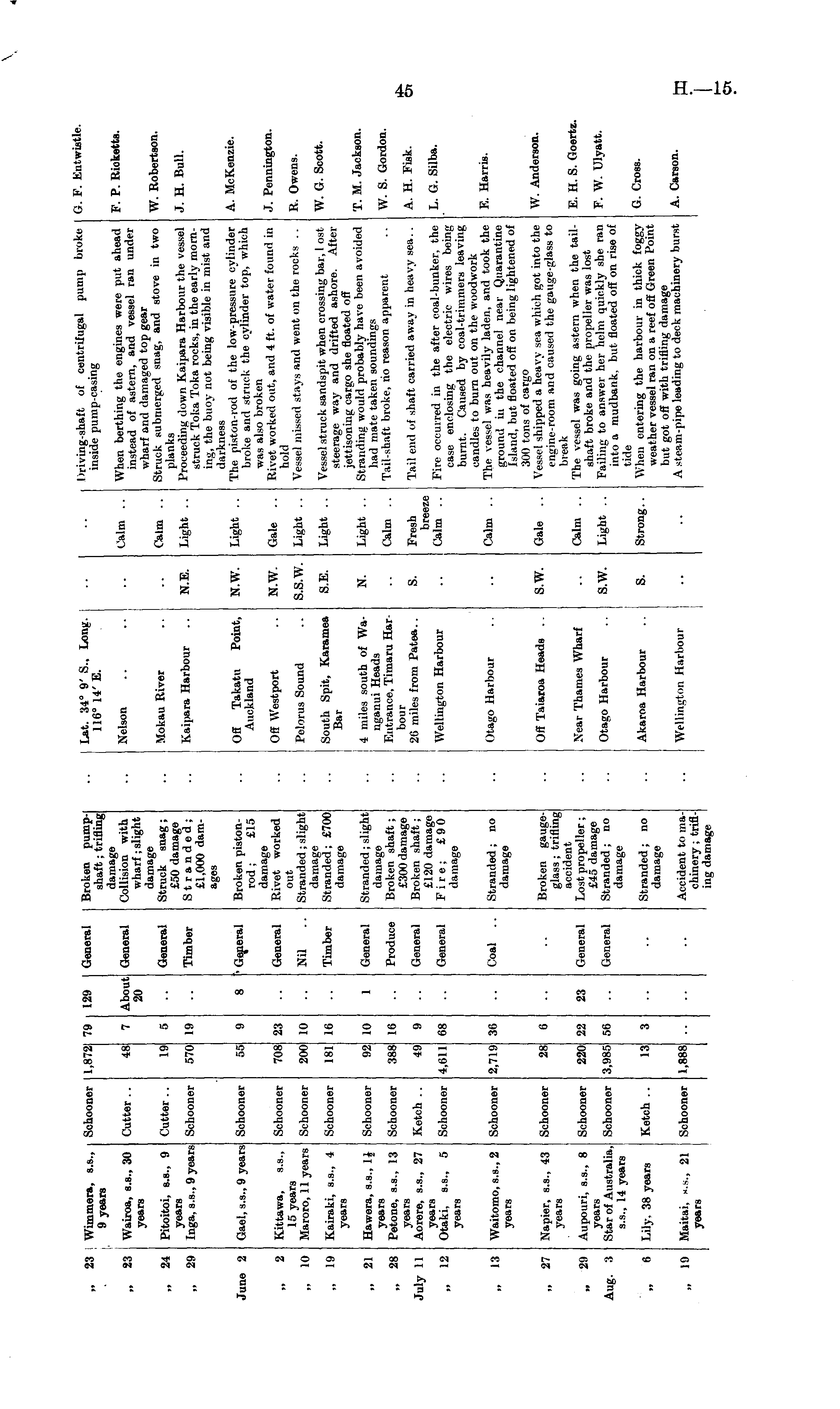 Driving-shaft of centrifugal pump broke inside pump-casing G. F. Eutwistle Iβ. „ 23 Wimmera, s.s., 9 years Schooner 1,8721 71) 129 General Broken pumpshaft ; trifling damage Collision with wharf; slight damage Struck snag; £50 damage Stranded; £1,000 damages Lat. 34° 9' 8.. Long. 116° 14' E. „ 23 Cutter .. About 20 General Nelson Calm .. When berthing the engines were put ahead instead of astern, and vessel ran under wharf and damaged top gear Struck submerged snag, and stove in two planks Proceeding clown Kaipara Harbour the vessel struck Toka Toka nicks, in the early morning, the buoy not being visible in mist and darkness The piston-rod of the low-pressure cylinder broke and struck the cylinder top, which was also broken Rivet worked out, and 4 ft. of water found in hold Vessel missed stays and went on the rocks .. F. P. Ricketts. Wairoa, s.s., 30 years 4S W. Robertson. „ 24 Pitoitoi, s.s., 9 years Inga, s.s., 9 years Cutter .. General Mokau River Calm .. 19 5 J. H. Bull. „ 29 Schooner 570 111 Timber Kaipara Harbour N.E. Light .. rune 2 Gael, a.s., 9 years ' General Broken pistonrod ; £15 damage Rivet worked out Stranded; slight damage Stranded; £700 damage Off Takatu Point, Auckland N.W. Light .. A. McKenzie. Schooner 66 2 Kittawa, s.s., 15 years Maroro, 11 years Schooner General Off Westport N.W. Gale .. J. Pennington. 708 21! R. Owens. „ 10 Schooner 200 10 Nil Pelorus Sound S.S.W. Light .. „ 19 „ 21 Kairaki, s.s., 4 3'ears Schooner Schooner 181 Hi 1 Timber General Stranded; slight damage Broken shaft; £300 damage Broken shaft; £120 damage Fire; £90 damage South Spit, Karamea Bar 4 miles south of Wanganui Heads Entrance, Timaru Harbour 20 miles from Patea.. S.E. N. Light .. Light .. Vessel struck sandspit when crossing bar, 1 ost steerage way and drifted ashore. After jettisoning cargo she floated off Stranding would "probably have been avoided had mate taken soundings Tail-shaft broke, do reason apparent W. G. Scott. T. M. Jackaon. „ 28 uly 11 Hawera, 3.3., 1£ years Petone, s.s., 13 years Aorere, s.s., 27 years Otaki, s.s., 5 years Schooner Ketch .. 92 388 49 10 n> 9 Produce General S. Calm .. Fresh breeze Calm .. Tail end of shaft carried away in heavy sea.. W. S. Gordon. A. H. Fisk. „ 12 Schooner 4,611 68 General Wellington Harbour Fire declined in the after coal-bunker, the case enclosing the electric wires being burnt. Caused by coal-trimmers leaving candles to burn out on the woodwork The vessel was heavily laden, and took the ground in the channel near Quarantine Island, but floated off on being lightened of 300 tons of cargo Vessel shipped a heavy sea which got into the engine-room and caused the gauge-glass to break The vessel was going astern when the tailshaft broke and the propeller was lost Failing to answer her helm quickly she ran into a mudbank, but floated off on rise of tide When entering the harbour in thick foggy weather vessel ran on a reef off Green Point but got off with trifling damage A steam-pipe leading to deck machinery burst L. G. Silba. Waitomo, s.s., 2 years Schooner Coal .. Stranded ; no damage Otago Harbour Calm .. E. Harris. 13 2,719 :iii Napier, s.s., 43 years Schooner Broken gaugeglass ; trifling accident Lost propeller ; £45 damage Stranded ; no damage Off Taiaroa Heads .. S.W. Gale .. W. Anderson. „ 27 28 „ 29 Schooner 220 23 General Near Thames Wharf Calm .. E. H. S. Goerti Aug. :s Aupouri, s.s., 8 years Star of Australia, s.s., 14 years Schooner 3,985 22 56 General Otago Harbour S.W. Light .. F. W. Ulyatt. Lily. 38 years Ketch .. Stranded; no damage Akaroa Harbour s. Strong.. G. Cross. 6 13 „ li) Maitai, s.s., 21 years Schooner 1,888 Wellington Harbour A. Carson. Accident to machinery ; trifling damage