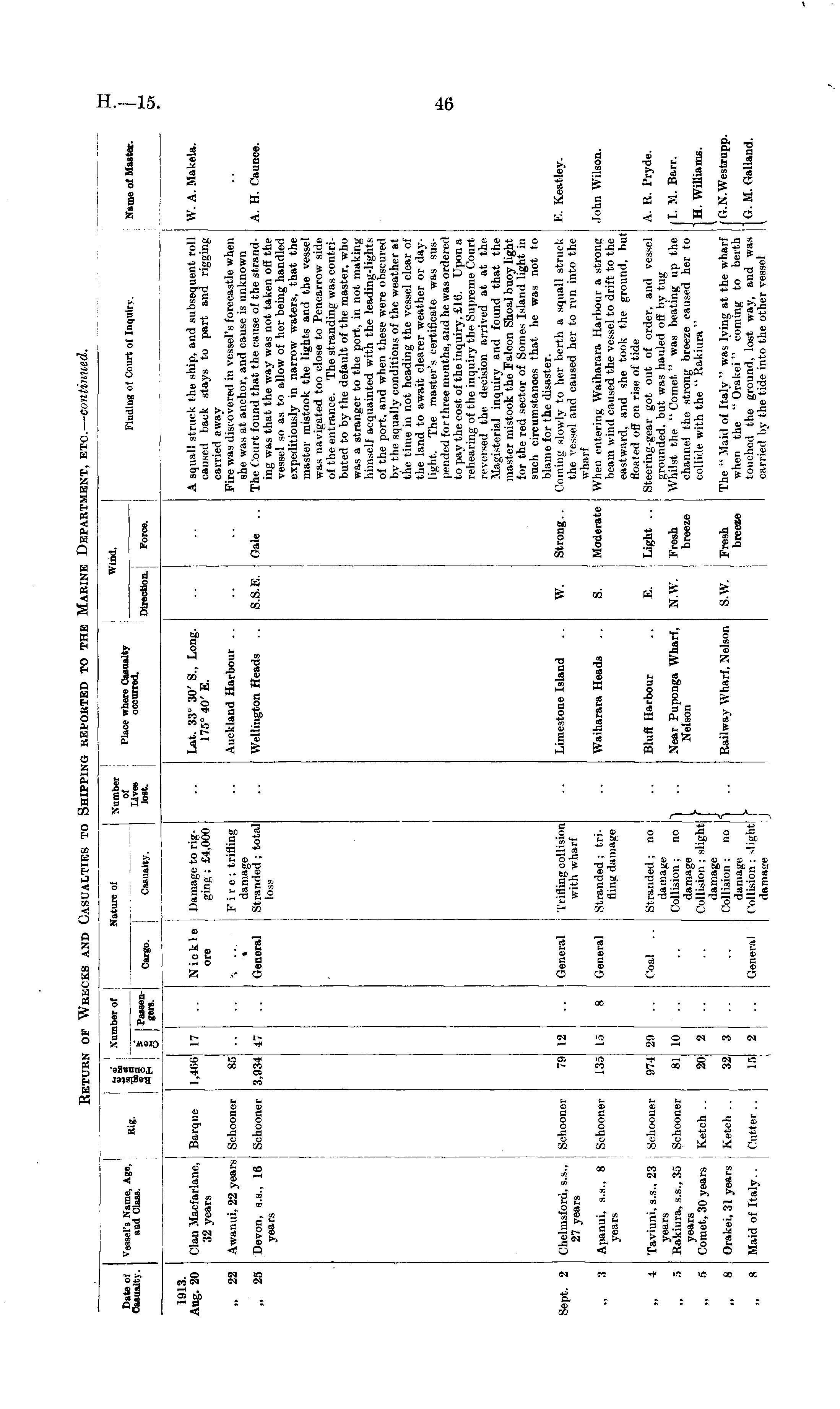Date of Casualty. Vessel's Name, Age, and Class. Big. g i Xumber of ** g gers. Cargo. Natt Nature of ;ure of Casualty. Number of lives lost. Place where Casualty occurred. Wind. Finding of Court of Inquiry. Name of Master. Direction. Force. 1913. Aug. 20 ( Ian Macfarlane. 32 years Barque 1,466 IT Nickle Damage to rigging ; £4,000 Lat. 33° 30' S., Long. 175° 40' E. A squall struck the ship, and subsequent roll caused back stays to part and rigging carried away Fire was discovered in vessel's forecastle when she was at anchor, and cause is unknown The Court found that the cause of the stranding was that the way was not taken off the vessel so as to allow of her being handled expeditiously in narrow waters, that the master mistook the lights and the vessel was navigated too close to Pencarrow side of the entrance. The stranding was contributed to by the default of the master, who was a stranger to the port, in not making himself acquainted with the leading-lights of the port, and when these were obscured by the squally conditions of the weather at the time in not heading the vessel clear of the land to await clearer weather or daylight. The master's certificate was suspended for three months, and he was ordered to pay the cost of the inquiry, £1(>. Upon a rehearing of the inquiry the Supreme Court reversed the decision arrived at at the Magisterial inquiry and found that the master mistook the Falcon Shoal buoy light for the red sector of Somes Island light in such circumstanoes that he was not to blame for the disaster. Coming slowly to her berth a squall struck the vessel and caused her to run into the wharf When entering Waiharara Harbour a strong beam wind caused tile vessel to drift to the eastward, and she took the ground, but Boated off on rise of tide Steering-gear got out of order, and vessel grounded, but was hauled off by tug Whilst the "Comet" was beating up the channel the strong breeze caused her to collide with the " RaUiura " W. A. Makela. ore „ 22 Awanui. 22 years Schooner 85 % Fire; trifling damage Stranded ; total loss Auckland Harbour .. „ 25 Devon. s.B., 16 years Schooner 3,!»34 47 General Wellington Heads S.S.E. Gale A. H. Caunce. Sept. 2 Chelmsford, s.s., Schooner 27 years Apanui, s.s., 8 Schooner years T'.l 12 General Trifling collision with wharf Limestone Island W. Strong.. E. Keatley. :t i:i.-, 15 8 General Stranded ; trifling damage Waiharara Heads S. Moderate John Wilsoa. „ 4 Taviuni, s.s., 23 Schooner years Rakiura, s.s., 35 Schooner years Comet, 30 years Ketch .. Coal .. Stranded ; no damage Collision: no damage Collision ; slight damage Collision: no damage Collision ; slight damage Bluff Harbour E. Light .. A. R. Pryde. 974 ■2<> ,, 5 81 1(1 Near Puponga Wharf, Nelson N.W. Fresh breeze (I. M. Barr. ,. 5 20 2 S.W. H. Williams. 8 32 3 Railway Wharf, Nelson Fresh breeze The " Maid of Italy " was lying at the wharf when the " Orakei" coming to berth touched the ground, lost way, and was carried by the tide into the other vessel (G.N.Westrupp Orakei, 31 years Ketch .. „ 8 Maid of Italy.. Cutter.. 15 2 General G. M. Galland.