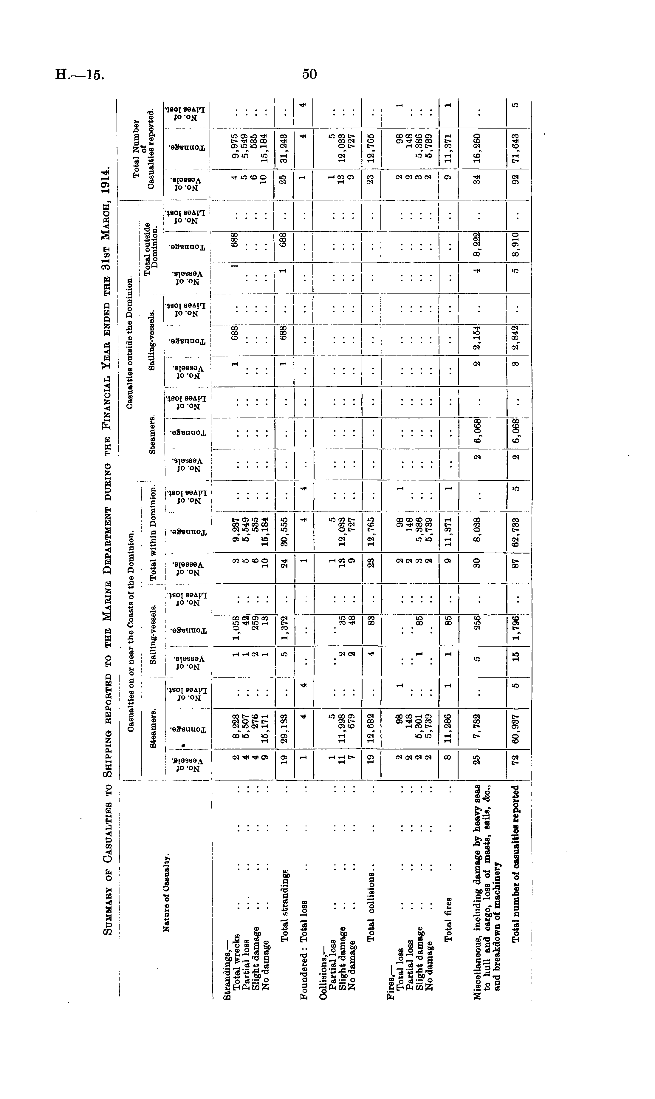 Casualties on or near the Coasts of the Dominion. liners. Sailing-vessels. Total within Dominion. Steamers. Casualties outside the Dominion. SaUing-veesels. le 1. Total Number of Casualties reported. Steamers. 1. Nature of Casualty. O-5 O , © a si og si a o s- s si I si A o -J. 6 I J O <D 4 6 a o — si si a> s In ■ s{ 6 00 i Itrandings, — Total wrecks Partial loss Slight damage No damage 2 4 4 9 8,228 5,507 276 15,171 29,133 1 1 2 1 5 1,058 42 259 13 •• 3 5 6 10 9,287 5,549 535 15,184 30,555 •■ .. 1 688 ■• 1 688 I 4 5 6 10 9,975 5,549 535 15,184 •• •■ •• Total strandings 19 1,372 24 .. •• 1 688 1 688 25 1 31,243 4 Sundered: Total loss 1 4 •• 1 4 'ollisions, — Partial loss Slight damage No damage 1 11 7 5 11,998 679 35 48 1 13 9 5 12,033 727 .. .. •• 1 13 9 5 12,033 727 2 2 •• •• " .. •• Total collisions.. 19 12,682 4 83 23 12,765 .. 23 12,765 .. .. - ■■ ? ires,— Total loss Partial loss Slight damage No damage 2 2 2 2 98 148 5,301 5,730 11,286 1 1 85 2 2 3 2 98 1 148 ! .. 5,386 5,739 1 .. .. •• 2 2 3 2 98 148 5,386 5,739 1 ■• Total fires 8 1 1 85 ! 9 11,371 1 9 11,371 1 .. 1 liscellaneous, including damage by heavy seas to hull and cargo, loss of masts, sails, &c. and breakdown of machinery 25 7,782 5 256 30 8,038 - 2 2 6,068 2 2,154 4 8,222 34 16,260 72 60,937 5 ! 15 1,796 87 62,733 5 5 2 6,068 8 2,842 5 8,910 92 71,643 Total number of casualties reported .. 2 • •