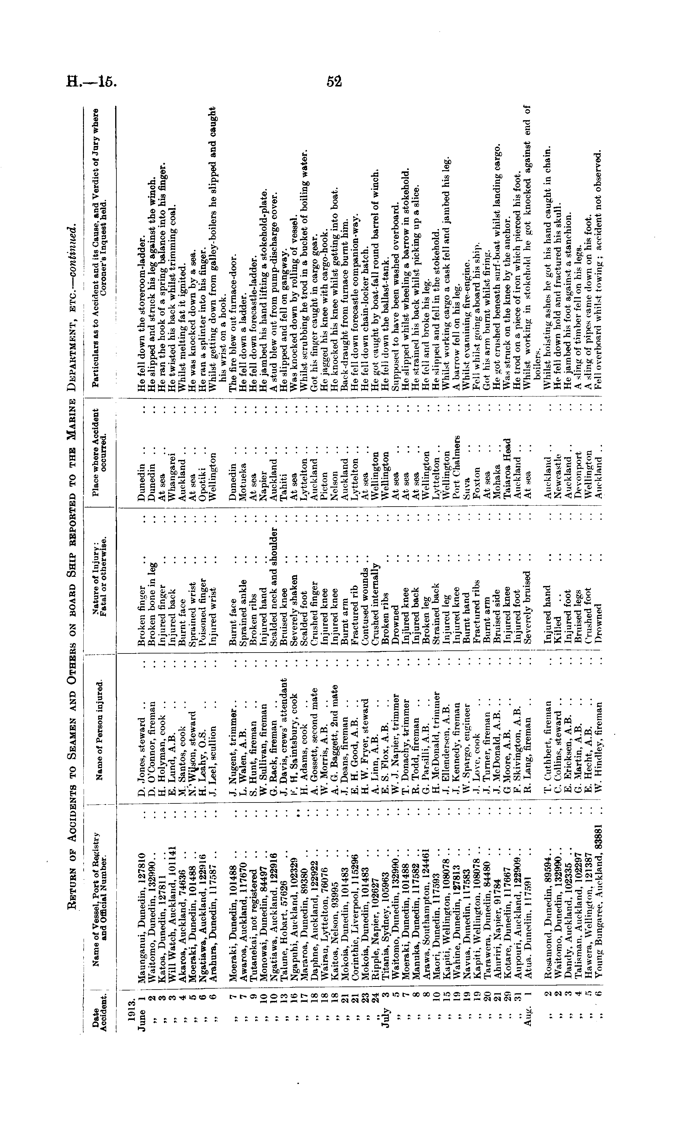 Date Accident. Name of Vessel, Port of Hefjistvy and Official Number. Name of Person injured. Nature of Injury: Fatal or otherwise. Place where Accident occurred. Particulars as to Accident and its Cause, and Verdict of Jury where Coroner's Inquest held. 1913. June 1 2 3 ,. 3 4 „ 5 „ 6 Maunganui, Dunedin, 127810 Waitomo, Dunedin, 132090.. Katoa, Dunedin, 127811 Will Watch, Auckland, 101 141 Akaroa, Auckland. 74ti:iii Moeraki, Dunedin. 101488 .. Ngatiawa, Auckland. 122!tll> Arahura, Dunedin, 1 17587 I). Jones, steward .. D. O'Connor, fireman H. Holyman, conk .. E. Lund, A.B. M. Santos, cook N. Wilson, steward H. Leahy, O.S. I. Leel, scullion Broken finger Broken bone in leg Injured finger Injured back Burnt face Sprained wrist Poisoned finger Injured wrist Dunedin .. Dunedin .. At sea Whangarei Auckland .. At sea Opotiki Wellington He fell down tho storeroom-ladder. He slipped and struck his log against the winch. He ran the hook of a spring balance into his finger. He twisted his back whilst trimming coal. Whilst melting fat it ignited. He was knocked down by a sea. He ran a splinter into his finger. Whilst getting down from galley-boilers he slipped and caught his wrist on a hook. The fire blew out furnace-door. He foil down a ladder. Ho fell down forecastle-ladder. He jambed his hand lifting a stokehold-plate. A stud blew out from pump-discharge cover. He slipped and fell on gangway. Was knocked down by rolling of vessel. Whilst scrubbing he trod in a bucket of boiling water. Got his finger caught in cargo gear. He jagged his knee with cargo-hook. He knocked his knee whilst getting into boat. Back-draught from furnace burnt him. He fell down forecastle companion-way. He fell down chain-locker hatch. He got caught by boat-fall round barrel of winch. He fell down the ballast-tank. Supposed to have been washed overboard. He slipped whilst wheeling a barrow in stokehold. He strained his back whilst picking up a slice. He fell and broke his leg. He slipped and fell in the stokehold. Whilst working cargo a cask fell and jambed his leg. A barrow fell on his leg. Whilst examining fire-engine. Fell whilst going aboard his ship. Got his arm burnt whilst firing. He got (rushed beneath surf-boat whilst landing cargo. Was struck on the knee by the anchor. He trod on a piece of iron which pierced his foot. Whilst working in stokehold he got knocked against end of boilers. Whilst hoisting ashes he got his hand caught in chain. He fell down hold and fractured his skull. He jambed his foot against a stanchion. A sling of timber fell on his legs. A sling of pipes came down on his foot. Pell overboard whilst towing ; accident not observed. 7 7 „ 10 „ 10 „ 13 ., Hi .. 17 „ 18 „ 18 „ 18 „ 21 „ 21 „ 23 ,. 24 July 3 5 7 8 8 „ 10 „ 15 „ 19 ., I!) ., 19 ., 20 „ 21 .. 20 ., 31 Aug. 1 Moeraki. Dunedin, 101488 .. Awaroa, Auckland. 117670 Tutanekai, not registered Monowai, Dunedin, 84497 Ngatiawa, Auckland. 122916 Talune, Hobart, 57026 Ngapuhi, Auckland, 10232!) Mar.uoa. Dunedin, 89380 .. Daphne, Auckland, 122922 Wairau, Lyttelton, 76076 .. Kailoa, Nelson, 93996 Mokoia, Dunedin. 101483 .. Corinthie. Liverpool, 115296 .Mokoia, Dunedin, 101483 .. Ripple, Napier, 102627 Titania, Sydney, 105963 Waitomo, Dunedin, 132990.. Moeraki, Dunedin, 101488 .. Manuka, Dunedin, 117582 .. Arawa, Southampton, 124461 Maori. Dunedin. I17.->!i:{ Kapiti. Wellington, 108078 Wahine. Dunedin, 12781:! .. Navua. Dunedin. 117583 Kapiti. Wellington, 108078 Tarawera, Dunedin, 84480 .. Ahuriri, Napier, 91784 Kotare, Dunedin, 1 17667 Aupouri, Auckland, I22!«)!l.. Atiia. Dunedin, 117591 J. Nugent, trimmer.. L. Walen, A.B. S. Hunt, fireman W. Sullivan, fireman G. Rack, fireman .. J. Davis, crews' attendant I'". II. Saintsbury, cook II. Adams, cook A. (iossett, second mate W. Morris, A.B. .. A. Q. Baggett, 2nd mate ■ I. Deans, fireman .. E. H. Good, A.B. .. H. W. Fryer, steward A. Linn, A.B. E. S. Flox, A.B. .. W. J. Napier, trimmer T. Donachy, trimmer R. Todd, fireman .. G. I'arsilli. A.B. (I. M< Donald, trimmer J. Ellendersen, A.B. • I. Kennedy, fireman W. Spargo, engineer • I. Love, cook J. Turner, fireman .. J. McDonald. A.B. .. Q Moore, A.B. I". Skivington, A.B. R. Lang, fireman Burnt face Sprained ankle Broken ribs Injured hand Scalded neck and shoulder .. Bruised knee Severely shaken Scalded' foot Ciushed finger Injured knee Injured knee Burnt arm Fractured rib Contused wounds Crushed internally Broken ribs Drowned Injured knee Injured back Broken leg Strained back Injured leg Injured knee Burnt hand Fractured ribs Burnt arm Bruised side Injured knee Injured foot Severely bruised Dunedin .. Motueka .. At sea Napier Auckland .. Tahiti At sea Lyttelton .. Auckland .. Picton Nelson Auckland . . Lyttelton .. At sea Wellington Wellington At sea At sea At sea Wellington Lyttelton .. Wellington Port Chalmers Suva Fox ton At sea Mohaka Taiaroa Head Auckland .. At sea „ 2 „ 2 „ 3 4 5 6 Rosamond. Dunedin. 89594.. Waitomo, Dunedin, 132990.. Dandy, Auckland. 102335 Talisman. Auckland, 102297 Hawera. Wellington, 121387 Young Bungaree, Auckland, 83881 . . T. Cuthbert, fireman C. Collins, steward .. E. Ericksen, A.B. .. G. Martin, A.B. E. Hecht, A.B. W. Bindley, fireman Injured hand Killed Injured foot Bruised legs Crushed foot Drowned Auckland . . Newcastle Auckland .. Dcvonport Wellington Auckland . .