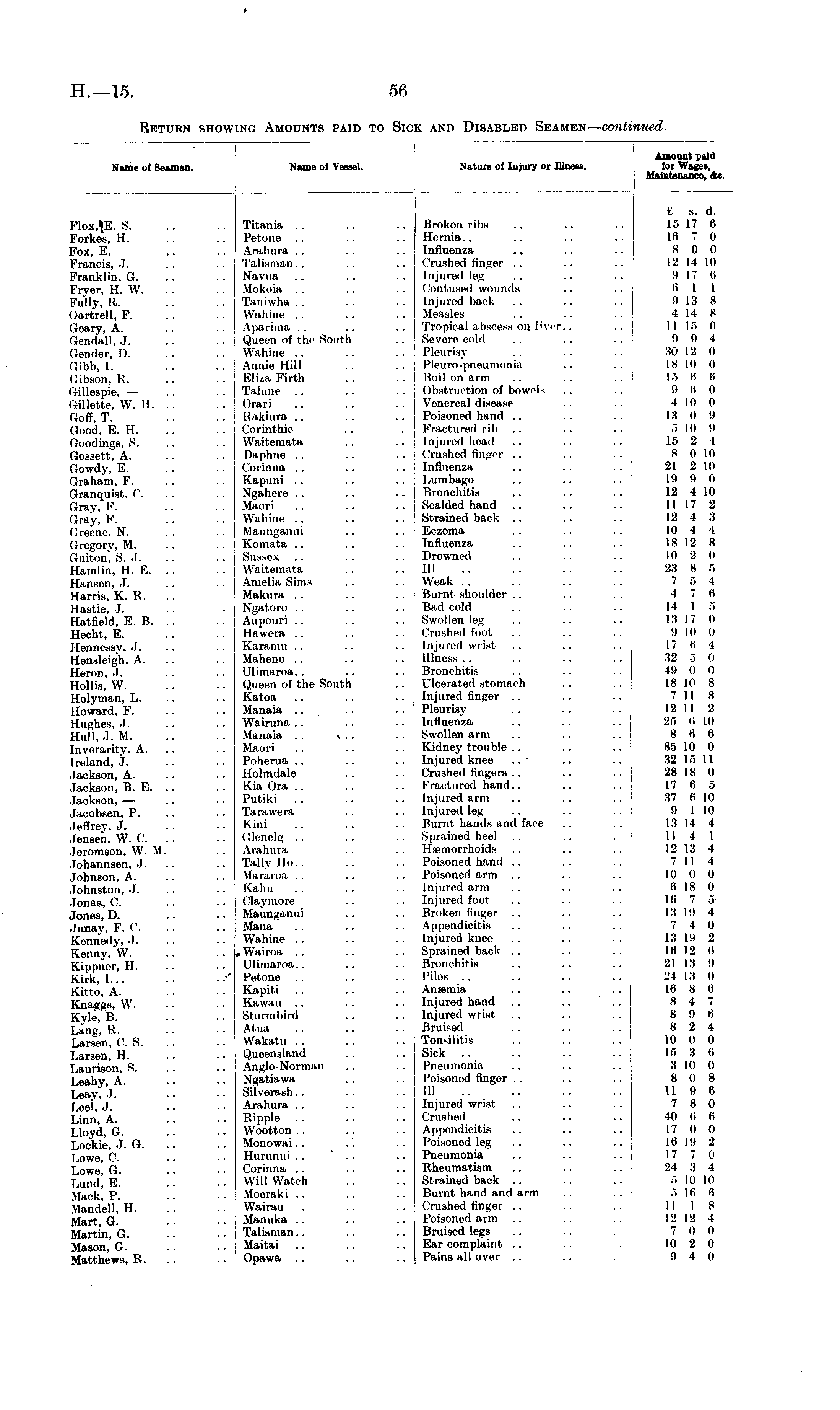 Name of Seaman. Name o( Vessel. Nature ol Injury or lUnefw. Amount paid tor Wages, Maintenance, & Floz,p. S. Forkes, H. Fox, E. Francis. I. Franklin, G. Fryer, H. W. Fully. R, Gartrell, F. Geary, A. Gendall. .1. Gender, l>. Gibb, I. Gibson. It. Gillespie, — Gillette, W. H. .. Goff, T. Good, E. H. Goodings, B. Qossett, A. Gtowdy, E. Graham, F. Granquist. C. Gray, F. Gray, F. Greene, N. Gregory, M. Guiton, S. J. Hamlin. H. E. Hansen, J. Harris. K. R. Ha-tie, J. Hatfield, E. B. Heeht, E. llennessy, J. Hensleigh, A. Heron. J, Mollis. W. llolyman, L. Howard. 1". Bughes, J. Hull..I. M. Inverarity, A. Ireland, J. Jackson, A. Jackson, B. E. .Jackson, — Jacobsen, P. Jeffrey, J. Jensen, W. C. .leromson, W M. Johannsen, J. Johnson, A. Johnston, J. Jonas, C. Jones, D. Junay, F. C. Kennedy, J. Kenny. "W. Kippner, H. Kirk, [... Kitto, A. Knaggs, W. Kyle, B. Lang. l<. Larsen. ('. S. Larsen, H. Laurison. S. Leahy, A. Leay. J. Leel, J. Linn, A. Lloyd, G. Lockie, J. G. Lowe, C. Lowe, G. Lund, E. Maok, P. Mandell. H. Mart, G. Martin, G. Mason, G. Matthews, R. Titania Petone Arahura Talisman.. Navua Mokoia .. Taniwha Wahine .. Aparima .. Queen of the South Wahine Annie Hill Eliza Firth Talune Orari Hakiura Corinthic Waitemata Daphne Cminna .. Kapuni Ngahere Maori Wahine Maunganui Komata .. Sussex Waitemata Amelia Sims Makiira Ngatoro Aupouri Hawera Karamu Maheno . . Dlimaroa. . Queen of the South Katoa Manaia Wairiiiiii Manaia . . < .. Maori Poherua Holmdale Kia Ora Putiki Tarawera Kini Qlenelg Arahura Tally Ho.. Mararoa Kaliu Claymore Maunganui Mana Wahine .. „ Wairoa .. I limaroa. . Petone Kapiti Kawau Stormbiid Atua Wakatu .. Queensland Anglo-Norman Ngatiawa Silverash. . Arahura Ripple Wootton Monowai Murium! . . Corinna Will Wat eh Moerak i . . Wai ran Manuka Talisman Maitai Opawa Broken ribs Hernia.. Influenza Crushed finger Injured teg Contused wounds Injured back Measles Tropical abscess on liver.. Severe cold Pleurisy Pleuropneumonia Boil on arm Obstruction of bowels Venereal disease Poisoned hand Fractured rib injured head Crashed finger Influenza Lumbago Bronchitis ■Scalded hand Strained back Eczema Influenza Dro wncc I 111 Weak .. Burnt shoulder Bad cold Swollen leg ('rushed foot Injured wrist Illness Bronchitis Ulcerated stomach Injured finger Pleurisy Influenza Swollen arm Kidney trouble Injured knee ..' Crushed fingers Fractured hand.. Injured arm Injured leg Burnt hands and face Sprained heel Haemorrhoids Poisoned hand Poisoned arm Injured arm Injured foot Broken finger Appendicitis Injured knee Sprained back Bronchitis Piles .. Anaemia Injured hand Injured wrist Bruised Tonsilitis Sick .. Pneumonia Poisoned finger ill Injured wrist Crushed Appendicitis Poisoned leg Pneumonia Rheumatism Strained back Burnt hand and arm Crushed finger Poisoned arm Bruised legs Ear complaint Pains all over ■ •! .. :: I ■ • i t s. d. 15 17 6 16 7 0 8 0 (I 12 14 10 !) 17 8 6 1 I 9 13 s 4 14 8 11 16 0 0 0 4 30 12 0 18 10 0 15 8 8 !) t; (i 4 in I) 13 o o 5 Hi 9 16 2 4 8 0 10 21 2 10 I!) 9 I) 12 i 10 11 17 2 12 4 3 10 4 4 18 12 8 10 2 0 23 8 6 7 .") 4 4 7 l> 14 I 6 13 17 0 9 10 0 17 ti 4 32 ."> 0 4(1 l> 0 18 10 8 7 118 12 11 2 26 6 10 8 li l> 86 II) (i 32 16 II 28 18 0 17 ii B 37 (i 10 !) I III 13 14 4 114 1 12 13 4 7 11 4 10 0 0 i> 18 0 Lβ 7 ."> 13 19 4 7 4 0 13 lit 2 n> 12 i> 21 13 9 24 13 0 Iβ 8 6 8 4 7 8 9 6 8 2 4 III I) I) 16 3 ii :t io o 8 0 8 110 6 7 8 0 40 8 (i 17 0 0 16 1!) 2 17 7 (I 24 3 4 .') 10 1(1 ."> Iβ Ii 11 18 12 12 I 7 0 0 10 2 0 9 4 0