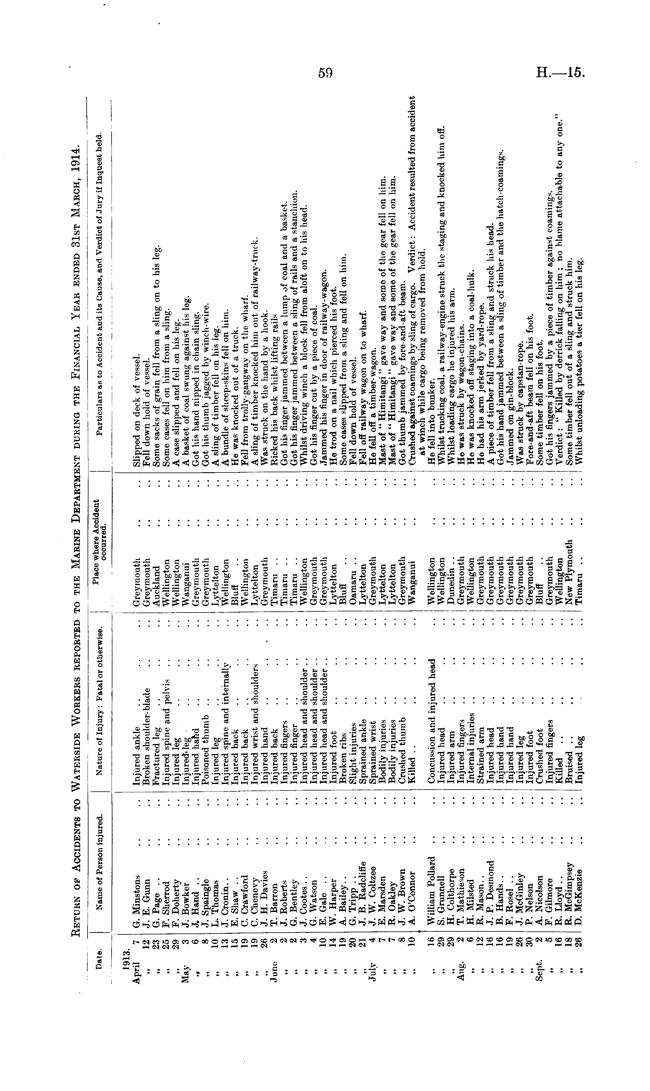 Date. Name of Person injured. Nature of Injury: Fatal or otherwise. Place where Accident occurred. Particulars as to Accident and its Cause, and Verdict of Jury if Inquest held. 1913. April 7 12 23 25 29 May 3 10 13 IT) 19 19 26 June 2 2 2 3 10 19 20 21 July i 8 10 G. Minstons J. E. Gunn G. Page .. F. Sherrod F. Doherty J. Bowker J. Hand .. J. Spaingle L. Thomas J. Cronin.. E. Shaw .. C. Crawford C. Chenevv J. H. Davies T. Barron J. Roberts G. Bentley J. Cootes .. G. Watson E. Gale .. W. Harper A. Bailey.. G. Tripp .. J. B. Radclifie J. W. Coltzee E. Marsden R. Oakley J. W. Brown A. O'Connor Injured ankle Broken shoulder-blade Fractured leg Injured spine and pelvis Injured leg Injured" leg Injured hand Poisoned thumb Injured leg Injured spine and internally Injured back Injured back Injured wrist and shoulders Injured hand Injured back Injured fingers Injured finger Injured head and shoulder .. Injured head and shoulder .. Injured head and shoulder .. Injured foot Broken ribs Slight injuries Sprained ankle Sprained wrist Bodily injuries Bodily injuries Crushed thumb Killed Greymouth Greymouth Auckland Wellington Wellington Wanganui Greymouth Greymouth Lyttelton Wellington Bluff Wellington Lj'ttelton Greymouth Timaru .. Timaru . . Timaru .. Wellington Greymouth Greymouth Lyttelton Bluff Oamaru .. Lyttelton Greymouth Lyttelton Lyttelton Greymouth Wanganui Slipped on deck of vessel. Fell down hold of vessel. Some sacks of grain fell from a sling on to his leg. Some cases fell on him from a sling. A case slipped and fell on his leg. A basket of coal swung against his leg. Got his hand nipped in chain sling. Got his thumb jagged by winch-wire. A sling of timber fell on his leg. A bundle of sheep-skins fell on him. He was knocked out of a truck. Fell from trolly-gangway on the wharf. A sling of timber knocked him out of railway-truck. Was struck on the hand by a hook. Ricked his back whilst lifting rails Got his finger jammed between a lump of coal and a basket. Got his finger jammed between a sling of rails and a stanchion. Whilst driving winch a block fell from aloft on to his head. Got his finger cut by a piece of coal. Jammed his finger in door of railway-wagon. He trod on a nail which pierced his foot. Some cases slipped from a sling and fell on him. Fell down hold of vessel. Fell off railway wagon on to wharf. He fell off a timber-wagon. Mast of " Himitangi" gave way and some of the gear fell on him. Mast of " Himitangi " gave way and some of the gear fell on him. Got thumb jammed by fore-and-aft beam. Crushed against coamings by sling of cargo. Verdict: Accident resulted from accident at winch while cargo being removed from hold. He fell into bunker. Whilst trucking coal, a railway-engine struck the staging and knocked him off. Whilst loading cargo he injured his arm. He was struck by wagon-chains. He was knocked off staging into a coal-hulk. He had his arm jerked by yard-rope. A piece of timber fell from a sling and struck his head. Got his hand jammed between a sling of timber and the hatch-coamings. .lammed on gin-block. Was struck by capstan-rope. Fore-and-aft beam fell on his foot. Some timber fell on his foot. Got his fingers jammed by a piece of timber against coamings. Verdict: " Killed by derrick falling on him ; no blame attachable to any one." Some timber fell out of a sling and struck him. Whilst unloading potatoes a tier fell on his leg. 16 29 29 Aug. 2 6 12 16 16 19 26 30 Sept. 2 5 16 18 26 William Pollard S. Grunnell H. Colthorpe T. Mathie.-on H. Milsted R. Mason.. J. P. Desmond B. Hands.. F. Rosel .. J. McGinley P. Nelson A. Nieolson F. Gilmore R. Lloyd .. R. McGimpsey D. McKenzie Concussion and injured head Injured head Injured arm Injured fingers Internal injuries Strained arm Injured head Injured hand Injured hand Injured leg Injured foot Crushed foot Injured fingers Killed .. Bruised Injured leg Wellington Wellington Dunedin .. Greymouth Wellington Greymouth Greymouth Greymouth Greymouth Greymouth Greymouth Bluff Greymouth Wellington New Plymouth Timaru ..