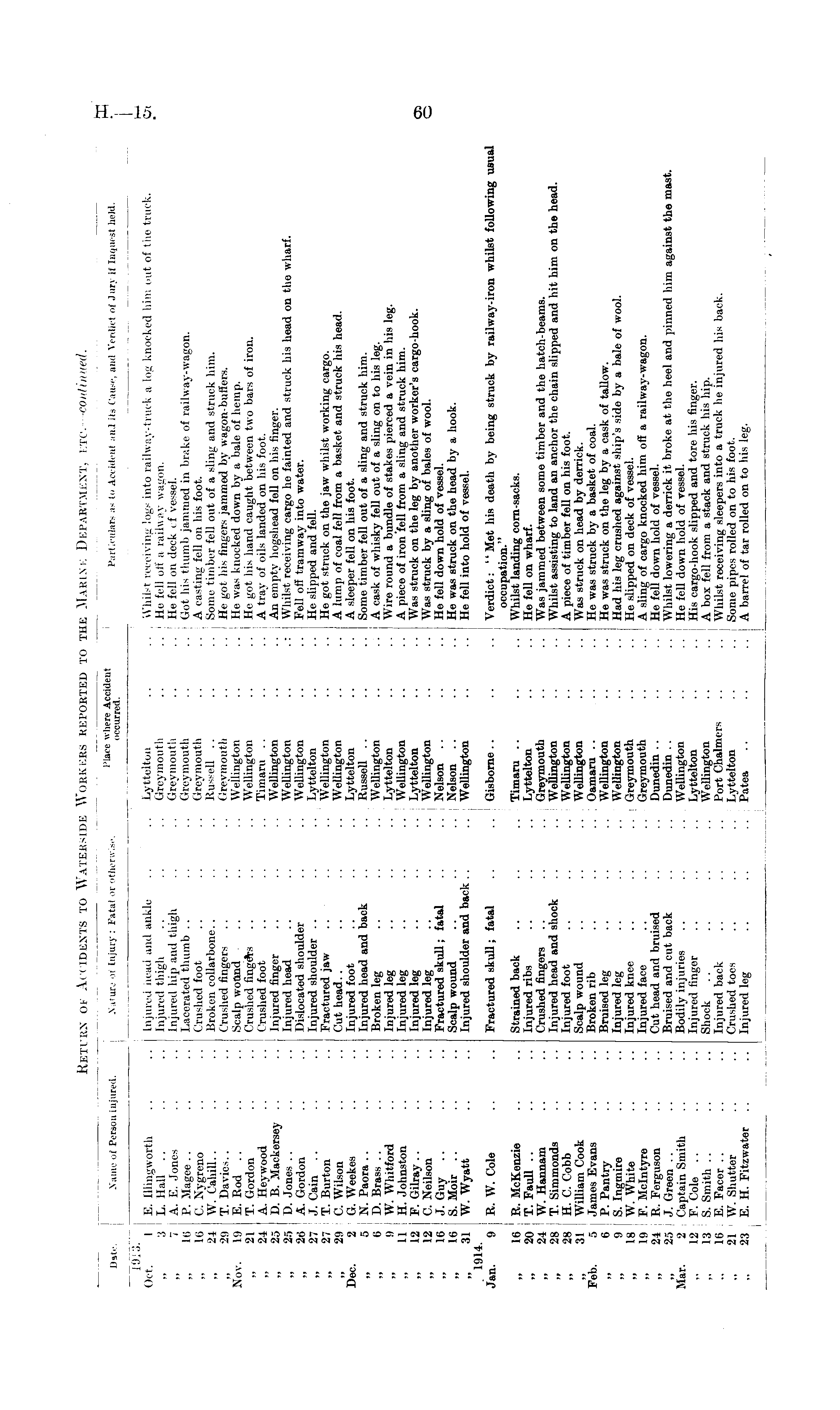 ,ce where Accii occurred. .cut Date. Name of Person injured. Nature of Injury : Fatal or otbenrise. Particulars as to Accident and its Cause, and Verdict of Jury if Inquest held. 19.13. Oct. 1 E. Illingworth 3 L. Hall .. ,, 7 A. E. Jones 16 P. Magee 16 C. Nygreno 24 W. Cahill.. 29 T. Davies. . Nov. 19 E. Rod .. „ 21 T. Gordon 24 A. Heywood ,, 2r> D. B. Mackersey .. „ 25 D. Jones .. „ 2(i A. Gordon 27 J. Cain 27 T. Burton 29 C. Wilson Dec. 2 G. Weekes ,, 5 N. Paora .. 9 W. Whitford ,, 11 H. Johnston 12 P. Gilray 12 C. Neilson 16 J. Guy .. „ 16 S. Moir 31 W. Wyatt 1914. Jan. 9 R. W. Cole Injured liead and ankle Injured thigh Injured hip and thigh Lacerated thumb .. Crushed foot Broken collarbone Crushed fingers Scalp wound Crushed fingeVs ('rushed foot Injured finger Injured head Dislocated shoulder Injured shoulder Fractured jaw Cut head.. Injured foot Injured head and back Broken leg Injured leg Injured leg Injured leg Injured leg Fractured skull; fatal Scalp wound Injured shoulder and back .. Lytteltoii Greymouth Greymouth (Ircymouth Greymouth .. Russell .. Greymouth Wellington Wellington Timaru .. Wellington Wellington Wellington Lyttelton Wellington Wellington Lyttelton Russell . . Wellington Lyttelton Wellington Lyttelton Wellington Nelson Nelson Wellington Whilst receiving logs into railway-truck a log knocked him out of the truck. He fell off a railway wagon. He fell on deck < { \ < Got his thumb jammed in brake of railway-wagon. A easting fell on his foot. Some timber fell out of a sling and struck him. He got his lingers jammed by wagon-buifer>. He was knocked down by a bale of hemp. He got his hand caught between two bars of iron. A tray of oils landed on his foot. An empty hogshead fell on his linger. Whilst receiving cargo he fainted and struck his head on the wharf. Fell off tramway into water. He slipped and fell. He got struck on the jaw whilst working cargo. A lump of coal fell from a basket and struck his head. A sleeper fell on his foot. Some timber fell out of a sling and struck him. A cask of whisky fell out of a sling on to his leg. Wire round a bundle of stakes pierced a vein in his leg. A piece of iron fell from a sling and struck him. Was struck on the leg by another worker's cargo-hook. Was struck by a sling of bales of wool. He fell down hold of vessel. He was struck on the head by a hook. He fell into hold of vessel. „ 16 R. McKenzie 20 T. Faull 24 W. Hannam „ 28 ; T. Simmonds 28 H. C. Cobb 31 William Cook Feb. 5 James Evans 6 P. Pantry „ 9 S. Ingmire 18 W. White 19 F. Mclntyre „ 24 R. Ferguson „ 25 J. Green Mar. 2 Captain Smith 12 F. Cole .. 13 S. Smith 16 E. Facer 21 W. Shutter 23 E. H. Fitzwater .. Fractured skull; fatal Strained back Injured ribs Crushed fingers Injured head and shook Injured foot Scalp wound Broken rib Bruised leg Injured leg Injured knee Injured face Cut head and bruised Bruised and cut back Bodily injuries Injured fingor Shock .. Injured back Crushed toes Injured leg Gisborne.. Timaru .. Lyttelton Greymouth Wellington Wellington Wellington Oamaru .. Wellington Wellington Greymouth Greymouth Dunedin . . Dunedin .. Wellington Lyttelton Wellington Port Chalmers Lyttelton . . Patea • • i Verdict: '' Met his death by being struck by railway-iron whilst following usui occupation." Whilst landing corn-sacks. He fell on wharf. Was jammed between some timber and the hatch-beams. Whilst assisting to land an anchor the chain slipped and hit him on the head. A piece of timber fell on his foot. Was struck on head by derrick. He was struck by a basket of coal. He was struck on the leg by a cask of tallow. Had his leg crushed against ship's side by a bale of wool. He slipped on deck of vessel. A sling of cargo knocked him off a railway-wagon. He fell down hold of vessel. Whilst lowering a derrick it broke at the heel and pinned him against the mast. He fell down hold of vessel. His cargo-hook slipped and tore his finger. A box fell from a stack and struck his hip. Whilst receiving sleepers into a truck he injured his back. Some pipes rolled on to his foot. A barrel of tar rolled on to his leg.