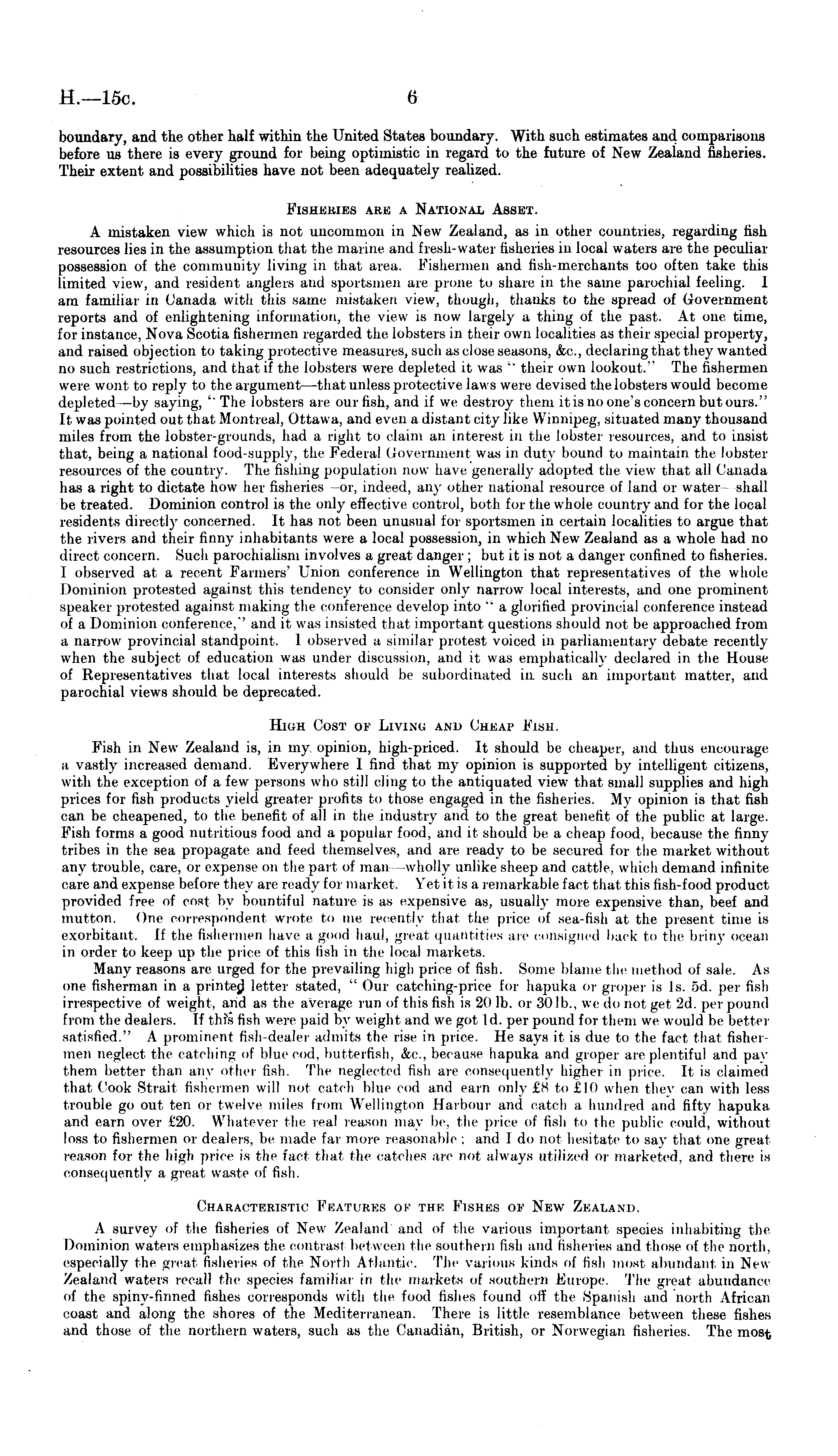boundary, and the other half within the United States boundary. With such estimates and comparisons before us there is every ground for being optimistic in regard to the future of New Zealand fisheries. Their extent and possibilities have not been adequately realized. Fisheries are a National Asset. A mistaken view which is not uncommon in New Zealand, as in other countries, regarding fish resources lies in the assumption that the marine and Eresh-water fisheries in local waters are the peculiar possession of the community living in thai area. Fishermen and fish-merchants too often take this limited view, and resident anglers and sportsmen are prone to share in the same parochial feeling. I am familiar in Canada with this same mistaken view, though, thanks to the spread of Government reports and of enlightening information, the view is now largely a thing of the past. At one time, for instance, Nova Scotia fishermen regarded the lobsters in their own localities as their special property, and raised objection to taking protective measures, such as close seasons, &c, declaring that they wanted no such restrictions, and that if the lobsters w r ere depleted it was " their own lookout." The fishermen were wont to reply to the argument —that unless protective law s were devised the lobsters would become depleted—by saving. " The lobsters are our fish, and if we destroy them it is no one's concern hut ours." It was pointed out that Mont real, Ottawa, and even a distant city like Winnipeg, situated many thousand miles from the lobster-grounds, had a right to claim an interest In the lobster resources, and to insist that, being a national food-supply, the Federal Government was in fluty bound to maintain the lobster resources of the country. The fishing population now have generally adopted the view that all Canada has a right to dictate how her fisheries or. indeed, any other national resource of land or water shall be treated. Dominion control is the only effective control, both for the whole country and for the local residents directly concerned. It has not been unusual lor sportsmen in certain localities to argue that the rivers and their finny inhabitants were a local possession, in which New Zealand as a whole had no direct concern. Such parochialism involves a great danger: but it is not a danger confined to fisheries. I observed at a recent Farmers" Union conference in Wellington that representatives of the whole Dominion protested against this tendency to consider only narrow local interests, and one prominent speaker protested against making the conference develop into "' a glorified provincial conference instead of a Dominion conference," and it was insisted that important questions should not be approached from a narrow provincial standpoint. 1 observed a similar protest voiced in parliamentary debate recently when the subject of education was under discussion, and it was emphatically declared in the House of Representatives that local interests should be subordinated in such an important matter, and parochial views should be deprecated. Higb Cost' ok Living and Cheap Fish. Fish in New Zealand is. in my opinion, high-priced. It should he cheaper, and thus encourage a vastly increased demand. Everywhere I find that my opinion is supported by intelligent citizens, with the exception of a few persons who still cling to the antiquated view that small supplies and high prices for fish products yield greater profits to those engaged in the fisheries. My opinion is that fish can be cheapened, to the benefit of all in lie' industry and to the great benefit of the public at large. Fish forms a good nutritious food and a popular food, and it should be a cheap food, because the finny tribes in the sea propagate and feed themselves, and are ready to be secured lor the market without any trouble, care, or expense on the part of man wholly unlike sheep and cattle, which demand infinite care and expense before they are ready for market. Yet it is a remarkable fact that this fish-food product provided free of cost by bountiful nature is as expensive as, usually more expensive than, beef and mutton. One correspondent wrote to me recently that the price of sea-fish at the present time is exorbitant. If the fishermen have a good haul, great quantities ate consigned back to the briny ocean in order to keep up the price of this iish in the local markets. Many reasons are urged lor the prevailing high price of lish. Some blame the method of sale. As one fisherman in a printed letter stated, " Our catching-price for hapuka Or groper is Is. sd. per lish irrespective of weight, and as the average run of this lish is 20 lb. or 30 lb., we do not get 2d. per pound from the dealers. If this lish v ere paid by weight and we got Id. per pound for t hem we would be better satisfied." A prominent fish-dealer admits the rise in price. He says it is due to the fact that fishermen neglect the catching of blue cod. buttorlish. &c.. because hapuka and groper are plentiful and pay them better than any other fish. The neglected fish are consequently higher in price. It is claimed that Cook Strait fishermen will not catch blue end and earn only £8 to £10 when they can with less trouble go out ten or twelve miles from Wellington Harbour and catch a hundred and fifty hapuka and earn over t2O. Whatever the real reason may he. the price of lish to the public could, without loss to fishermen or dealers, be made far more reasonable : and I do not hesitate to say that one great reason lor the high price is the fact that the catches are not always utilized or marketed, and there is consequently a great waste of fish. Characteristic Features of the Pishes of New Zealand. A survey of the fisheries of New Zealand and of the various important species inhabiting the Dominion waters emphasizes the contrast bet w cell the SOUI hern iish and fisheries and t hose of the north. especially the great fisheries of the North Atlantic. The 