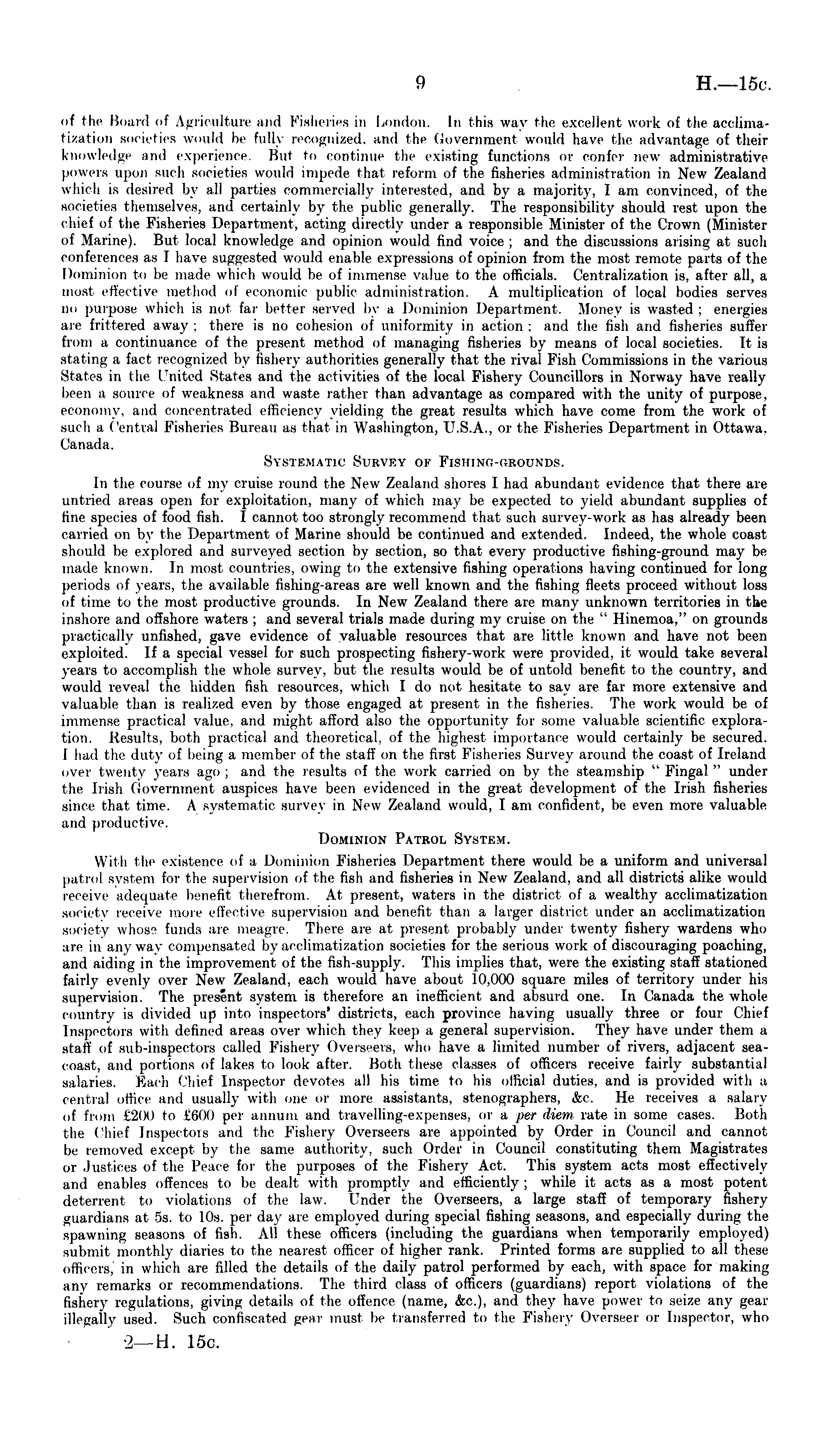 of the Board of Agriculture and Fisheries in London. In this way the excellent work of the acclimatization societies would be fully recognized, and the Government would have the advantage of their knowledge and experience. Hut to continue the existing functions or confer new administrative powers upon such societies would impede that reform of the fisheries administration in New Zealand which is desired by all parlies commercially interested, and by a majority, 1 am convinced, of the societies themselves, and certainly by the public generally. The responsibility should rest upon the chief of the Fisheries Department, acting directly under a responsible Minister of the Crown (Minister of Marine). But local knowledge and opinion would find voice; and the discussions arising at such conferences as I have suggested would enable expressions of opinion from the most remote parts of the Dominion to be made which would be of immense value to the officials. Centralization is, after all, a most effective method of economic public administration. A multiplication of local bodies serves no purpose which is not far better served by a Dominion Department. Money is wasted; energies are frittered away: there is no cohesion of uniformity in action: and the fish and fisheries suffer from a continuance of the present method of managing fisheries by means of local societies. It is stating a fact recognized by fishery authorities generally that the rival Fish Commissions in the various States in I he United States and the activities of the local Fishery Councillors in Norway have really been a source of weakness and waste rather than advantage as compared with the unity of purpose, economy, and concentrated efficiency yielding the great results which have come from the work of such a Central Fisheries Bureau as that in Washington, U.S.A., or the Fisheries Department in Ottawa. (lanada. Systematic Survey of Fishing-grounds. In the course of my cruise round the New Zealand shores I had abundant evidence that there are untried areas open for exploitation, many of which may be expected to yield abundant supplies of fine species of food fish. I cannot too strongly recommend that such survey-work as has already been carried on by the Department of Marine should be continued and extended. Indeed, the whole coast should be explored and surveyed section by section, so that every productive fishing-ground may be made known. In most countries, owing to the extensive fishing operations having continued for long periods of years, the available fishing-areas are well known and the fishing fleets proceed without loss of time to the most productive grounds. In New Zealand there are many unknown territories in the inshore and offshore waters ; and several trials made during my cruise on the " Hinemoa," on grounds practically unfished, gave evidence of valuable resources that are little known and have not been exploited. If a special vessel for such prospecting fishery-work were provided, it would take several years to accomplish the whole survey, but the results would be of untold benefit to the country, and would reveal the hidden fish resources, which I do not hesitate to say are far more extensive and valuable than is realized even by those engaged at present in the fisheries. The work would be of immense practical value, and might afford also the opportunity for some valuable scientific exploration. Results, both practical and theoretical, of the highest importance would certainly be secured. I had the duty of being a member of the staff on the first Fisheries Survey around the coast of Ireland over twenty years ago ; and the results of the work carried on by the steamship " Fingal " under the Irish Government auspices have been evidenced in the great development of the Irish fisheries since that time. A systematic survey in New Zealand would, lam confident, be even more valuable and productive. Dominion Patrol System. With the existence of a Dominion Fisheries Department there would be a uniform and universal patrol system for the supervision of I he fish and fisheries in New Zealand, and all districts alike would receive adequate benefit therefrom. At present, waters in the district of a wealthy acclimatization society receive more effective supervision and benefit than a larger district under an acclimatization society whose funds are meagre. There are at present probably under twenty fishery wardens who are in an\ way compensated by acclimatization societies for the serious work of discouraging poaching, and aiding in the improvement of the fish-supply. This implies that, were the existing staff stationed fairly evenly over New Zealand, each would have about 10,000 square miles of territory under his supervision. The present system is therefore an inefficient and absurd one. In Canada the whole country is divided up into inspectors' districts, each province having usually three or four Chief Inspectors with defined areas over which they keep a general supervision. They have under them a staff of sub-inspectors called Fishery Overseers, who have a limited number of rivers, adjacent seacoast, and portions of lakes to look after. Both these classes of officers receive fairly substantial salaries. Each Chief Inspector devotes all his time to his official duties, and is provided with a central office and usually with one or more assistants, stenographers, &C. He receives a salary of from £200 to £600 per annum and travelling-expenses, or a per diem rate in some cases. Both the Chief Inspectors and. the Fishery Overseers are appointed by Order in Council and cannot be removed except by the same authority, such Order in Council constituting them Magistrates or Justices of the Peace for the purposes of the Fishery Act. This system acts most effectively and enables offences to be dealt with promptly and efficiently; while it acts as a most potent deterrent to violations of the law. Under the Overseers, a large staff of temp