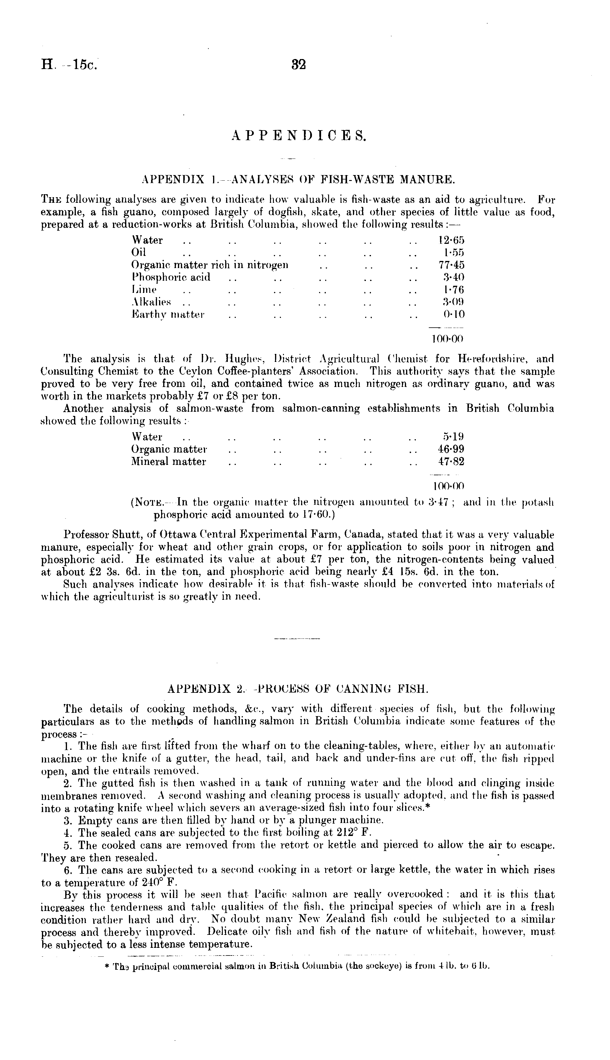 APPENDICES. APPENDIX I. ANALYSES OF FISH-WASTE MANURE. The following analyses are given to indicate how valuable is fish-waste as an aid to agriculture. For example, a fish guano, composed largely of dogfish, skate, and other species of little value as food, prepared at a reduction-works at British Columbia, showed the following results:— Water .. .. .. .. .. .. 12-65 Oil .. .. .. .. .. .. 1-55 Organic matter rich in nitrogen .. .. .. 77-45 Phosphoric acid . . . . . . . . . . '■'>■ It) Lime .. .. .. .. .. .. 1-76 Alkalies .. .. .. .. .. .. .".■(HI Earthy matter .. .. .. . . . . 0-10 100-00 The analysis is that of Dr. Hughes. District Agricultural Chemist for Herefordshire, and Consulting Chemist to the Ceylon Coffee-planters' Association. This authority says that the sample proved to be very free from oil, and contained twice as much nitrogen as ordinary guano, and was worth in the markets probably £7 or £8 per ton. Another analysis of salmon-waste from salmon-canning establishments in British Columbia showed the following results : Water .. .. .. .. .. .. 5-Hi Organic matter . . . . .. .. .. 46-99 Mineral matter .. .. .. .. .. 47-82 100-mi (Note. In the organic matter the nitrogen amounted to -i- i 7 : and in the potash phosphoric acid amounted to 17-tiO.) Professor Shutt, of Ottawa Central Experimental Farm, Canada, stated that it was a very valuable manure, especially for wheat and other grain crops, or for application to soils poor in nitrogen and phosphoric acid. He estimated its value at about £7 per ton, the nitrogen-contents being valued at about £2 3s. 6d. in the ton, and phosphoric acid being nearly £4 15s. 6d. in the ton. Such analyses indicate how desirable it is that lish-waste should be converted into materials of which the agriculturist is so greatly in need.