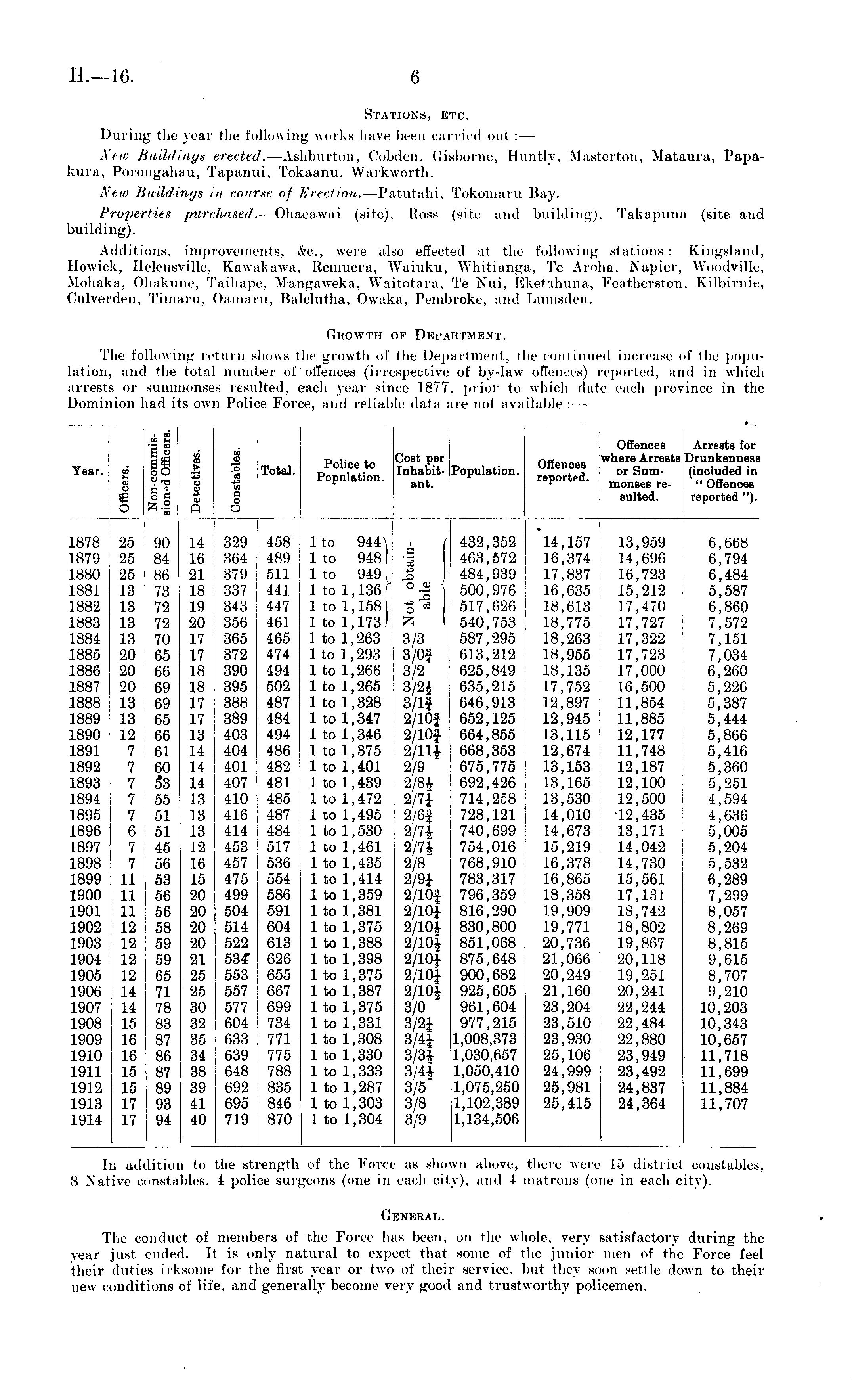 Stations, etc. During the year the following works have been carried out : — New Buildings erected. —Ashburton, Cobden, Gisborne, Huntly. Masterton, Mataura, Papakura, Porongahau, Tapanui, Tokaanu, Warkworth. New Buildings in course of Eviction. —Patutahi, Tokomaru Bay. Properties purchased. —Ohaeawai (site), Ross (site and building), Takapuna (site ami building). Additions, improvements, etc., were also effected at the following stations : Kingsland, Howick, Belensville, Kawakawa, Remuera, Waiuku, Whitianga, To Aroha, Napier, Woodville, Mohaka, Ohakune, Taihape, Mangaweka, Waitotara, Te Nui, Eketahuna, Featherston, Kilbirnie, Culverden, Timaru, Oamaru, Balclutha, Owaka, Pembroke, and Lumsden. Gkowth of Department. The following return shows the growth of the Department. I he continued increase of the population, and the total number of offences (irrespective of by-law offences) reported, and in which arrests or summonses resulted, each year since 1877, prior to which date each province in the Dominion had its own Police force, and reliable data are not available :—