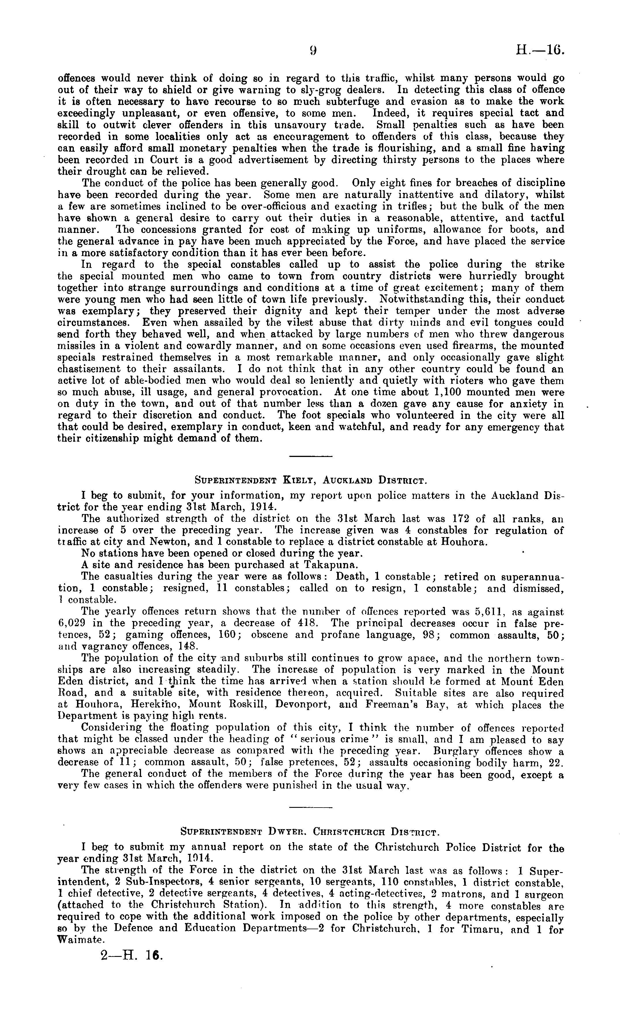 Superintendent Dwyer. Christchurch District. I beg to submit my annual report on the state of the Christchurch Police District for the year ending 31st March, 1014. The strength of the Force in the district on the 31st March last was as follows : 1 Superintendent, 2 Sub-Inspectors, 4 senior sergeants, 10 sergeants, 110 constables, 1 district constable, 1 chief detective, 2 detective sergeants, 4 detectives, 4 acting-detectives, 2 matrons, and 1 surgeon (attached to the Christchurch Station). In addition to this strength, 4 more constables are required to cope with the additional work imposed on the police by other departments, especially so by the Defence and Education Departments—2 for Christchurch, 1 for Timaru, and 1 for Waimate.