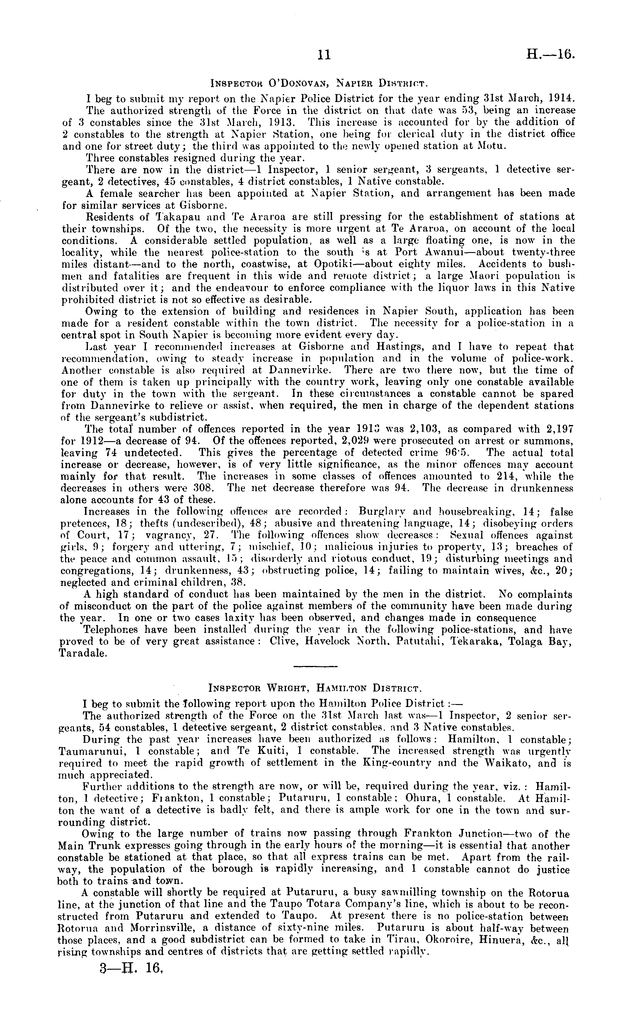 Inspector O'Donovan, Napier District. I beg to submit my report on the Napier Police District for the year ending 31st March, 1914. The authorized strength of the Force in the district on that date was 53, being an increase of .'I constables since the 31st March, 1913. This increase is accounted for by the addition of 2 constables to the strength at Napier Station, one being for clerical duty in the district office and one for street duty; the third was appointed to the newly opened station at Motu. Three constables resigned during the year. There are now in the district —1 Inspector, 1 senior sergeant, 3 sergeants. 1 detective sergeant, 2 detectives, 45 constables, 4 district constables, 1 Native constable. A female searcher has been appointed at Napier Station, and arrangement has been made for similar services at Gisborne. Residents of Takapau and Te Araroa are still pressing for the establishment of stations at their townships. Of the two, tin' necessity is more urgent at Te Araroa. on account of the local conditions. A considerable settled population, as well as a large floating one, is now in the locality, while the nearest police-station to the south ; s at Port Awanui—about twenty-three miles distant—and to the north, coastwise, at Opotiki—about eighty miles. Accidents to bushmen and fatalities are frequent in this wide ami remote district; a large Maori population is distributed over it; and the endeavour to enforce compliance with the liquor laws in this Native prohibited district is not so effective as desirable. Owing to the extension of building and residences in Napier South, application has been made for a resident constable within the town district. The necessity for a police-station in a central spot in South Napier is becoming more evident every day. Last year 1 recommended increases at Gisborne and Hastings, ami 1 have to repeat that recommendation, owing to steady increase in population am! in the volume of police-work. Another constable is also required at D.mnevirke. There are two there now, but the time of one of them is taken up principally with the country work, leaving only one constable available for duty in the town with the sergeant. In these circumstances a constable cannot be spared from Dannevirke to relieve or assist, when required, the men in charge of the dependent stations of the sergeant's subdistrict. The total' number of offences reported in the year 191.", was 2,103, as compared with 2,197 for 1912—a decrease of 94. Of the offences reported, 2,029 were prosecuted on arrest or summons, l< aving 74 undetected. This gives the percentage of detected crime 965. The actual total increase or decrease, however, is of very little significance, as the minor offences may account mainly for that result. The increases in some classes of offences amounted to 214, while the decreases in others were 308. The net decrease therefore was 94. The decrease in drunkenness alone accounts for 43 of these. Increases in the following offences are recorded: Burglary and housebreaking, 14; false pretences, 18; thefts (undescribed), 48; abusive and threatening language, 14; disobeying orders of Court, 17; vagrancy. 27. The following offences show decreases: Sexual offences against girls, 9; forgery and uttering, 7; mischief. 10; malicious injuries to property, 13; breaches of the peace and common assault, 15; disorderly and riotous conduct, 19; disturbing meetings and congregations, 14; drunkenness, 43; obstructing police, 14; failing to maintain wives, &c, 20; neglected and criminal children. 38. A high standard of conduct has been maintained by the men in the district. No complaints of misconduct on the part of the police against members of the community have been made during the year. In one or two cases laxity has been observed, and changes made in consequence Telephones have been installed during the year in the following police-stations, and have proved to be of very great assistance : Clive, Havelock North, Patutahi. Tekaraka, Tolaga Bay, Taradale.