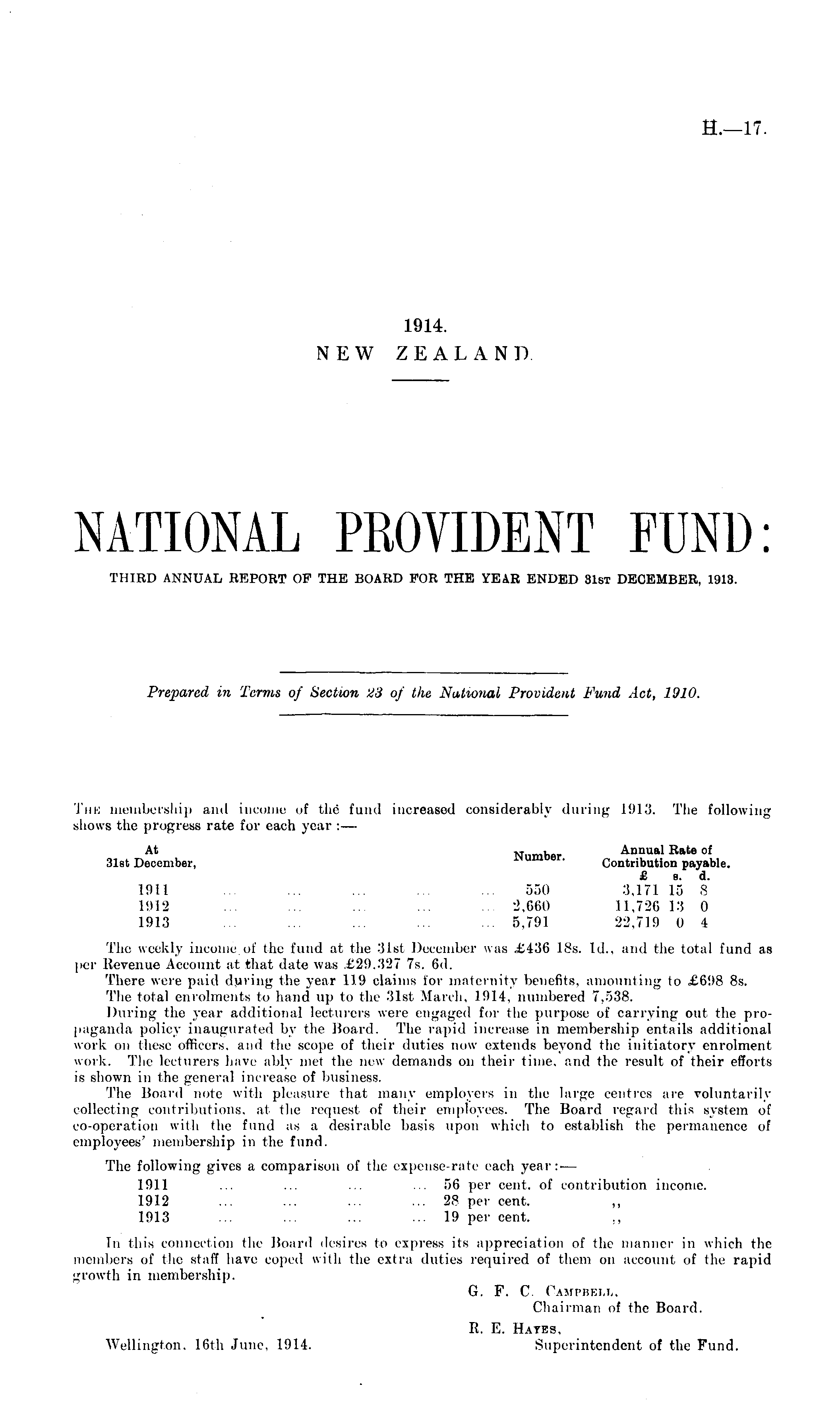Tin; membership and income of the fund increased considerably during 1913. The following shows the progress rate for each year :— At Number Annual Rate of 31st December, ' Contribution payable. £ s. d. 191 I ... ... ... ... ... 550 3.171 15 8 1912 ... ... ... ... ... 2,660 11.726 13 0 1913 ... ... ... ... ... 5,791 22,719 0 4 The weekly income of the fund at the 31st December was £436 18s. Id., and the total fund as per Revenue Account at that date was ,£29.327 7s. 6d. There were paid during the year 119 claims for maternity benefits, amounting to £698 Bs. The total enrolments to hand up to the 31st March, 1914, numbered 7,538. During the year additional lecturers were engaged for the purpose of carrying out the propaganda policy inaugurated by the Board. The rapid increase in membership entails additional work on these officers, and the scope of their duties now extends beyond the initiatory enrolment work. The lecturers have ably met the new demands on their time, and the result of their efforts is shown in the general increase of business. The Board note with pleasure that many employers in the large centres are voluntarily collecting contributions, at the request of their employees. The Board regard this system of co-operation with the fund as a desirable basis upon which to establish the permanence of employees' membership in the fund. The following gives a comparison of the expense-rate each year;.— 1911 ... ... ... ... 56 per cent, of contribution income. 1912 ... ... ... ... 28 per cent. 1913 ... ... ... ... 19 per cent. ~ In this connection the Board desires to express its appreciation of the manner in which the members of the staff have coiied with the extra duties required of them on account of the rapid growth in membership. G. F. C. Campbell. Chairman of the Board. R. E. Hates, Wellington. 16th June, 1914. Superintendent of the Fund.